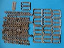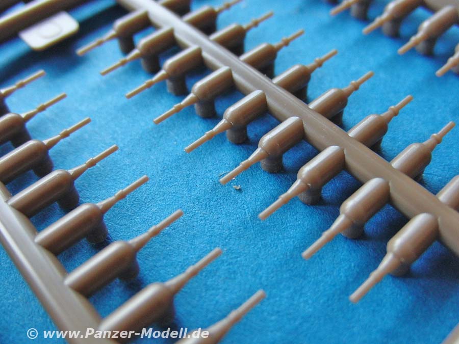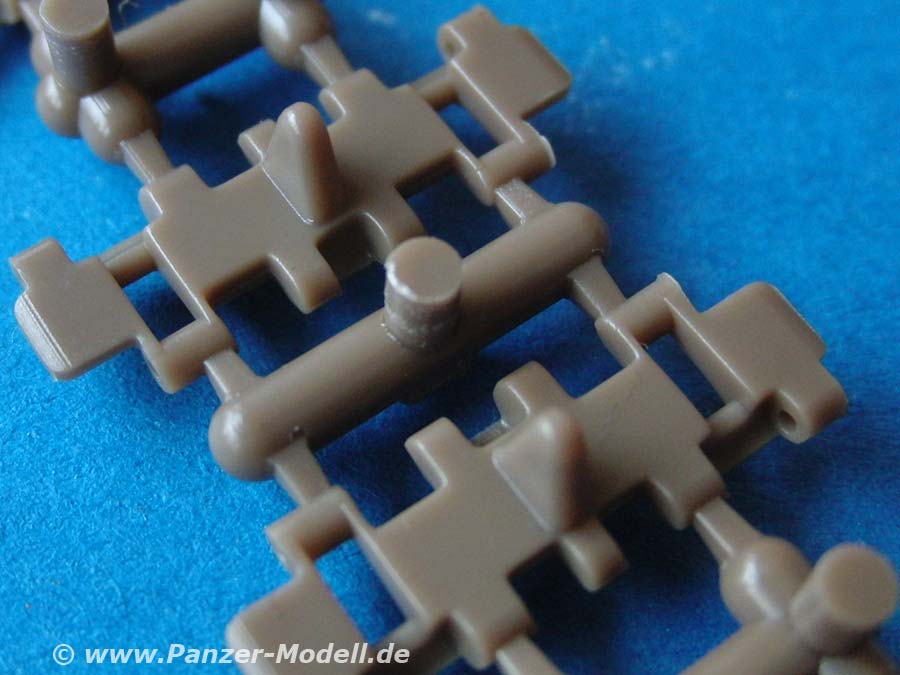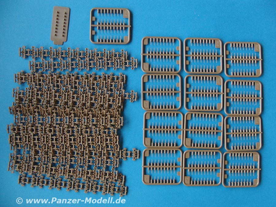 Der Bausatz besteht aus 13 Spritzrahmen mit den Kettenbolzen, 20 Spritzsträngen mit den 240 Einzelkettengliedern und eine Zusammenbauhilfe. Auf dieser werden bis zu 8 Kettenglieder aufgelegt und dann mit jeweils 2 Kettenbolzen zusammengesteckt. Damit bleibt die Kette beweglich.