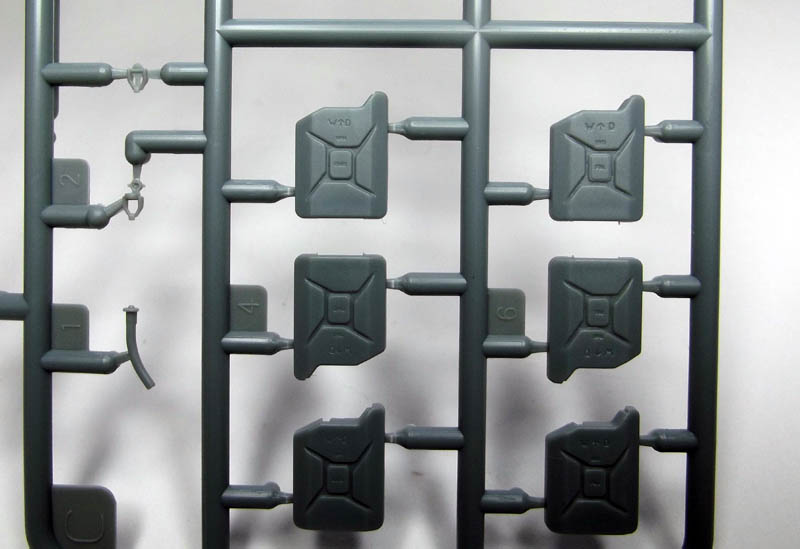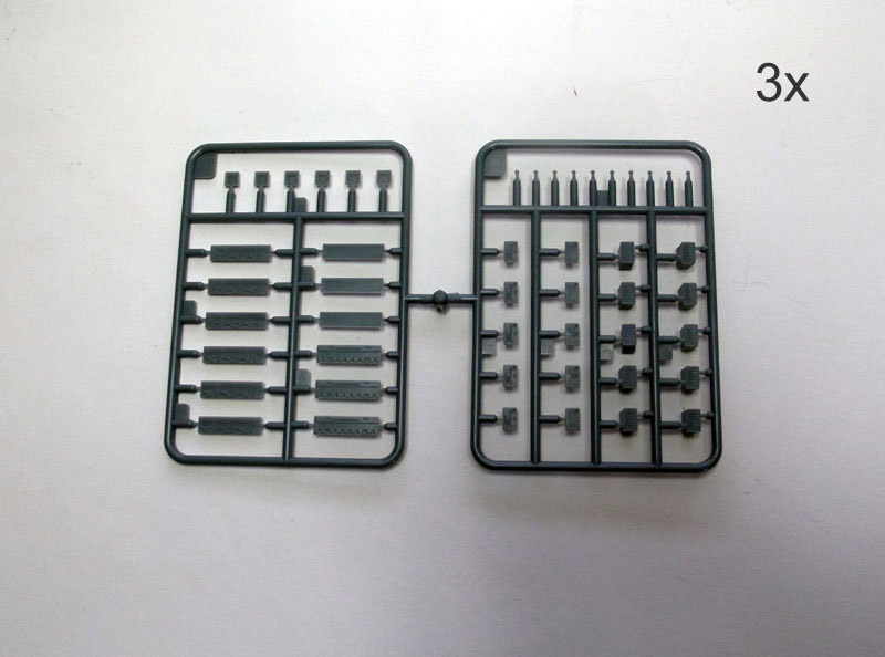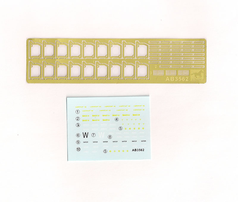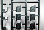 Eine feines Zubehörset für britische Fahrzeugmodelle oder Figuren in 1:35 ist von Bronco mit der Art. Nr. AB3562 im Handel erschienen. Der Bausatz enthält 12 Spritzgussrahmen, jeweils die Rahmen A, B, C und D... und zwar jeweils 3x. Dazu kommt noch ein kleines Set mit Photoätzteilen und ein Decalsheet. Enthalten sind Metallkanister für Wasser, Kraftstoff und Öl. Darüber hinaus finden sich Eimer, Spaten, Äxte, Spitzhacken und vieles mehr. Munitionsbehälter fehlen natürlich auch nicht. Als besonderer Gag liegen auch mehrere Kaffeebecher bei. Ach, halt, wir sind ja bei den Briten. Daher sind es wohl eher Teebecher. Als Bau- und Bemalungsanleitung dient die Rückseite der Verpackung Besonders begeistert bin ich von den feinen Details der Bauteile. Egal ob man nun mit diesem Set ein Fahrzeug ausrüsten möchte, mit etwas Zubehör mehr Leben in ein Diorama bringen möchte oder ein paar Figuren in Szene setzen will, mit diesem Set ist man auf jeden Fall gut bedient. Insgesamt gesehen bekommt man hier für ca. 16,- EUR ein tolles Zubehörset. Prädikat: Sehr empfehlenswert.