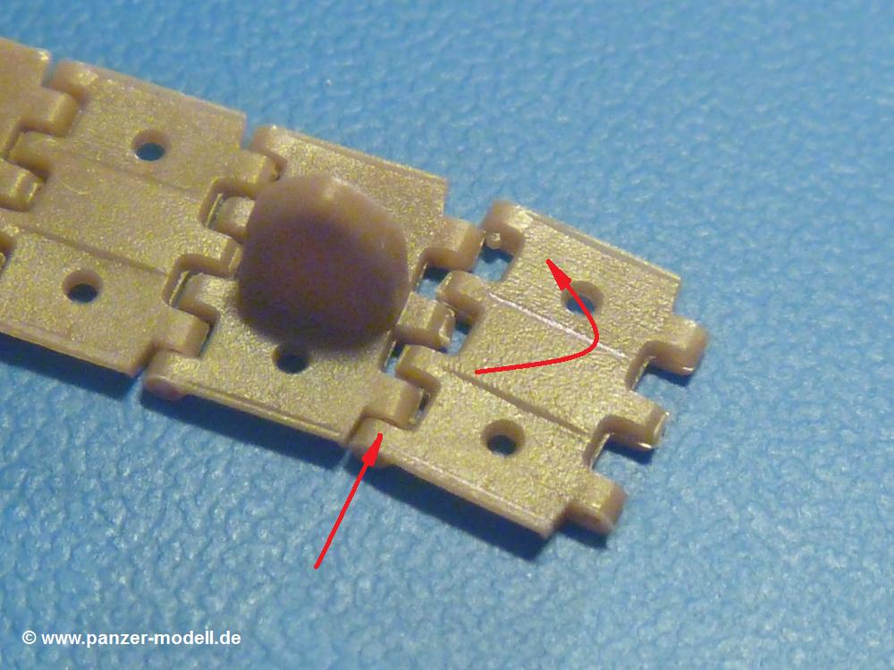Gemäß Anleitung schiebt man abwechselnd ein Kettenglied mit und eins ohne gleichmäßig ineinander, aber mit dieser Methode habe ich gleich mal 2 Bolzen abgeschert. Einfacher und sicherer ist es da, einen Bolzen in ein Loch einzusetzen und mit einer "runden" Bewegung (siehe Foto) den zweiten Bolzen einzuklipsen. Das Ganze geht ohne Klebstoff vonstatten, auch wenn die Bauanleitung an anderer Stelle sagt, dass man sparsam mit Klebstoff umgehen soll. Die Kette bleibt voll beweglich.