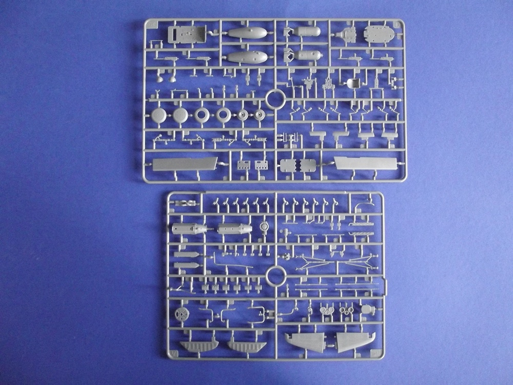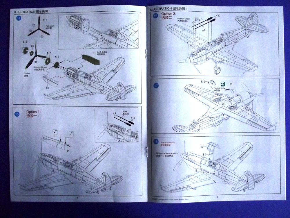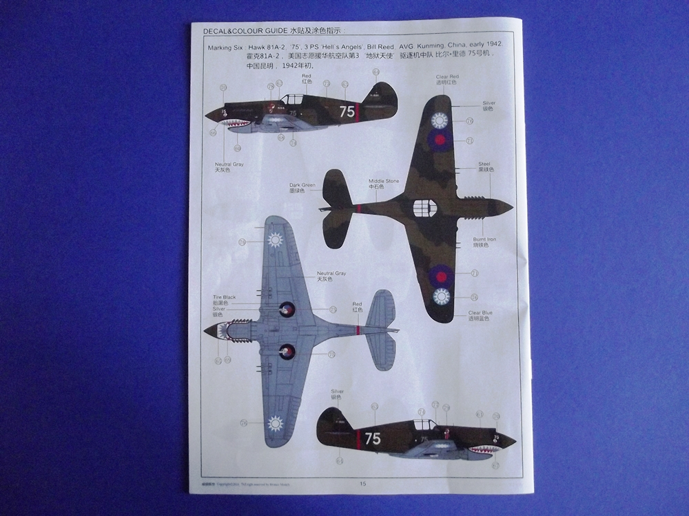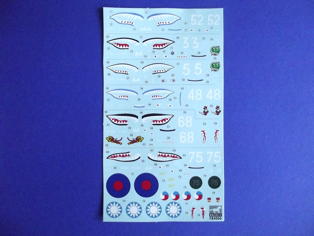 Der Bausatz besteht aus vier Spritzrahmen in hellgrauem Plastik, einem Spritzrahmen mit Klarsichtteilen für die Kanzel, einer kleinen Platine mit PE-Teilen und einem sehr umfangreichen Decalsheet. Der Bausatz lässt den Bau / die Markierung von sechs verschiedenen Varianten zu und bietet auch viele Optionen. Das Fahrwerk kann aus- oder eingefahren montiert werden, die Triebwerkabdeckung kann offen oder geschlossen dargestellt werden, es liegen verschiedene Bord-MG bei die wahlweise / optional montiert werden können, die Kanzel kann offen, geschlossen und dazu noch beweglich gestaltet werden. Die Bauanleitung gliedert sich in insgesamt 19 Baustufen. Die Zeichnungen wirken übersichtlich und eindeutig. Innerhalb der einzelnen Stufen finden sich Hinweise für die Detailbemalung einzelner Bauteile oder Baugruppen. Die Bemalungsanleitung zeigt die sechs möglichen Varianten aus den Jahren 1941 und 1942 jeweils in einer farbigen Vier-Seiten-Ansicht. Die Unterschiede liegen hier aber nur in den Markierungen, der Tarnanstrich ist bei allen gezeigten Flugzeugen gleich. Die Fertigungsqualität liegt, wie bei Bronco üblich, auf sehr hohem Niveau. Feinste Oberflächendetails und absolut sauber und scharfkantig ausgeführte Bauteile versprechen reichlich Bastelvergnügen. Einzelne Baugruppen bestehen auch nicht, wie man das sonst von Bronco kennt, aus etlichen Einzelteilen. Die Zahl der Bauteile für die Komplettierung einer Baugruppe hält sich in Grenzen, lediglich dem Triebwerk widmet die Bauanleitung immerhin vier Baustufen. Aber dafür erhält man am Ende auch einen echten Hingucker! Der absolute Knüller in diesem Bausatz ist jedoch ein beiliegender Aufnäher, im Format von annähernd DIN A4, wie ihn die Angehörigen der `Flying Tigers` auf dem Rücken ihrer Einsatzkleidung getragen haben. Dass es sich hierbei nicht um einen Originalaufnäher sondern um ein, auf „alt“ getrimmtes Replikat handelt brauche ich wohl nicht zu erwähnen. Und da kommt einem doch auch gleich die Idee wie man das fertige Modell optisch ansprechend in der Vitrine präsentieren könnte… Ein schöner Bilderrahmen mit eingelegtem Aufnäher und darauf steht dann das Flugzeug. Dürfte mit Sicherheit sehr gut aussehen. Zwei dieser Aufnäher finden sich auch auf dem Decalsheet wieder (Decal Nr. 80). Mit diesen Decals könnte man Pilotenfiguren dekorieren. Leider liegen dem Bausatz keine Figuren bei. Insgesamt gesehen ein toller Bausatz mit schönen Details und netten Features. Kein Modell für den blutigen Anfänger. Etwas Modellbauerfahrung muss schon vorhanden sein. Der Kaufpreis in Deutschland liegt bei ca. 43,- EUR. Zunächst wirkt das für so ein kleines Modell in 1:48 recht heftig, aber der Bausatzinhalt rechtfertigt den Preis.