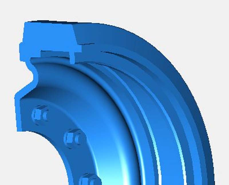 Der 3D Druck macht hier ausgezeichnete Arbeit und feine Details, die sensationell sind. Das Querschnittsbild kann ein wenig vermitteln, wie die Felge gewölbt, mit Versteifungsrippen und Schraubenmuttern versehen ist. In dieser Art mit Hinterschnitt in dieser feinen Detaillierung für Resinguss unmöglich - daher hier als 3D Druckerergebnis ideal. Dabei muss man vermerken, dass das Druckergebnis absolut überzeugen kann und alle Rundungen sauber und fein und nicht im Ansatz kantig sind, wie man es von billigen Druckern kennt.
