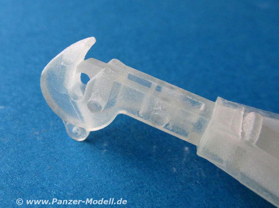Der 3D Druck macht hier ausgezeichnete Arbeit und feine Details, die sensationell sind. Das Gute am 3D Druck ist, dass der Bergehaken mit all seinen Streben und Winkeln in einem Stück produziert werden kann und das sogar ohne Angüsse. D.h. auspacken und glücklich sein. Für dieses Set benötigt man allerdings noch das M32B1 oder B3 Zubehör Set von Click2Detail.