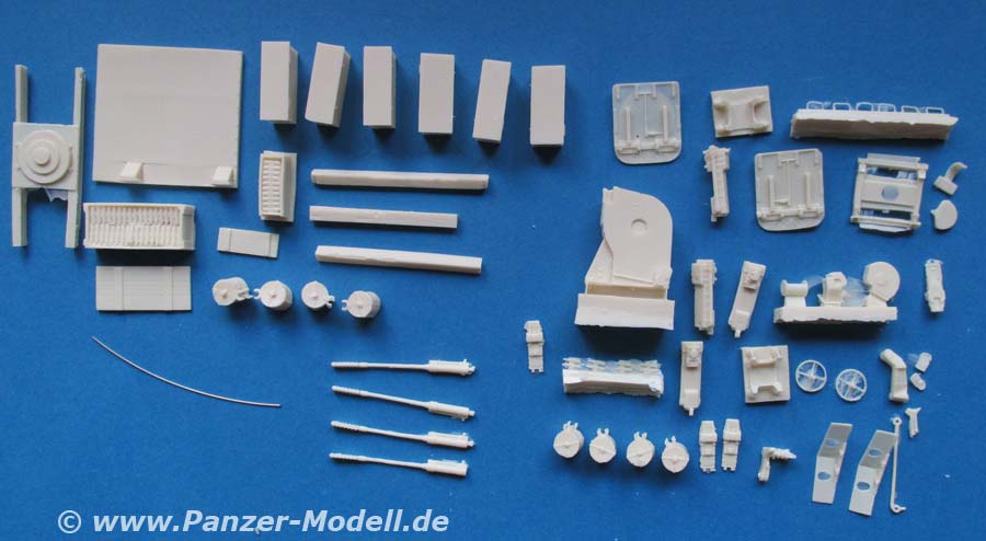 In dem Set finden sich rund 60 Resinteile zur Darstellung der 3cm Vierlingsflak auf Panzer IV als Umbausatz. Dabei basiert dieses Set auf dem ebreits erhältlichen Flakvierling mit zusätzlichen Teilen für den Ein- und Umbau auf den Panzer IV.