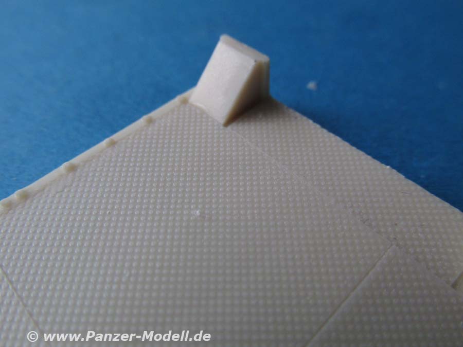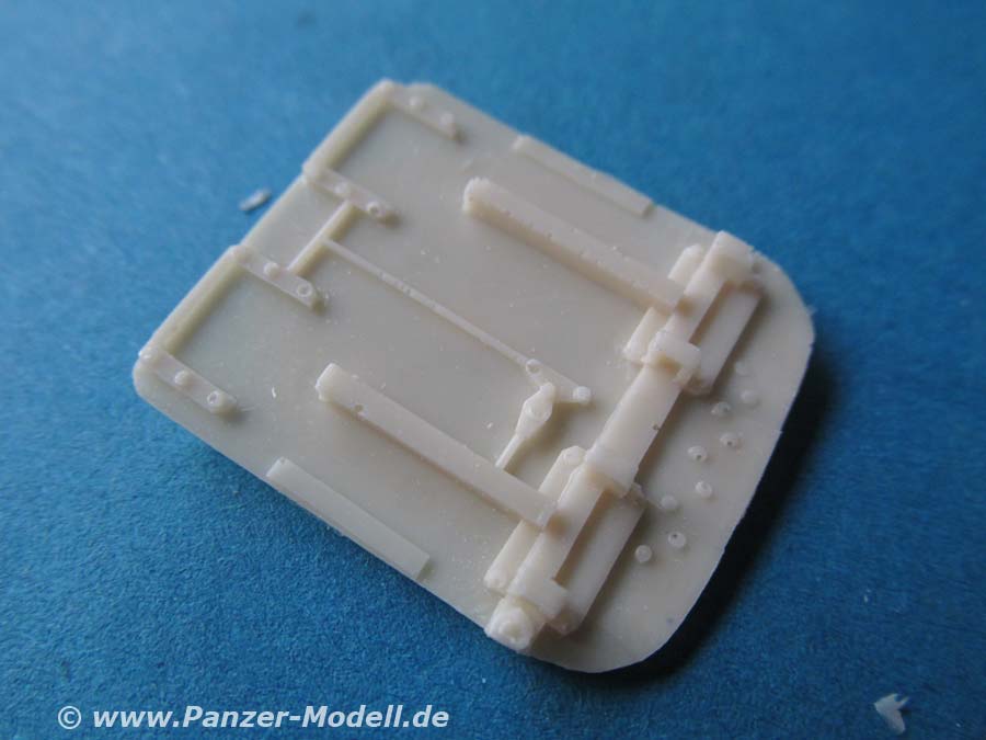 Zusätzlich liegt diesem Bausatz auch eine Bodenplatte des Innenraums bei, wie auch die Flakhalterung auf zwei trägern im Innenraum. Sehr schön gegossen und die Bodenplatte mit feinem aufgeprägtem Riffelmuster.