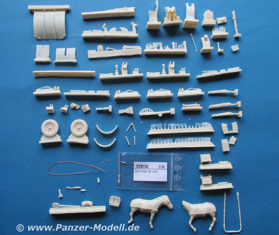 In dem Set finden sich rund 130 Resinteile, ein Metallrohr und Kupferdraht zum Bau einer 2cm Gebirgsflak auf Lafette und im Zug von einem Maultier - und es ist das Tier und nicht das Halbkettenfahrzeug gemeint.