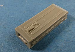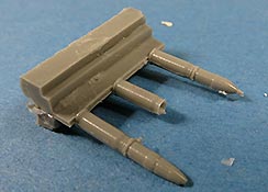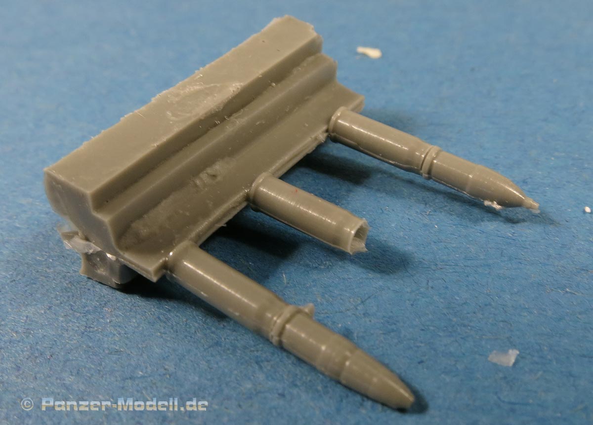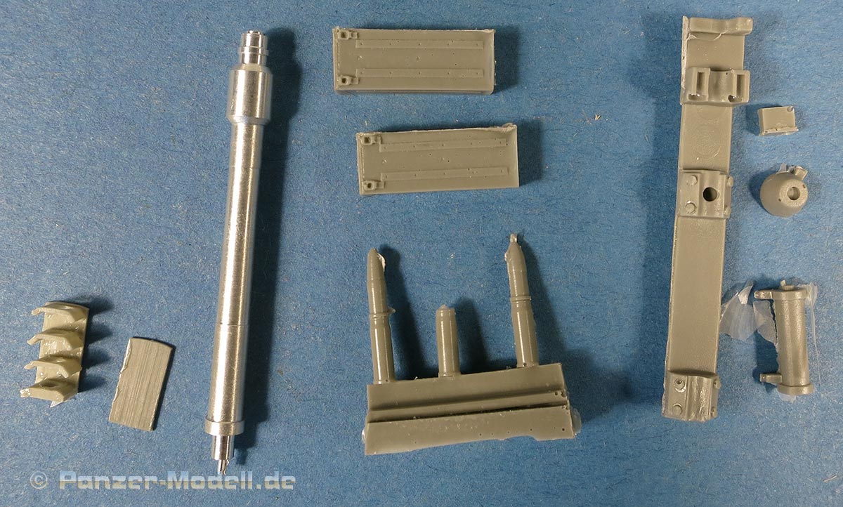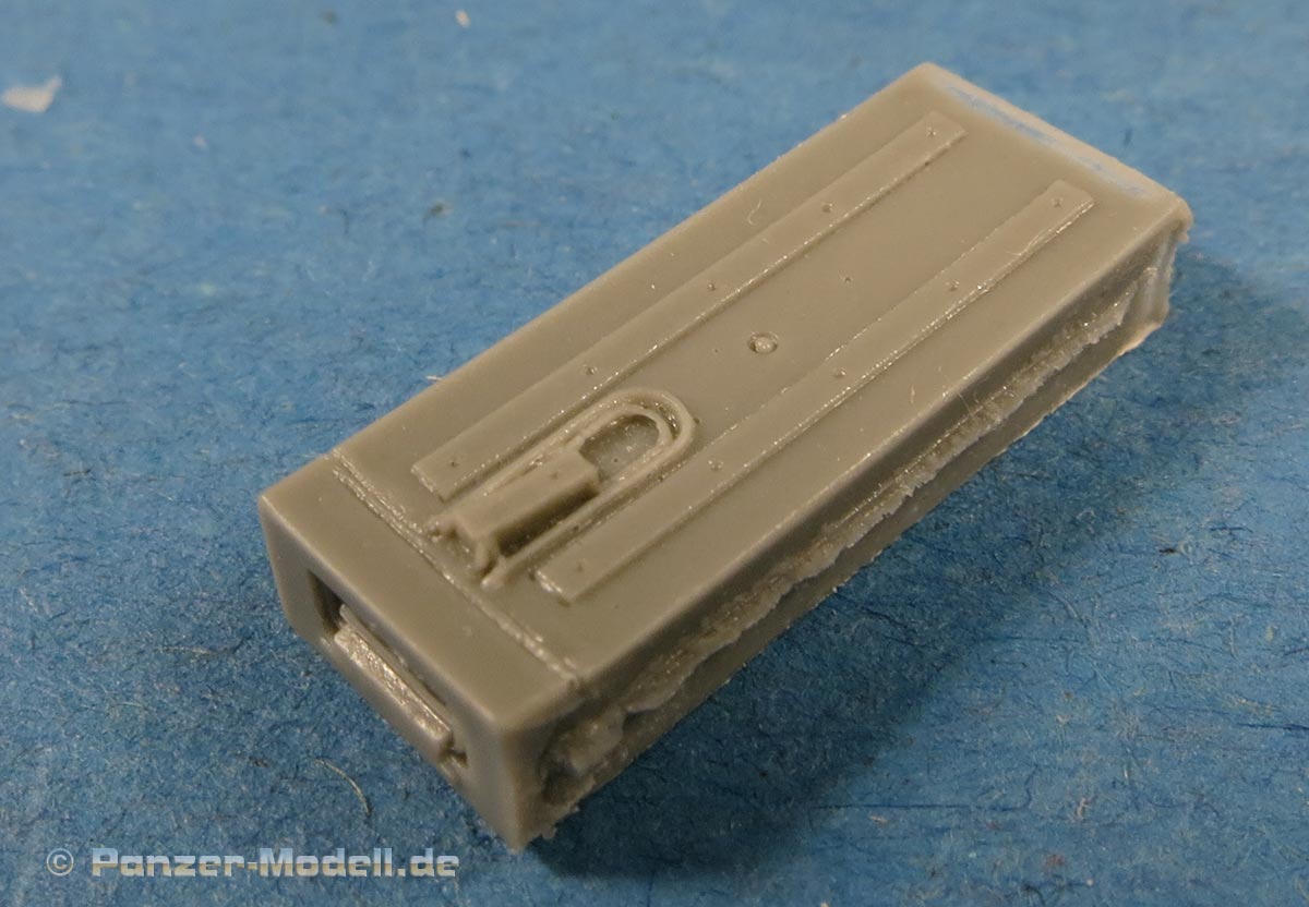 Zusätzlich und in der Bauanleitung nicht vermerkt, sind zwei Munitionskisten, sowie zwei Granaten und eine leere Hülse aus Resin.