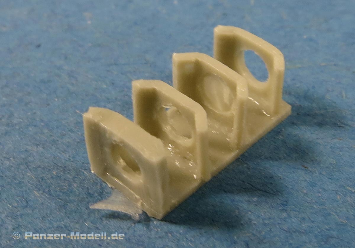 Die Resinteile sind wie gewohnt sauber und verzugsfrei gegossen. Die recht wenigen Teile sind übersichtlich und in der Hauptsache ganz ohne Anguss. Dafür finden sich hier und da ein paar Fischhäute, die aber schnell mit dem Skalpell entfernt sind. Ein paar wenige Luftbläschen habe ich diesmal an ein paar Teilen entdeckt, was ein bisschen ärgerlich aber nicht unmöglich zu beheben ist.