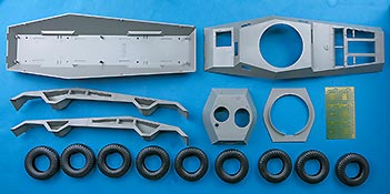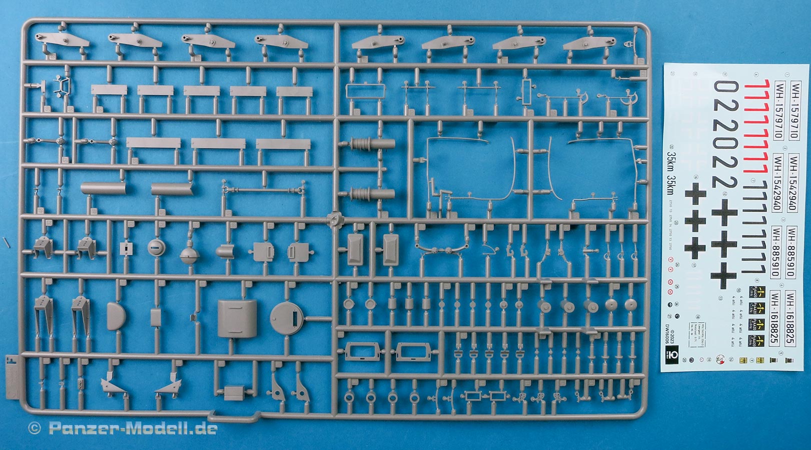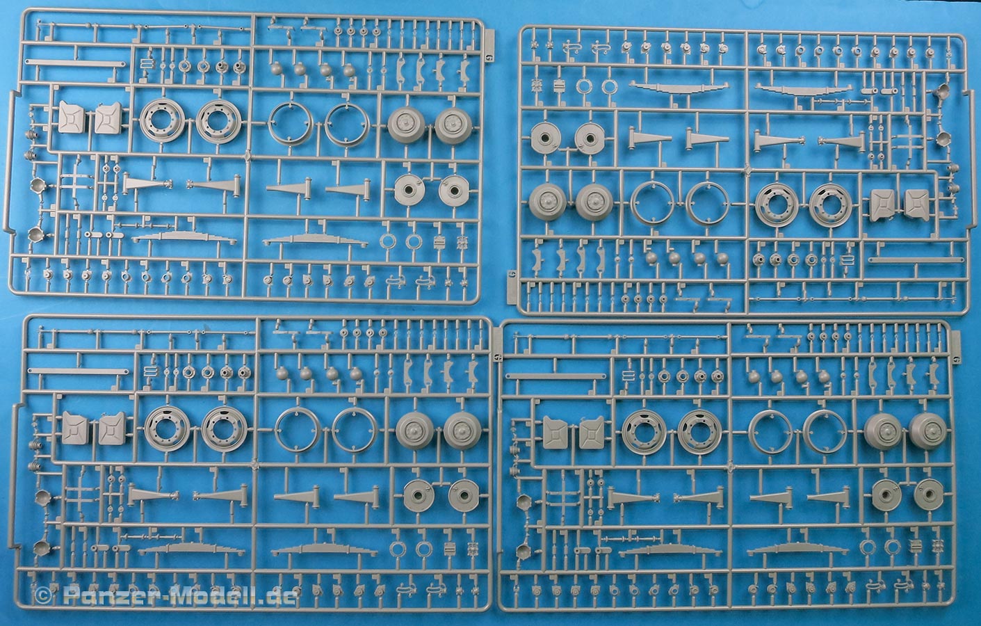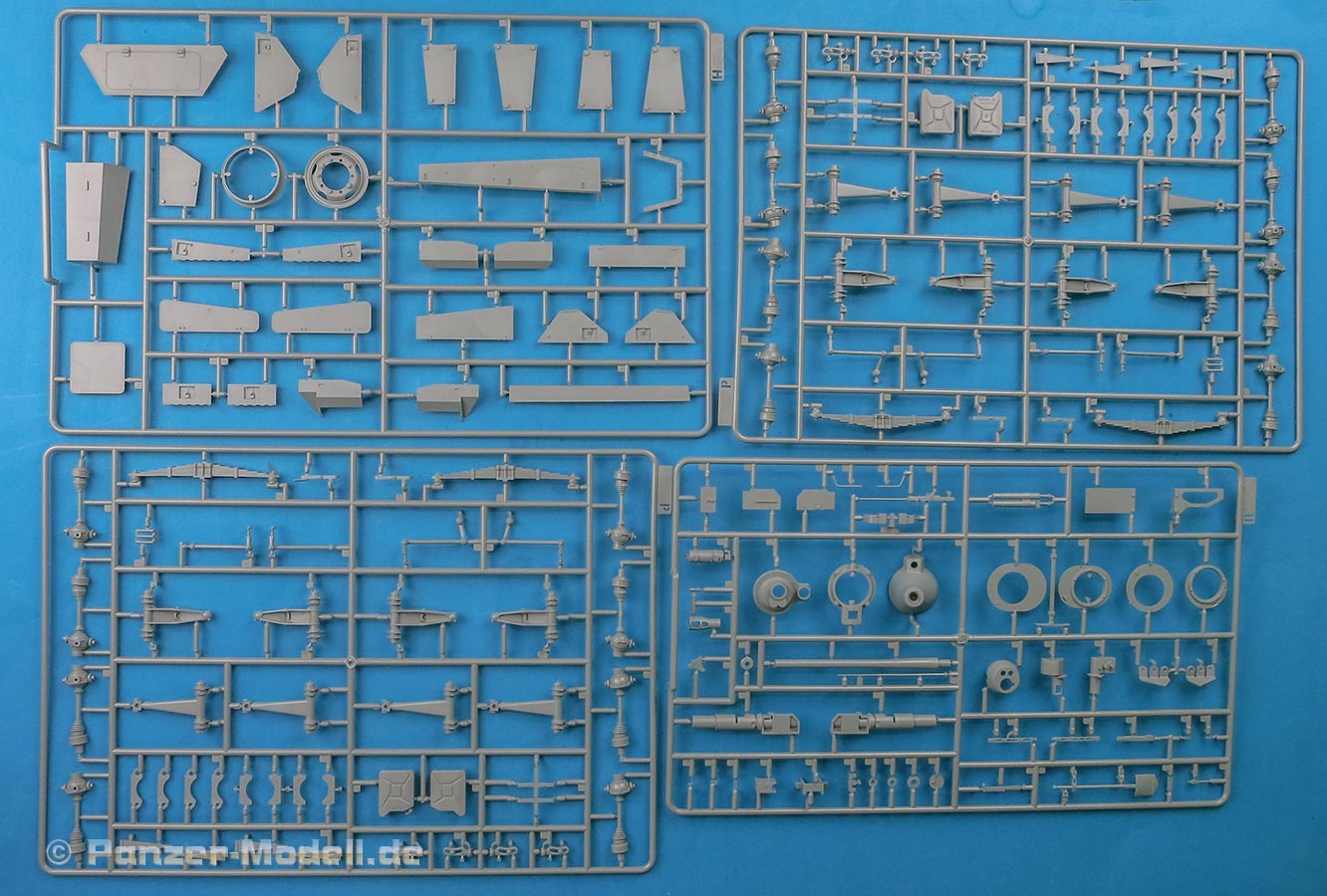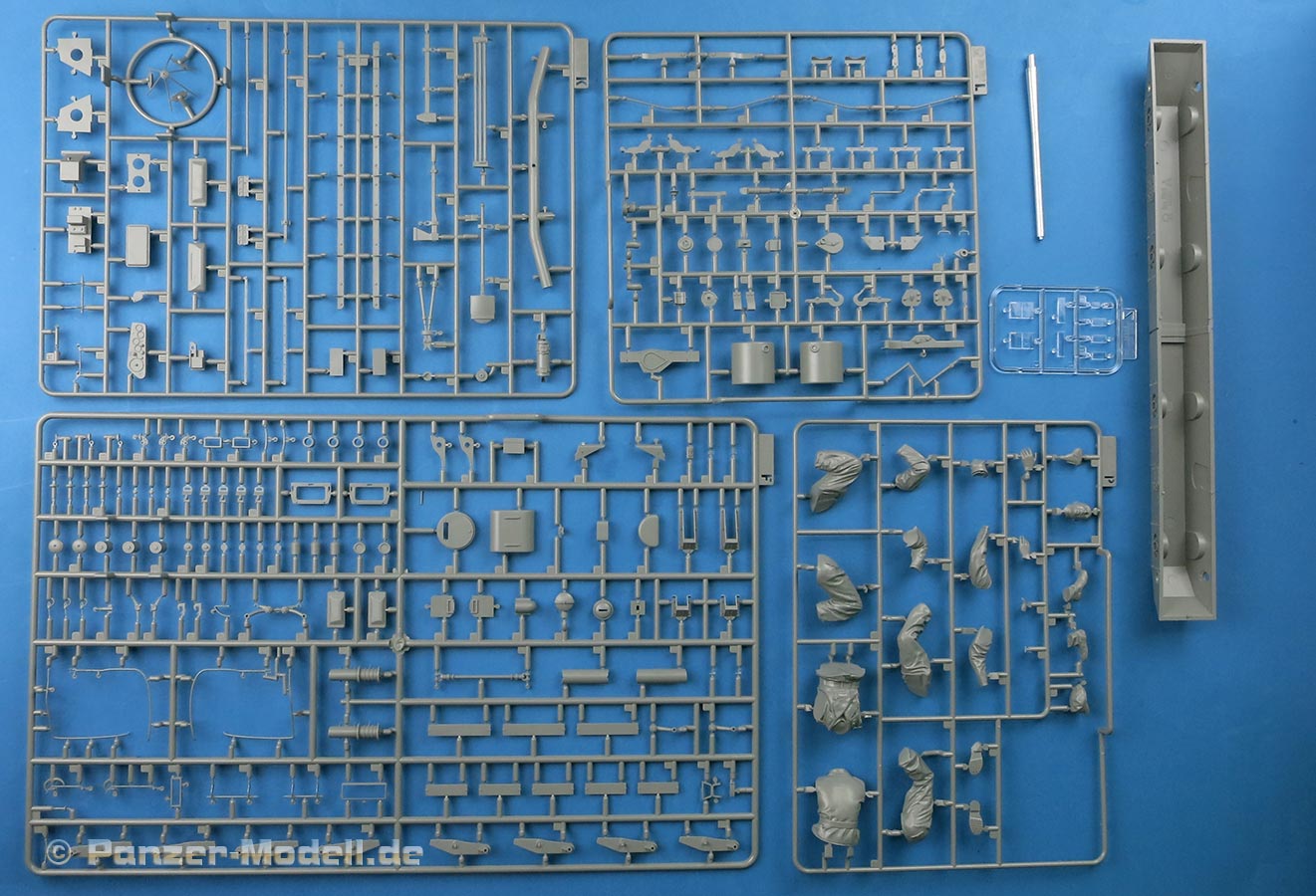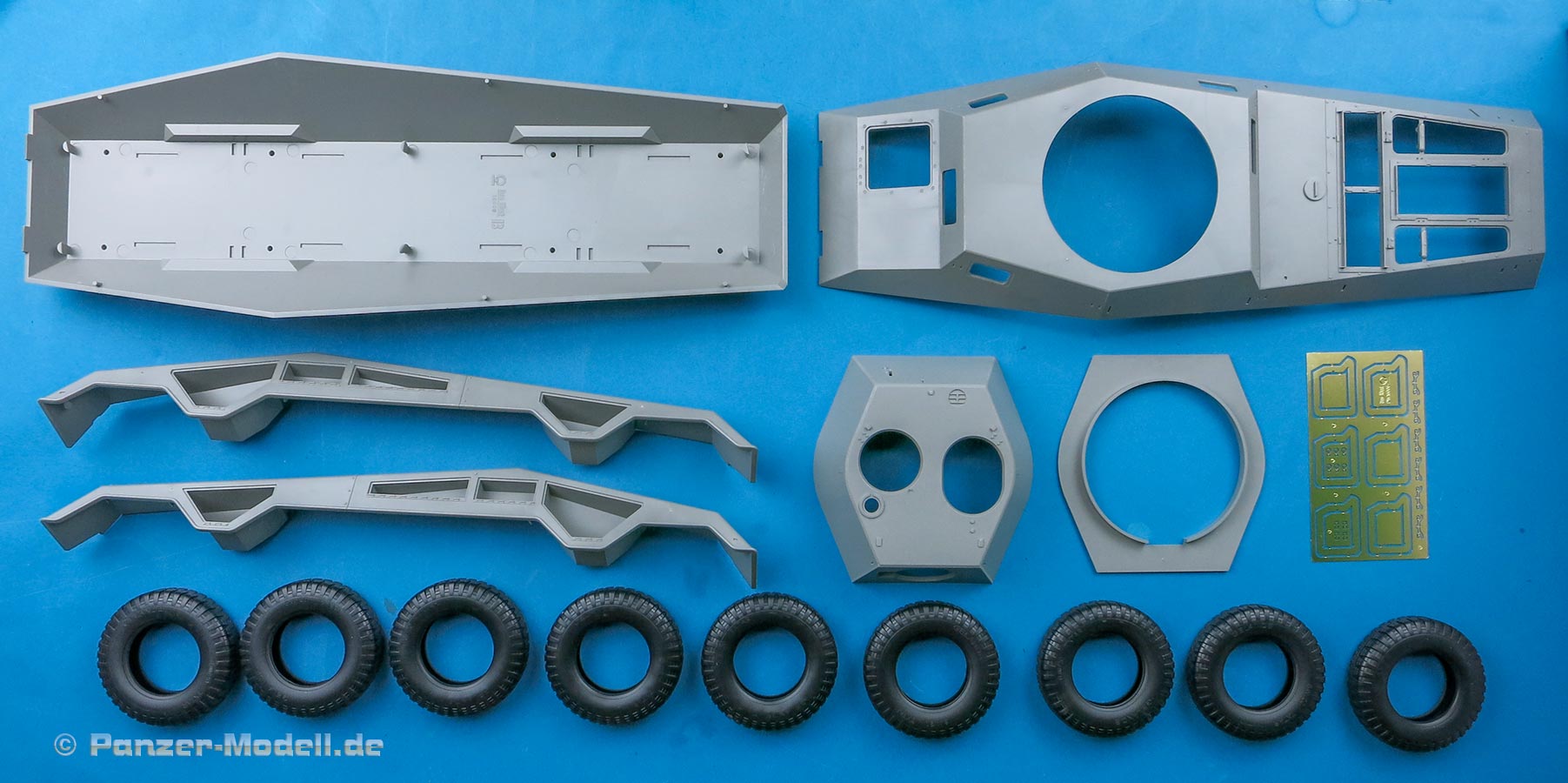 Im recht geräumigen Karton finden wir 13 graue Spritzlinge, einen Spritzling mit Klarteilen, die Unterwanne, die Oberwanne, das Turmober und -unterteil, die beiden seitlichen Staukistenanbauten, die Unterwannenabdeckung des Antriebs, 9 Vinylreifen, eine PEÂ Platine, ein Decalbogen und ein Metallrohr - letzteres ist aber nur bei der Erstauflage enthalten.