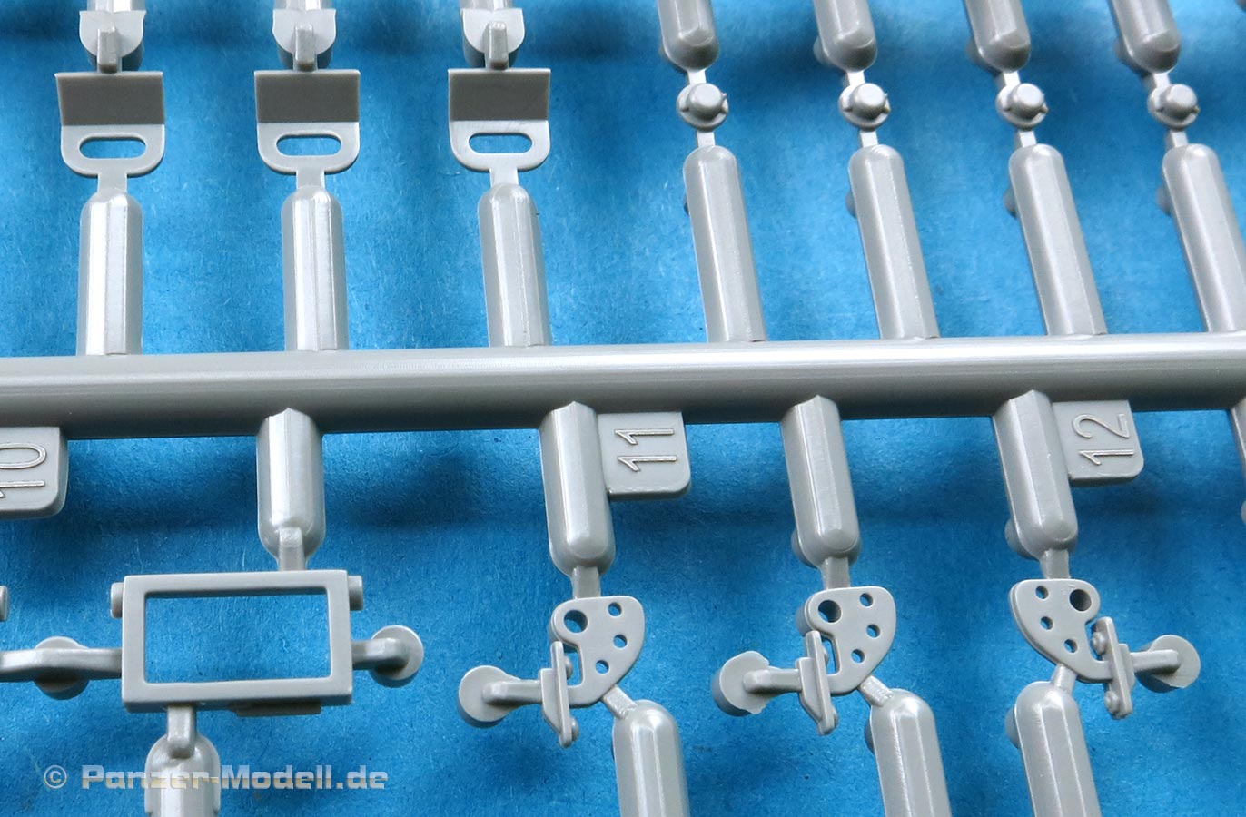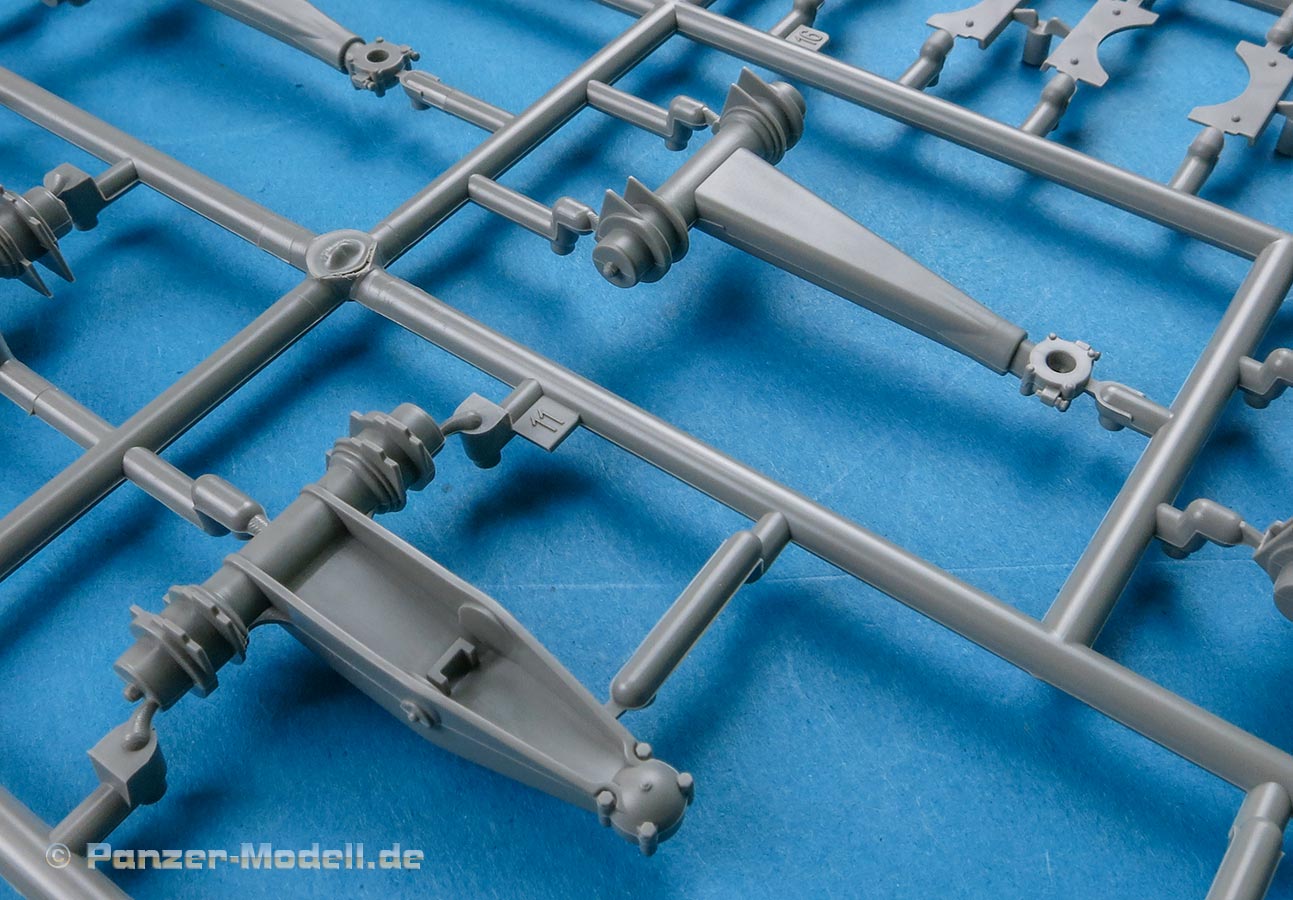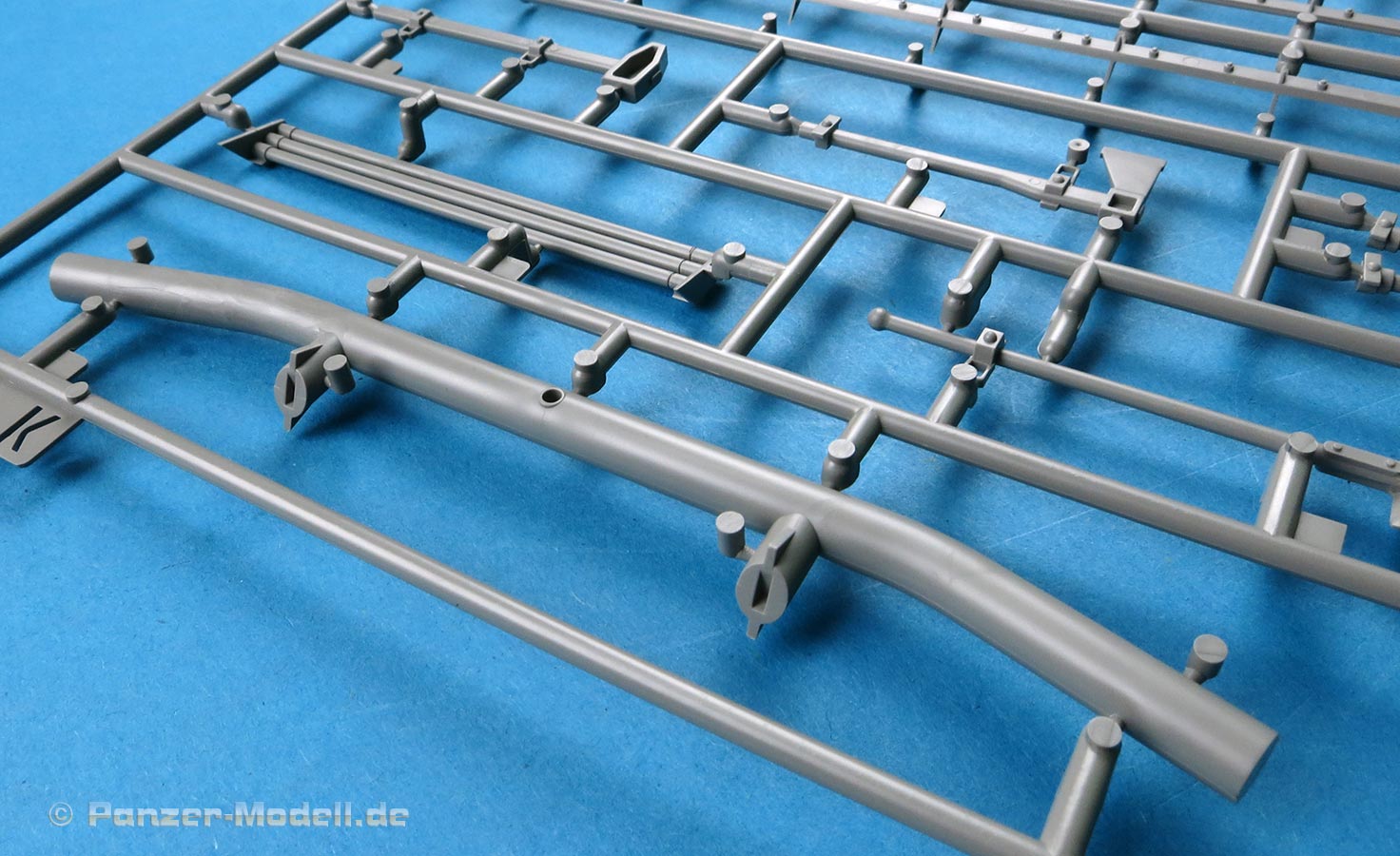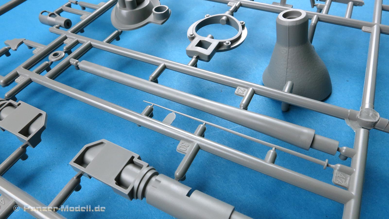 Die Gußqualität der Bauteile ist sehr gut. Alles ist sehr sauber gespritzt und frei von Sinkstellen. Versatz, Fischhäute und Grat sind ebenfalls nicht zu finden. Hier und da einige Auswerfermarken, die aber im nicht sichtbaren Bereich verschwinden. Angüsse sind ebenfalls modellbaufreundlich umgesetzt. Der Spritzguß ist auf der Höhe der Zeit.