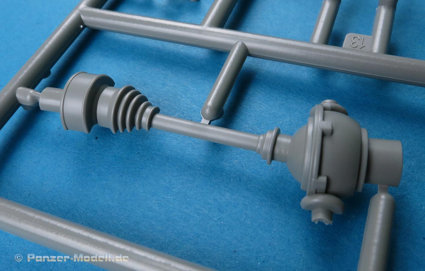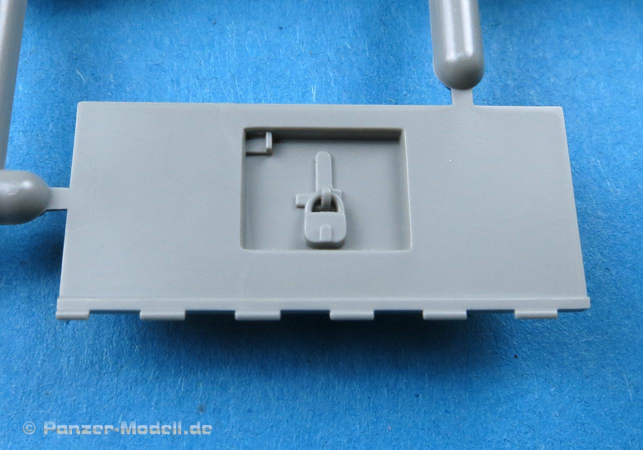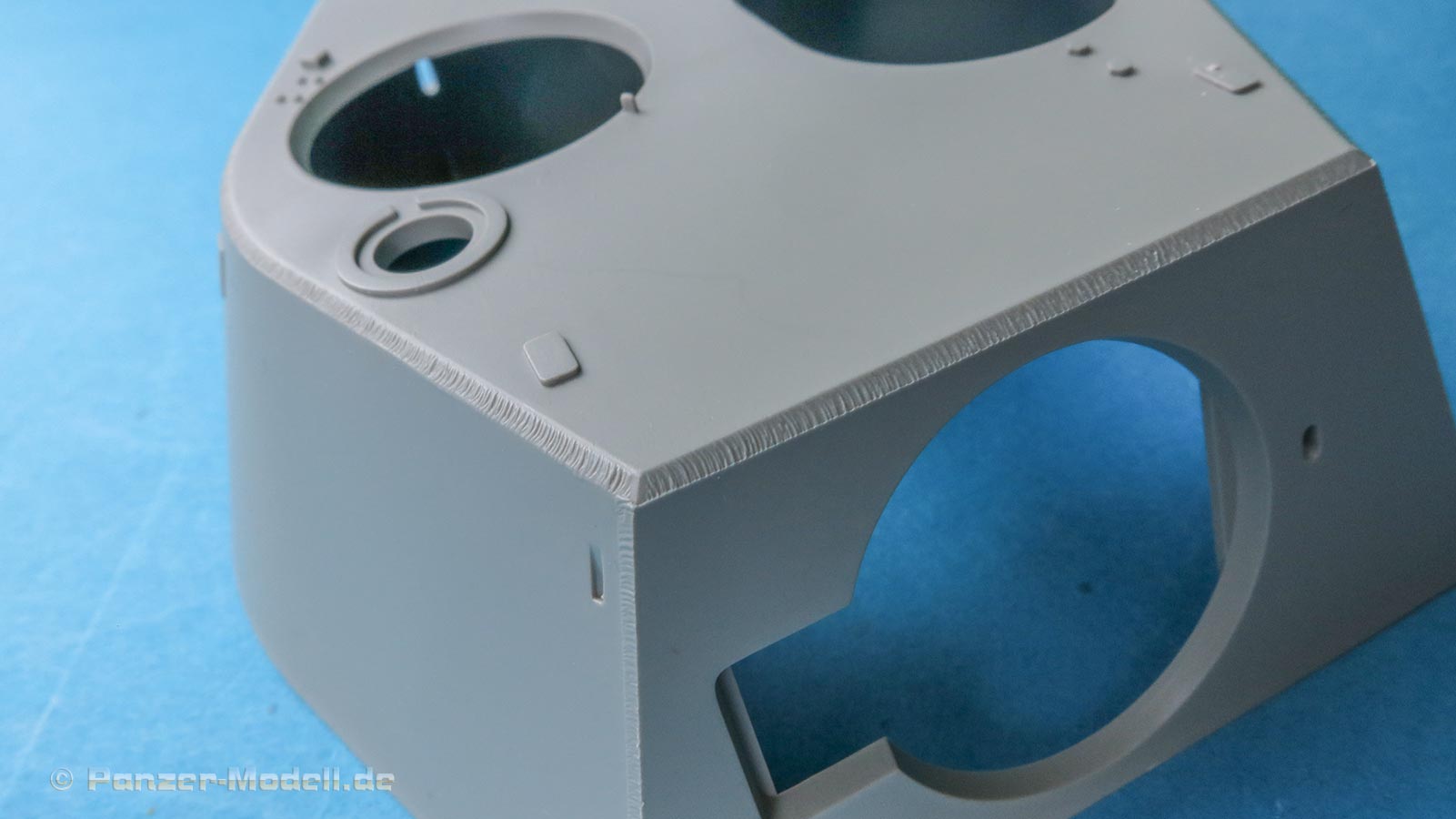 Der Turm setzt sich im groben aus dem Turmober und -unterteil zusammen. Die Kanone und das koaxiale MG werden höhenbeweglich in die Blende eingebaut, wobei das MG42 mehrteilig recht gefällig gespritzt ist.