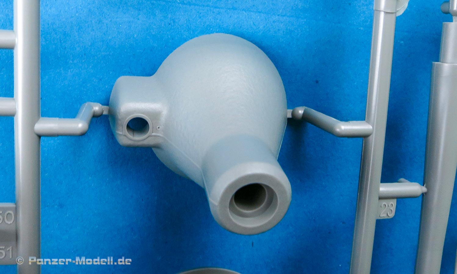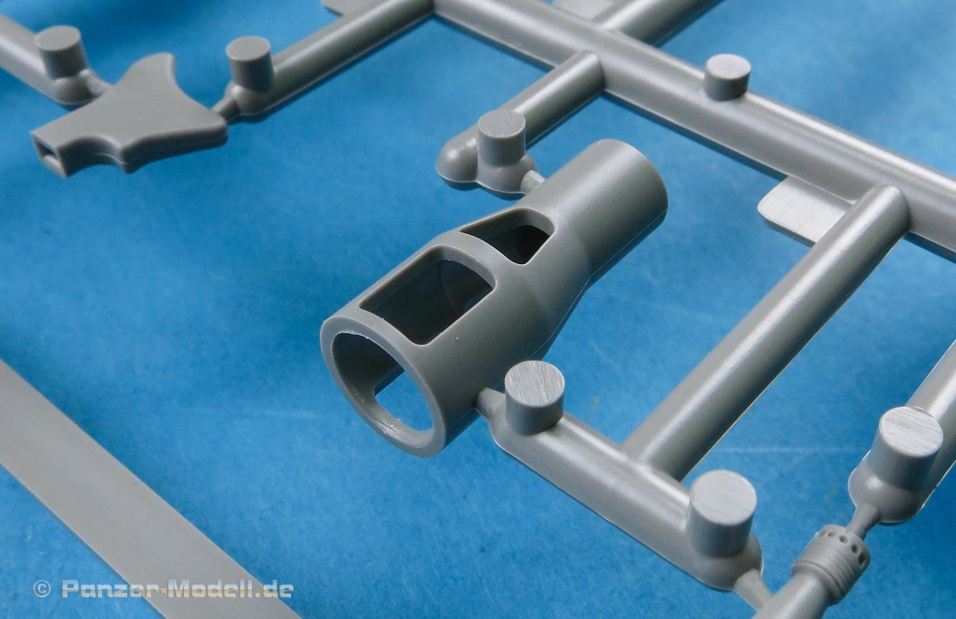 Das Innenleben der 5cm KwK ist für das Turminnere sehr schön dargestellt - für auÃen liegt das Rohr der Kanone als einteiliges Plastikrohr und für die Erstauflage als sehr schön gedrehtes Alurohr bei. Die Mündungsbremse ist aus Spritzguss und baut sich aus 3 einfachen Teilen zusammen. Die Kanonenblende ist schön rauh und mit der markanten Gussnaht dargestellt.