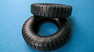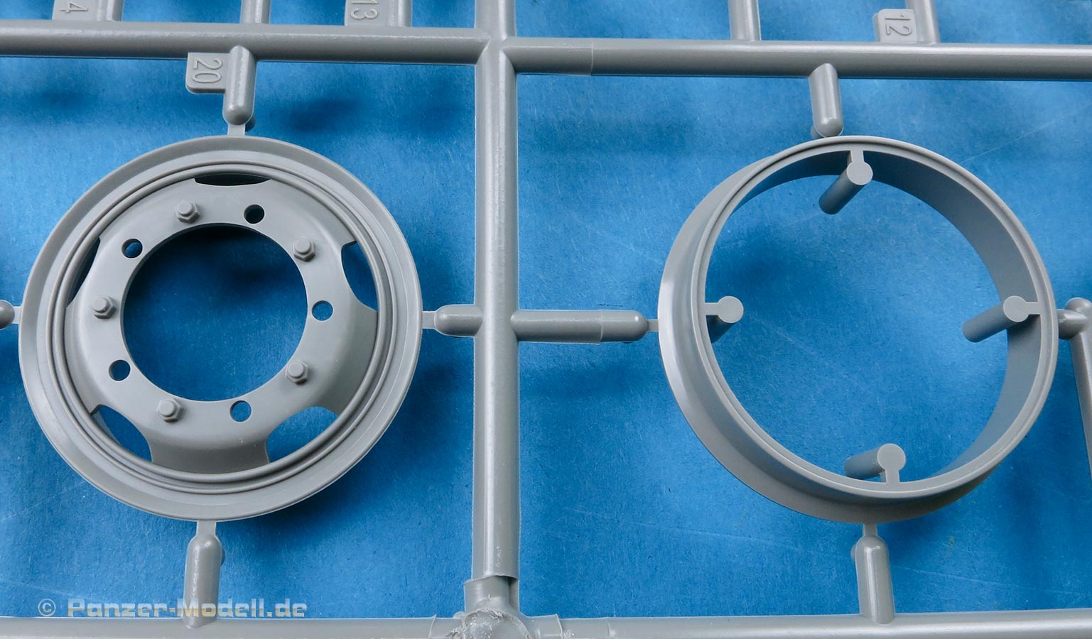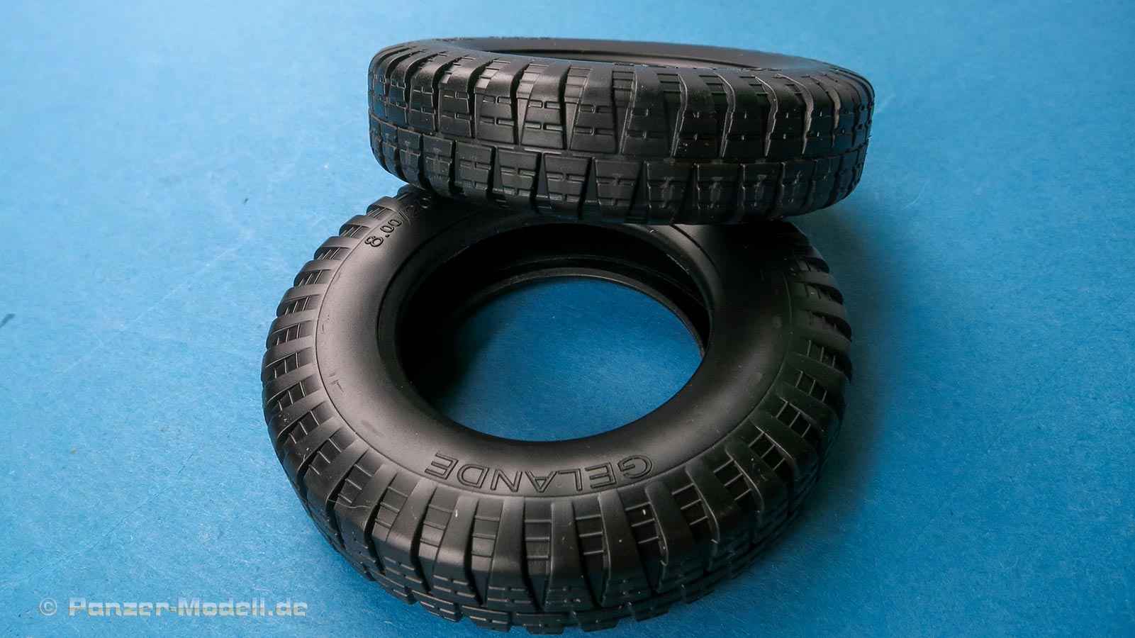 Die Räder setzen sich aus den Vinylreifen und einer dreiteiligen Spritzgussfelge zusammen. Die Detaillierung der Teile weià absolut zu gefallen. Das Profil ist schön wiedergegeben und auch Herstelleraufdrucke sind an den Reifenflanken zu finden.
