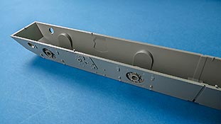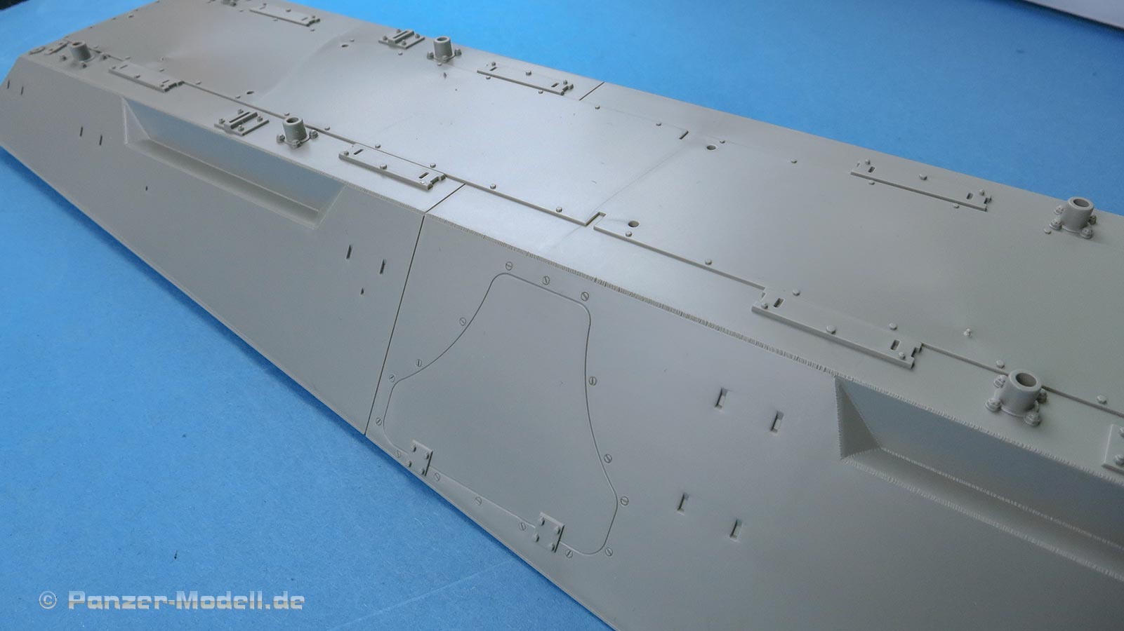 Die Unterwanne mit dem Wellentunnel macht bereits einen guten Eindruck mit den aufgespritzten Details und ist der Ausgangspunkt des Anbaus des achträdrigen Laufwerks. Hier ist Das Werk einen sehr guten Weg gegangen, denn dieses Laufwerk kann Fluch und Segen sein, je nachdem von welcher Warte man es betrachtet.