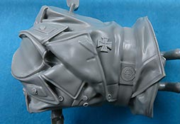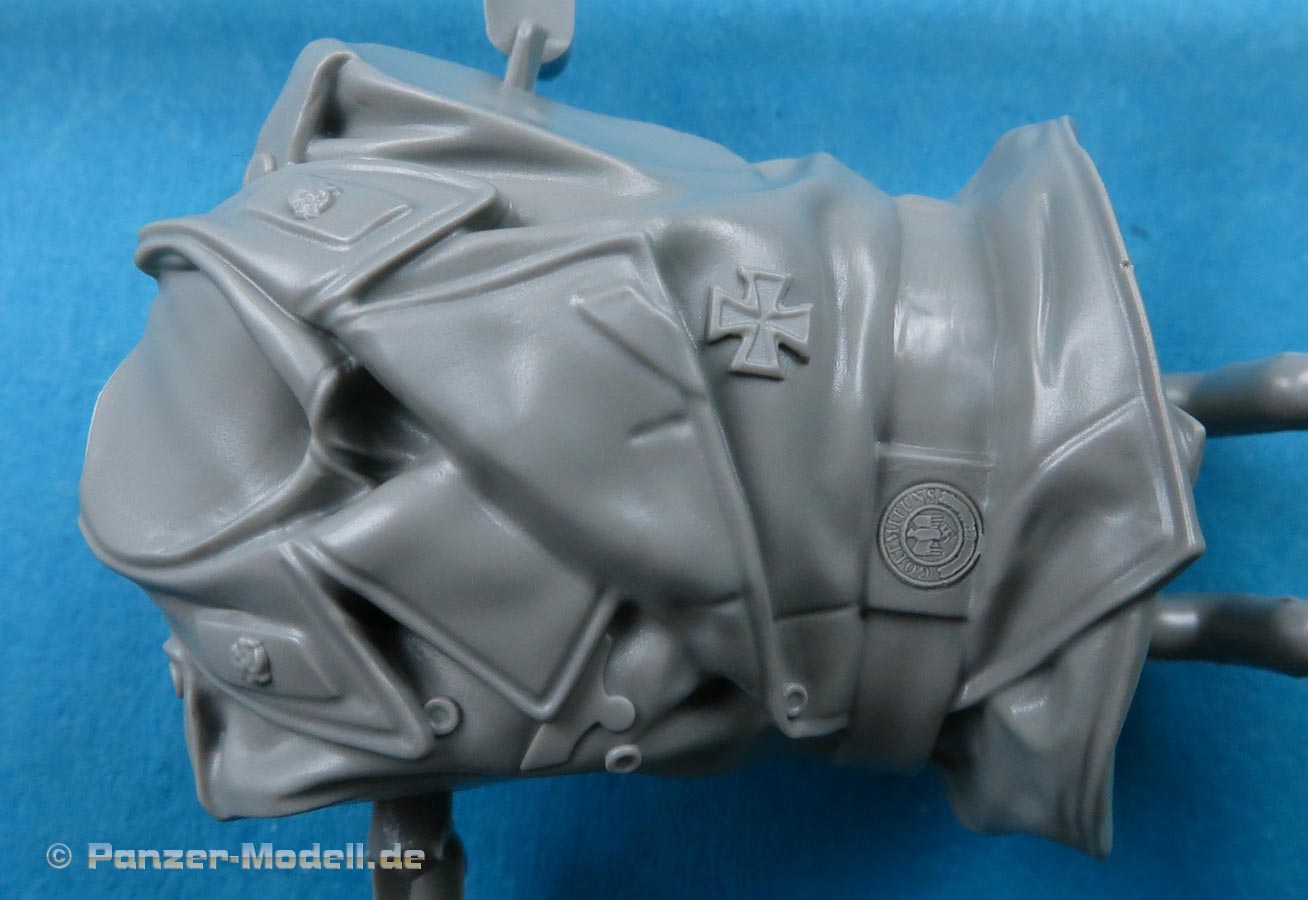 Die Darstellung der Uniform ist absolut überzeugend mit realistischem Faltenwurf und feinen, sauberen Details wie den Kragenspiegeln, dem eisernen Kreuz oder der Gürtelschnalle mit lesbarem Schriftzug "Gott mit uns".