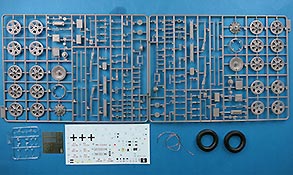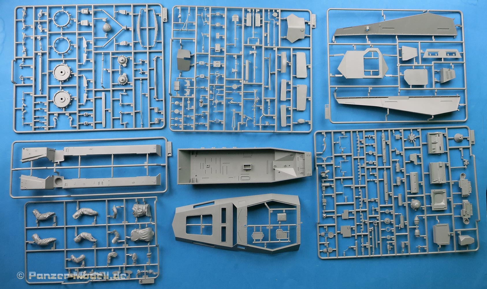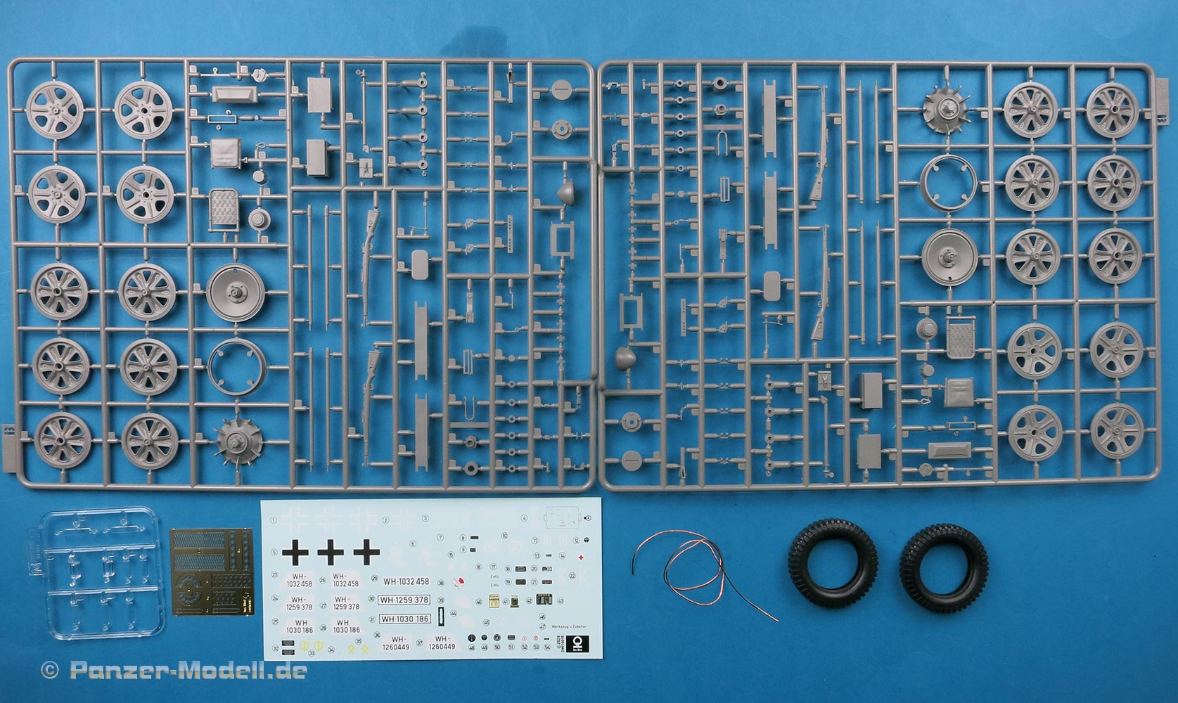 Insgesamt finden wir in dem Karton 13 graue und ein klarer Spritzling. Dazu Ober- und Unterwanne, zwei Vinylreifen, eine kleine PE Platine, Kupferdraht und einen Decalbogen.
