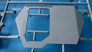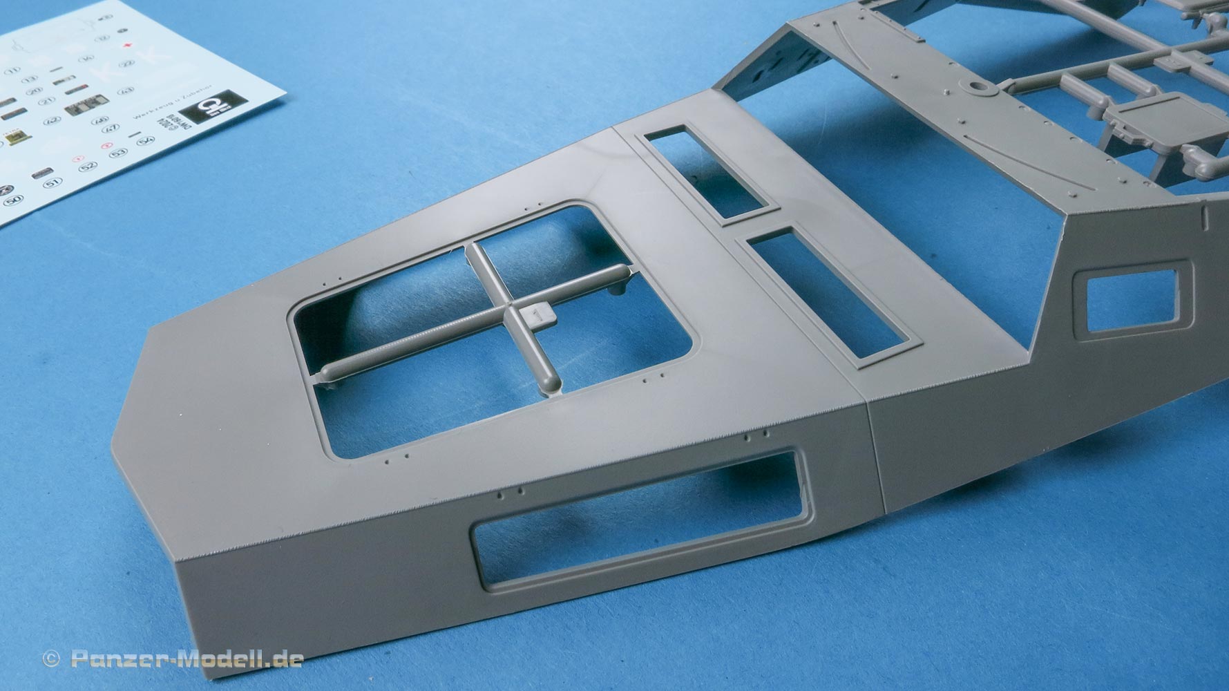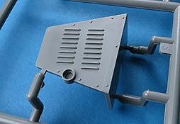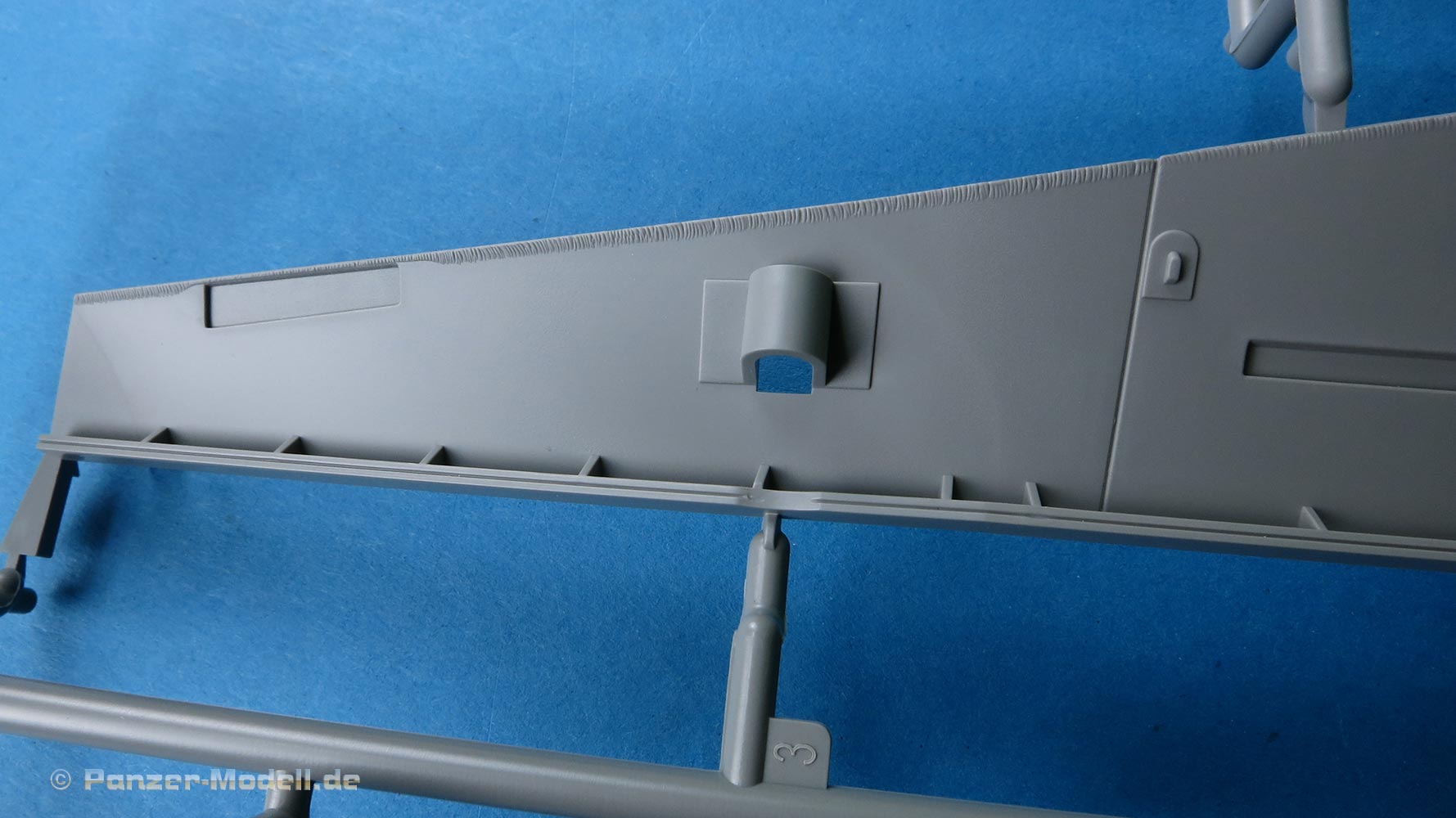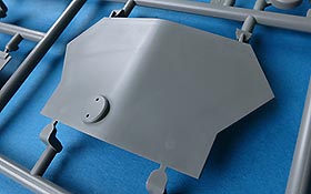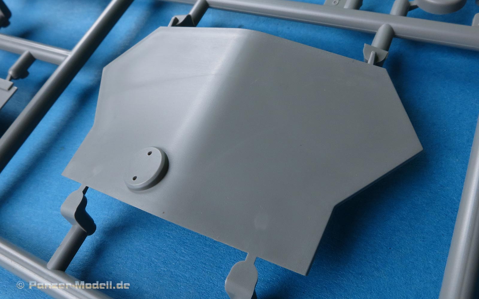 Die Hecktür in der Heckplatte, wie auch die Motorklappen und Sichtklappen lassen sich beweglich einbauen! Die Oberwanne an sich ist einteilig und mit diversen Kleinteilen zu vervollständigen. Die Lüftergitter in der Motorplatte liegen als fein geätzte PE Gitte bei, die von innen eingeklebt werden.