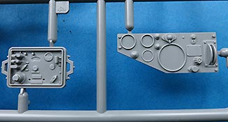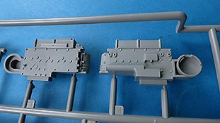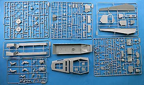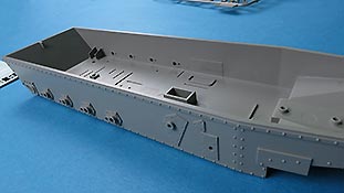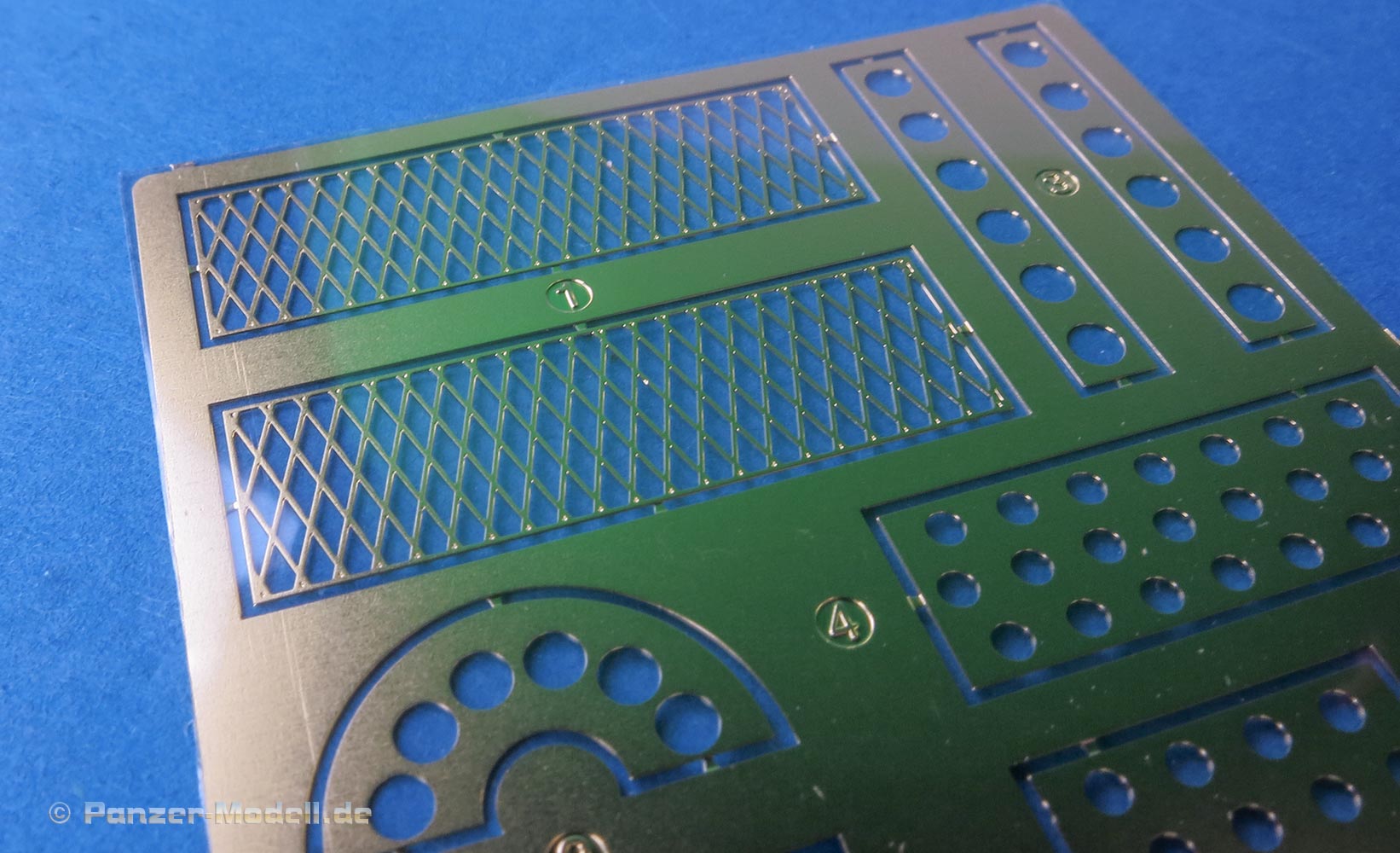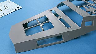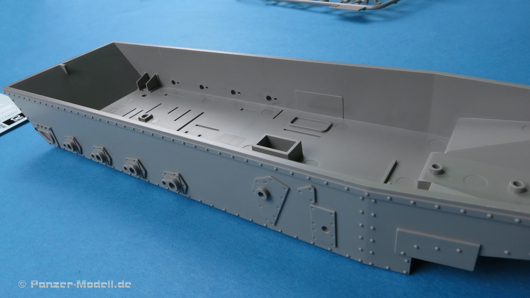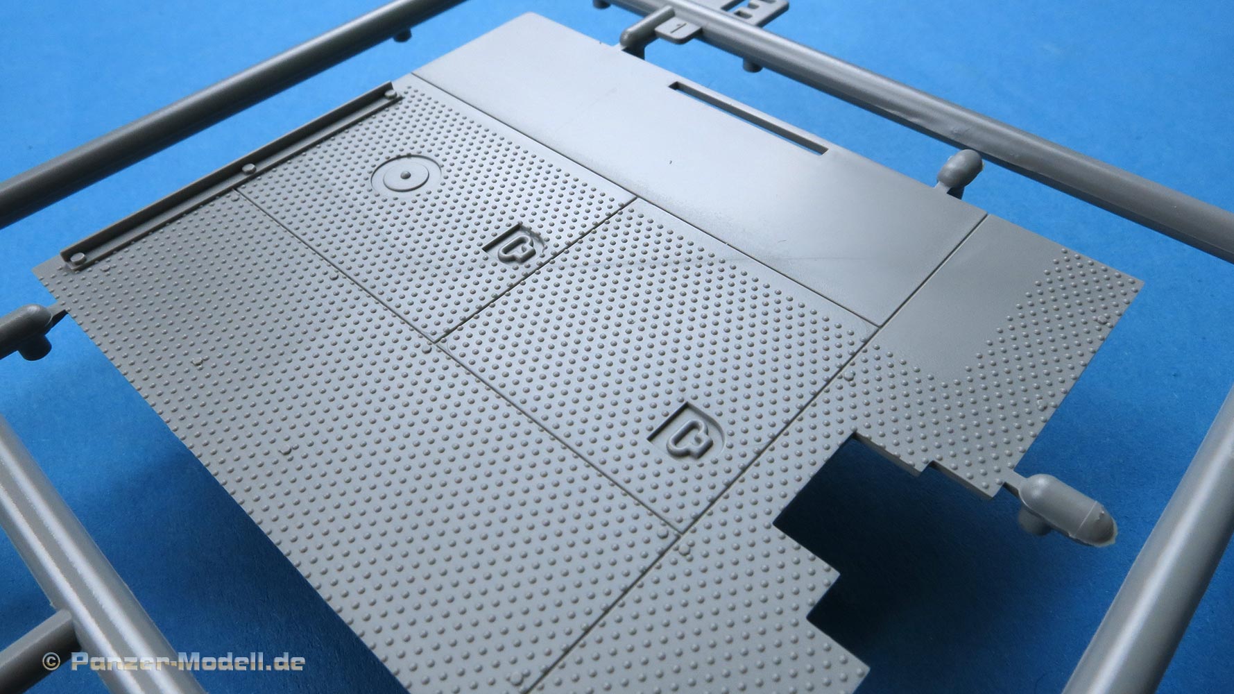 Die Hecktür in der Heckplatte, wie auch die Motorklappen und Sichtklappen lassen sich beweglich einbauen! Die Oberwanne an sich ist einteilig und mit diversen Kleinteilen zu vervollständigen. Die Lüftergitter in der Motorplatte liegen als fein geätzte PE Gitte bei, die von innen eingeklebt werden.