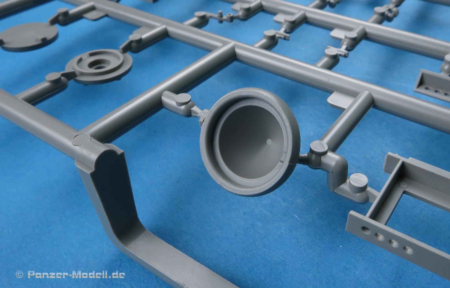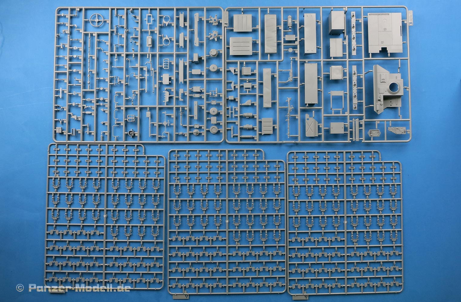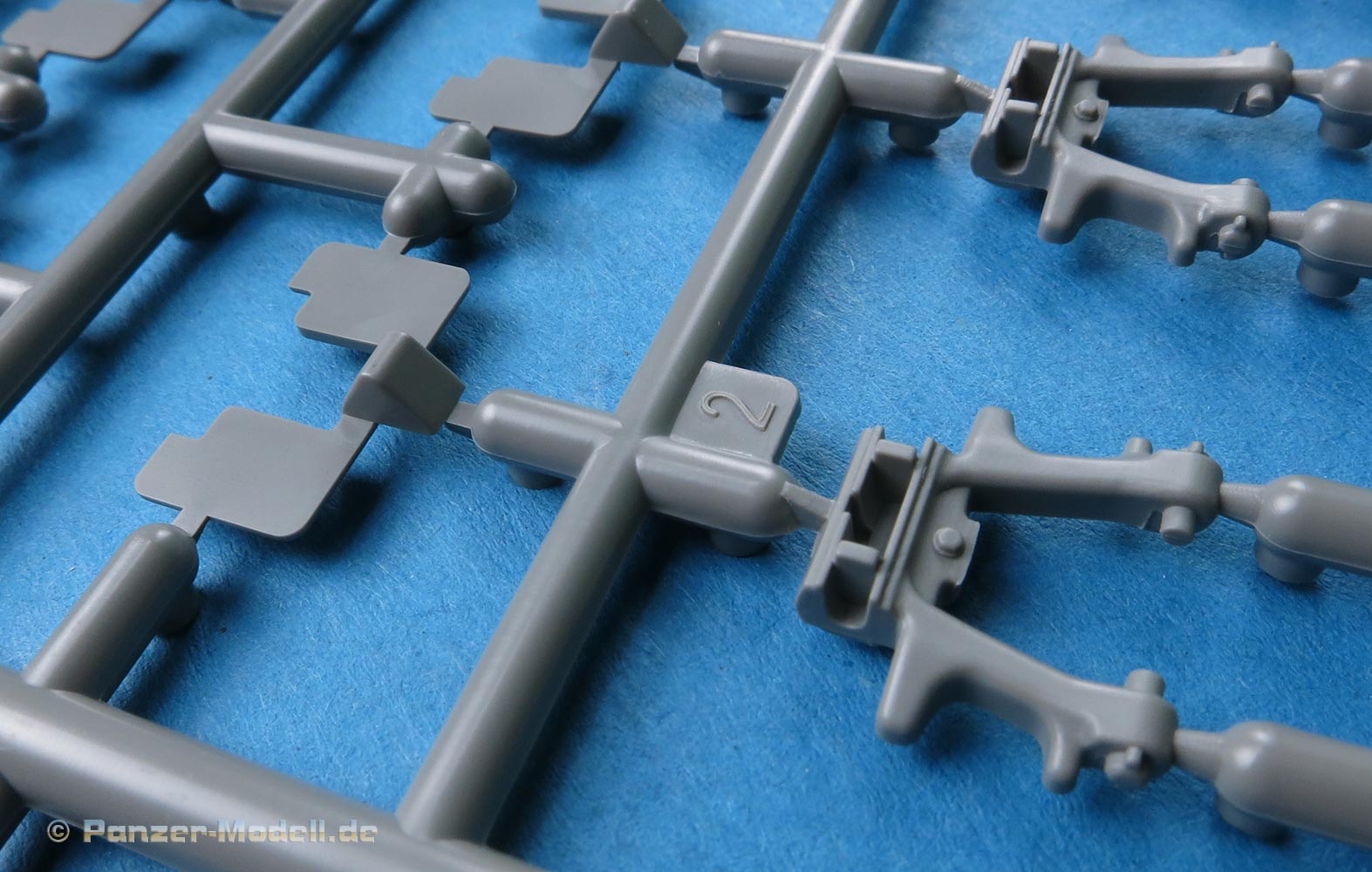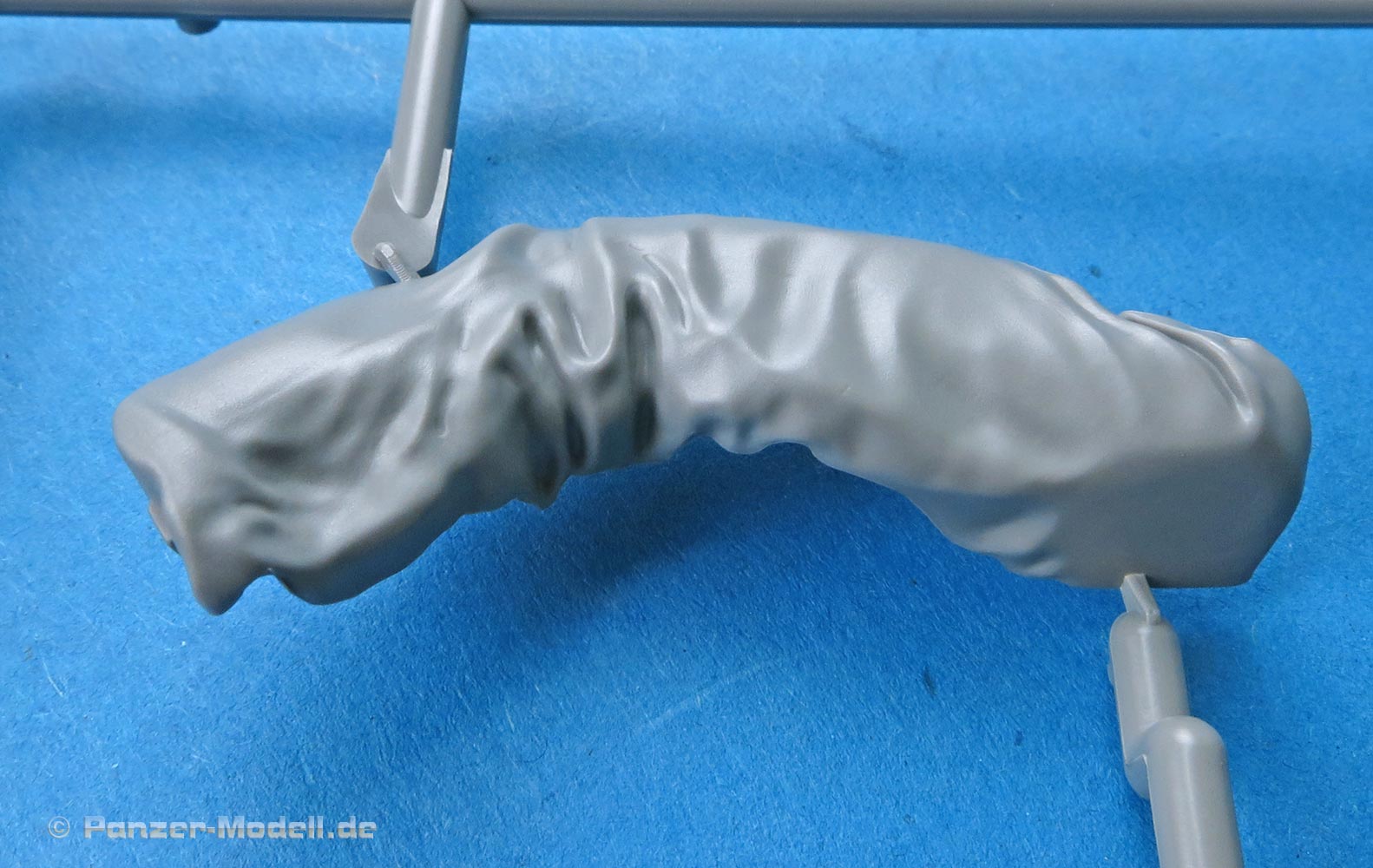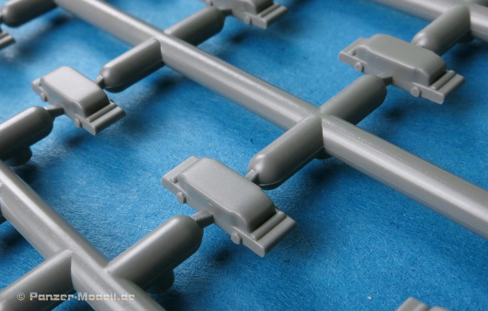 Die Kettenabdeckbleche sind jeweils einzeln und schön geformt gespritzt und dabei ohne Verzug oder Auswerferstellen. Die ganzen Ausrüstungsgegenstände und Werkzeuge liegen einzeln bei und machen einen guten Eindruck.