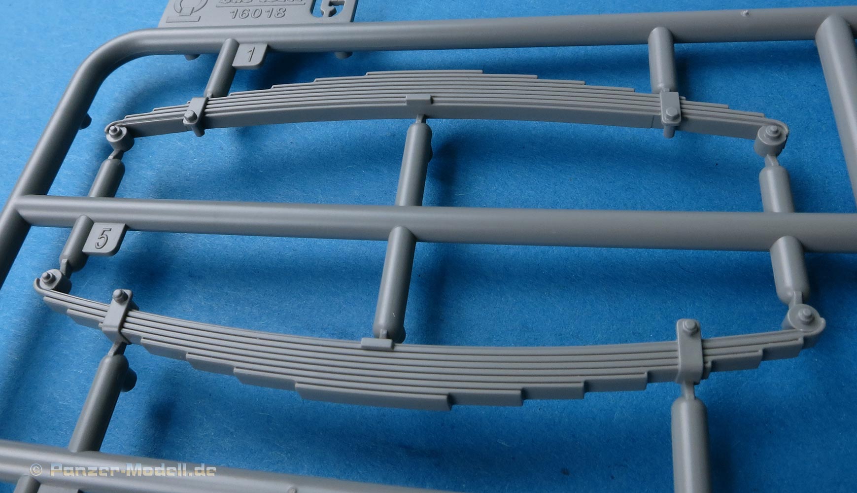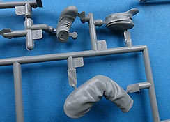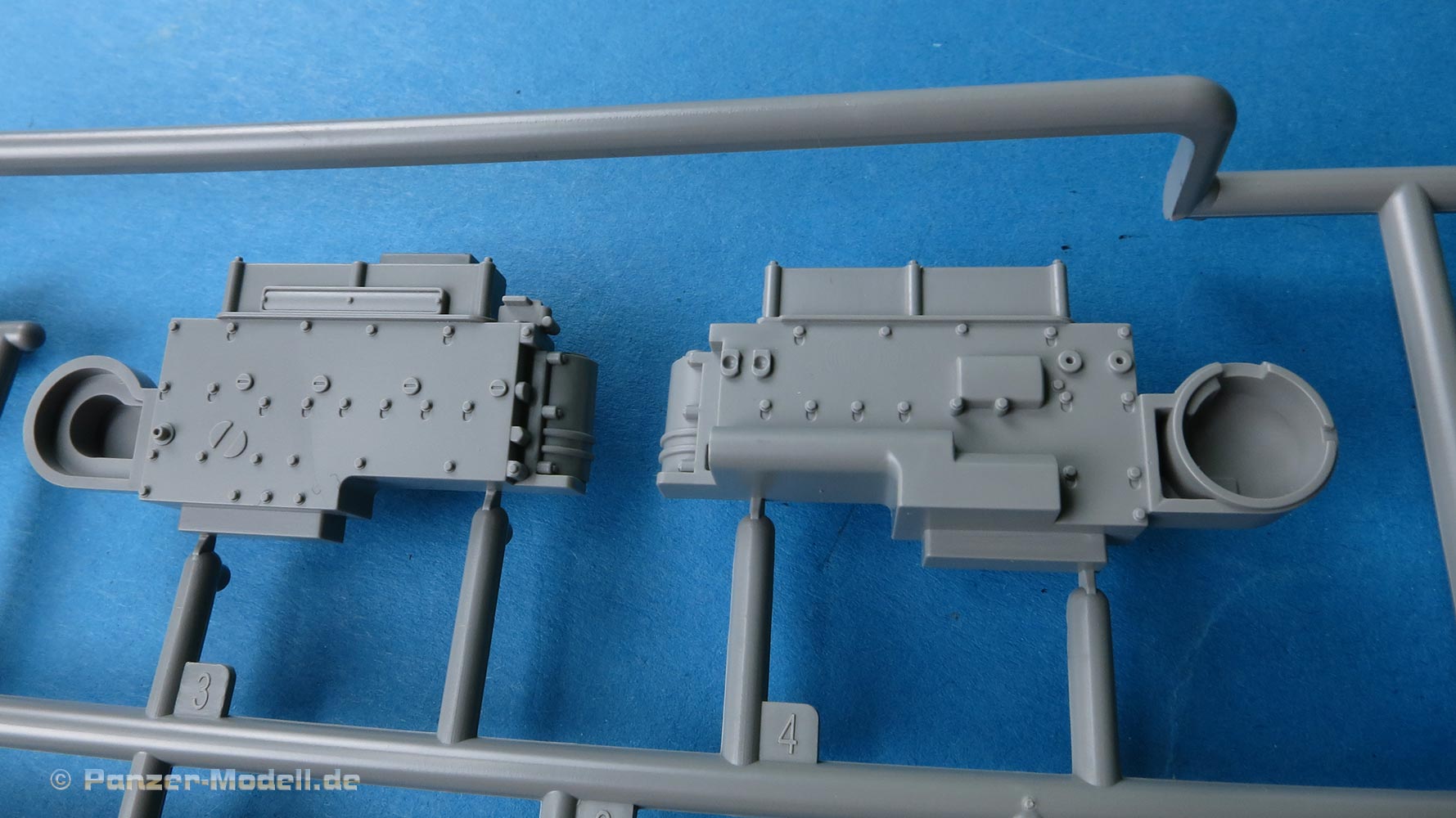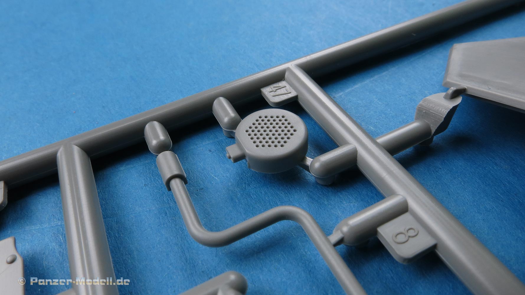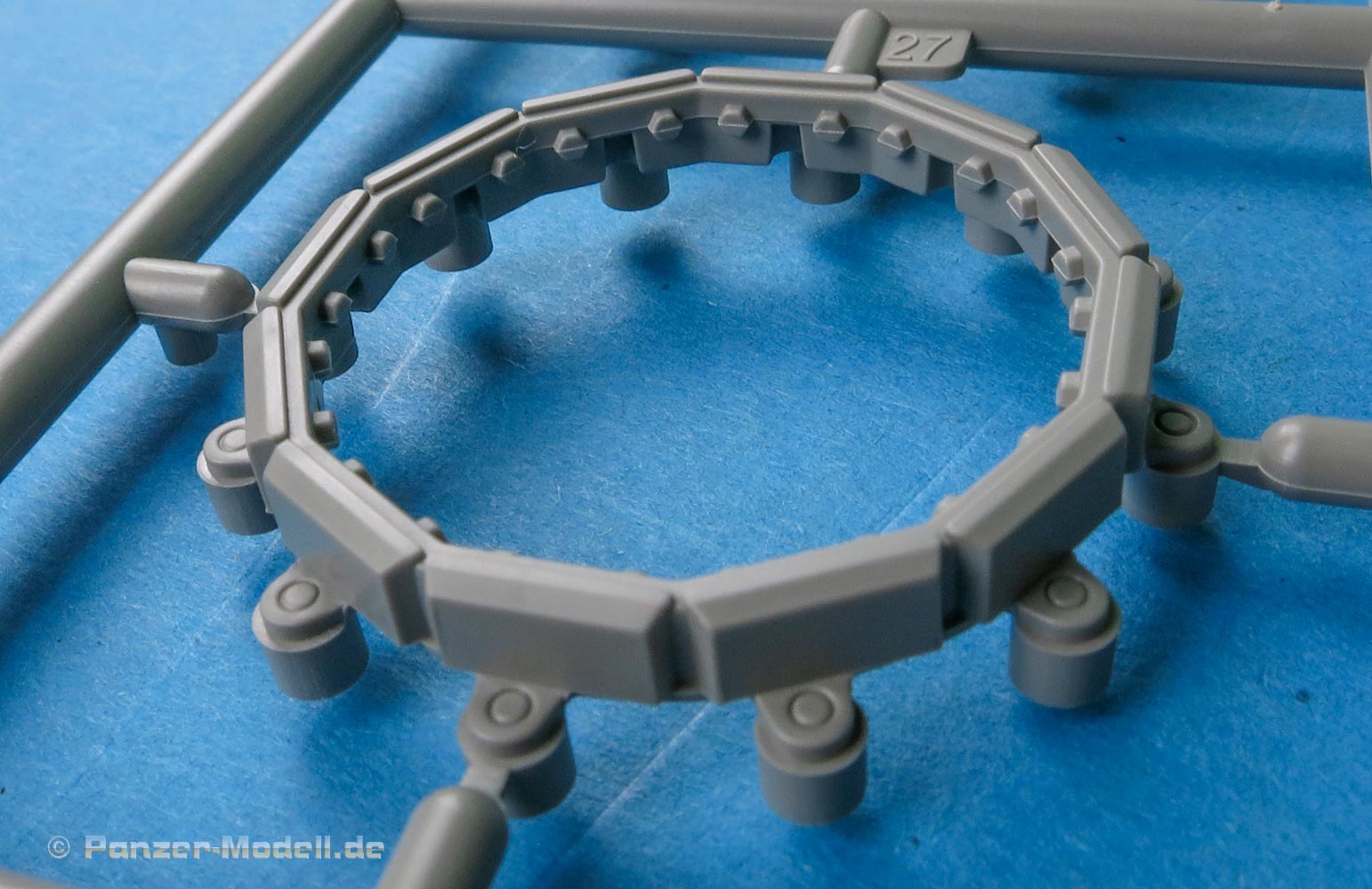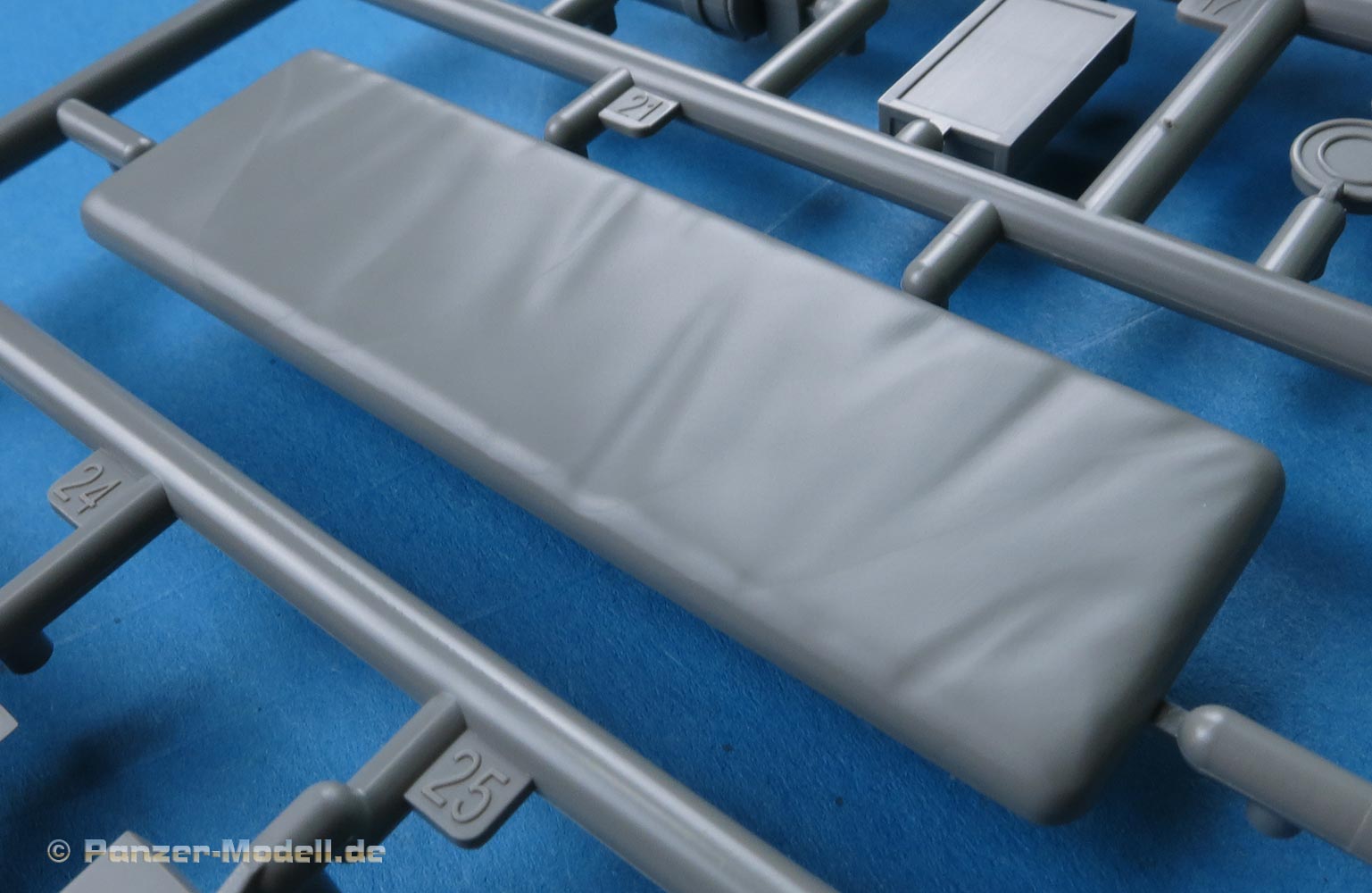 Die Kettenabdeckbleche sind jeweils einzeln und schön geformt gespritzt und dabei ohne Verzug oder Auswerferstellen. Die ganzen Ausrüstungsgegenstände und Werkzeuge liegen einzeln bei und machen einen guten Eindruck.