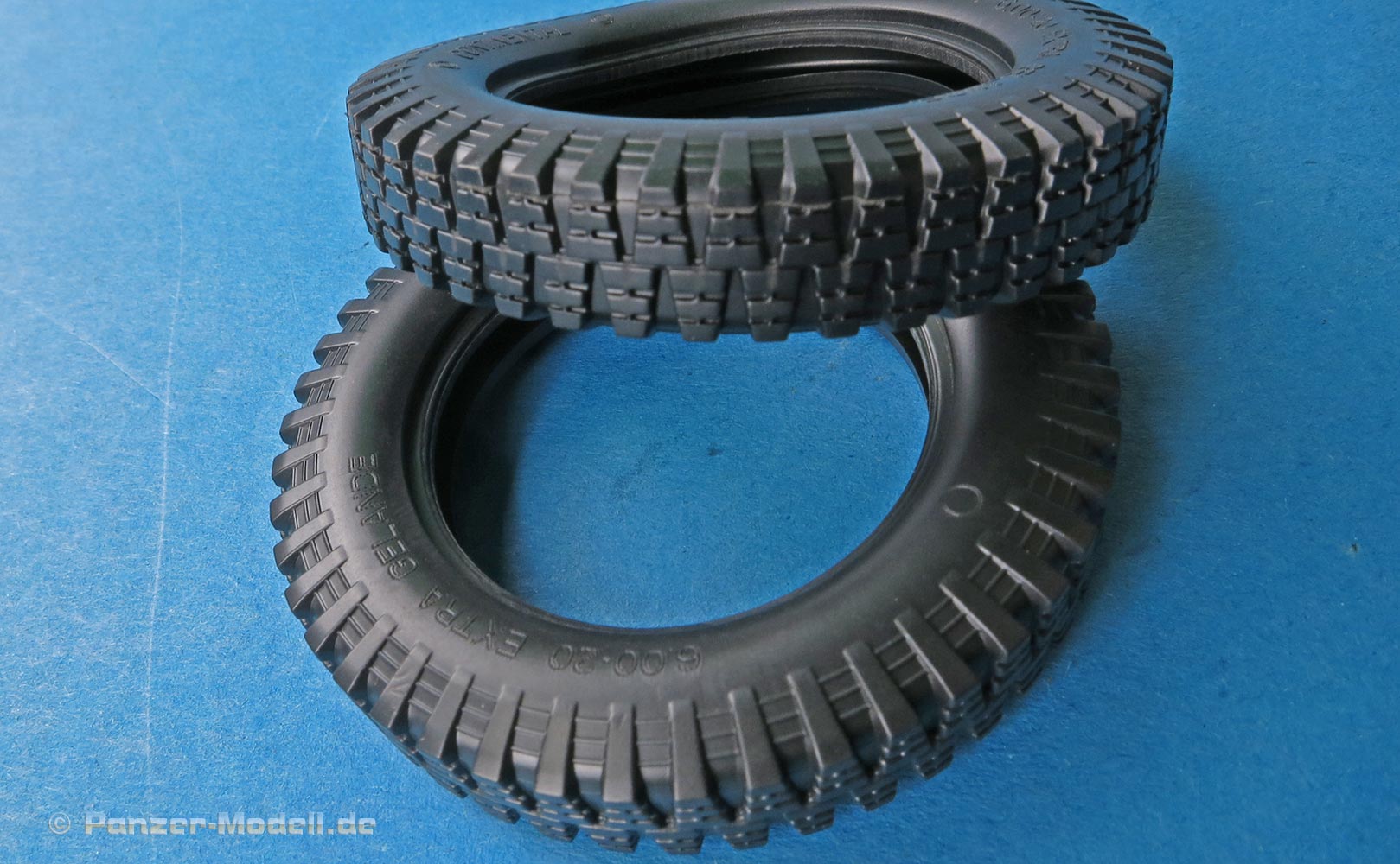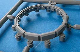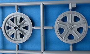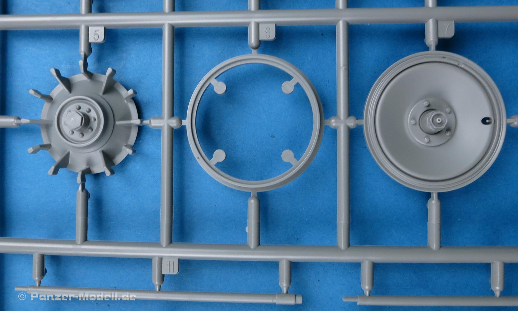 Laufrollen und Treibräder setzen sich aus zwei, bzw, drei Radteilen zusammen und dazu eine Nabenhülse, die am Ende die Räder drehbar hält. Die Details der Räder ist ganz ausgezeichnet. Die Aussparungen und Versteifungen der Felgen ist wirklich hervorragend und die Gummierung weist ganz tolle Herstelleraufdrucke auf!