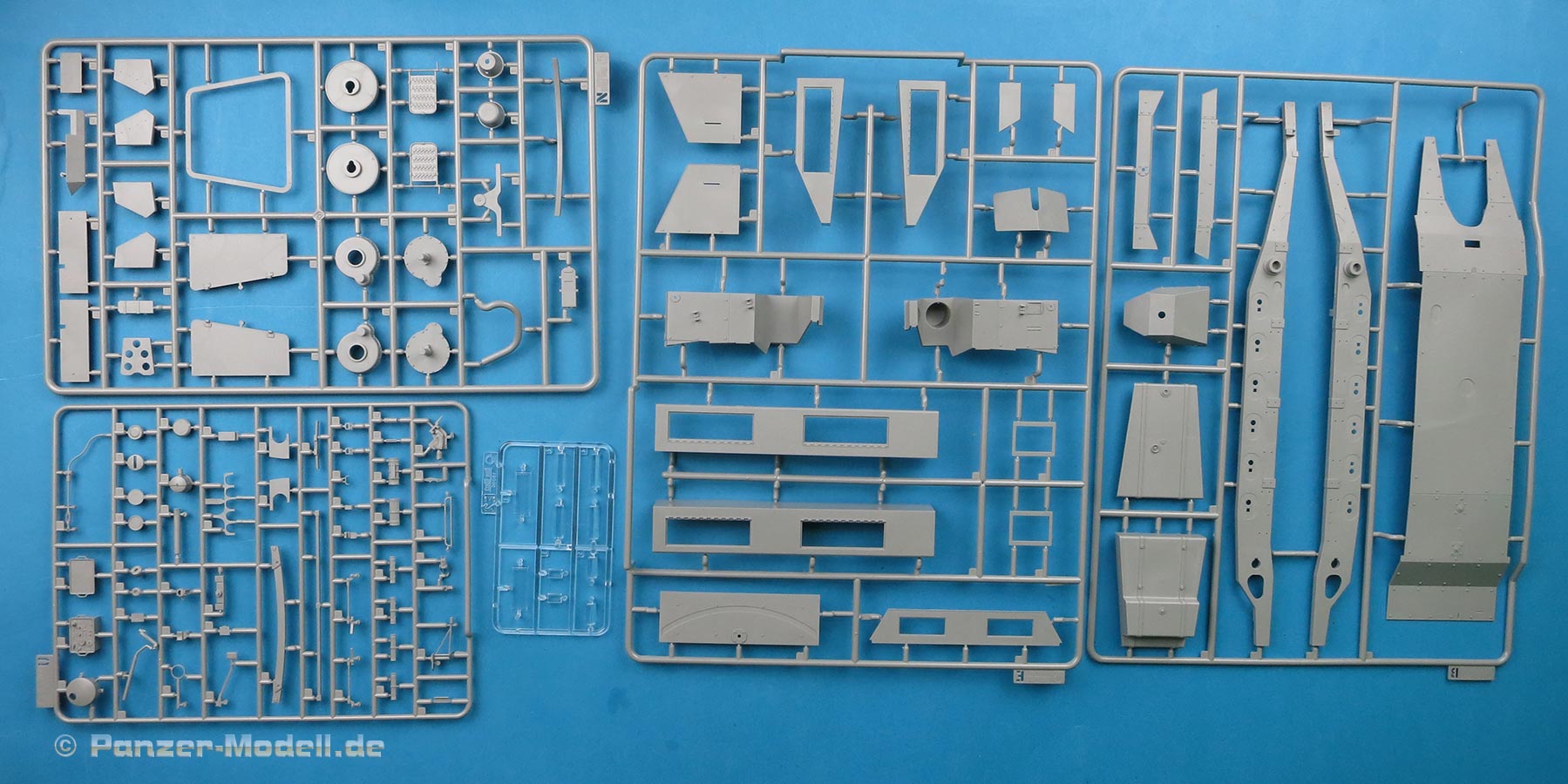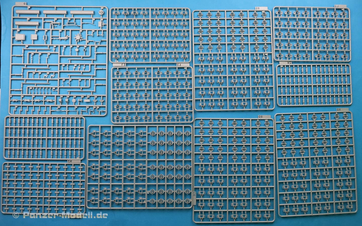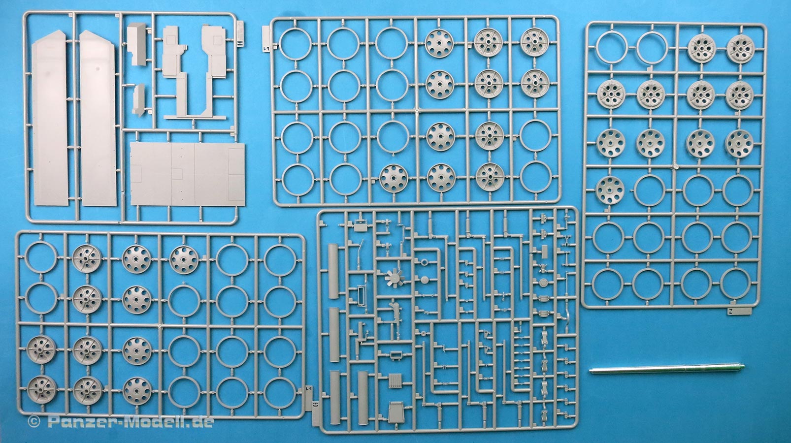 Insgesamt finden wir in dem wirklich gigantischen Karton 39(!) graue und einen klaren Spritzling. Dazu eine optionale Motorabdeckung, zwei Vinylreifen, ein Metallrohr für die Pak, eine kleine PE Platine und einen Decalbogen.