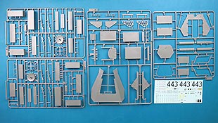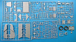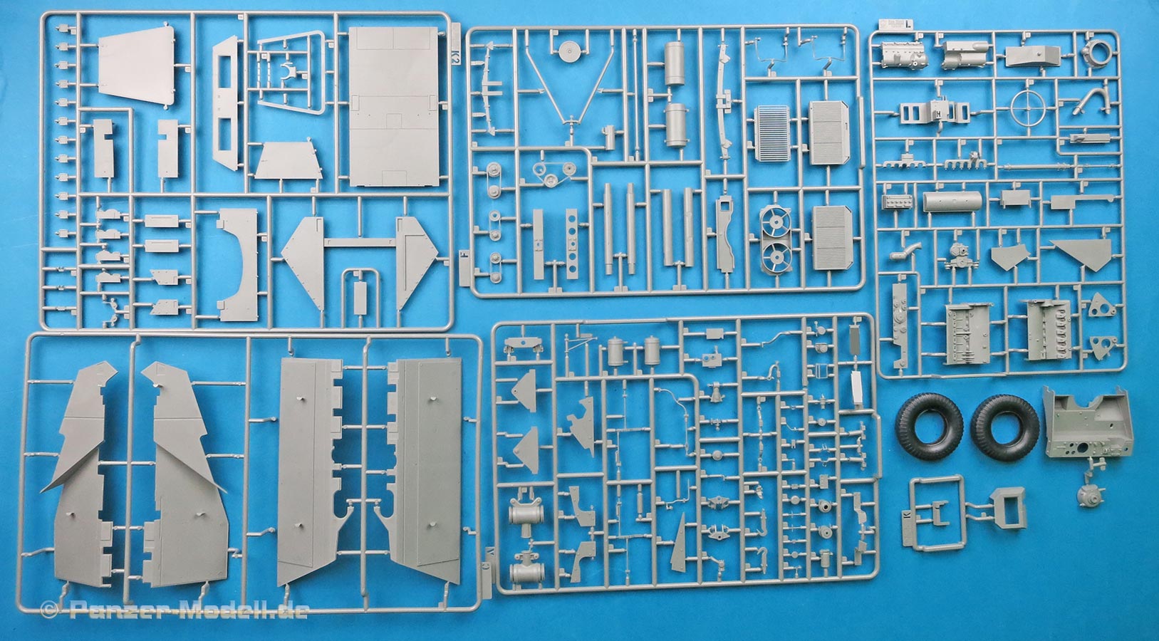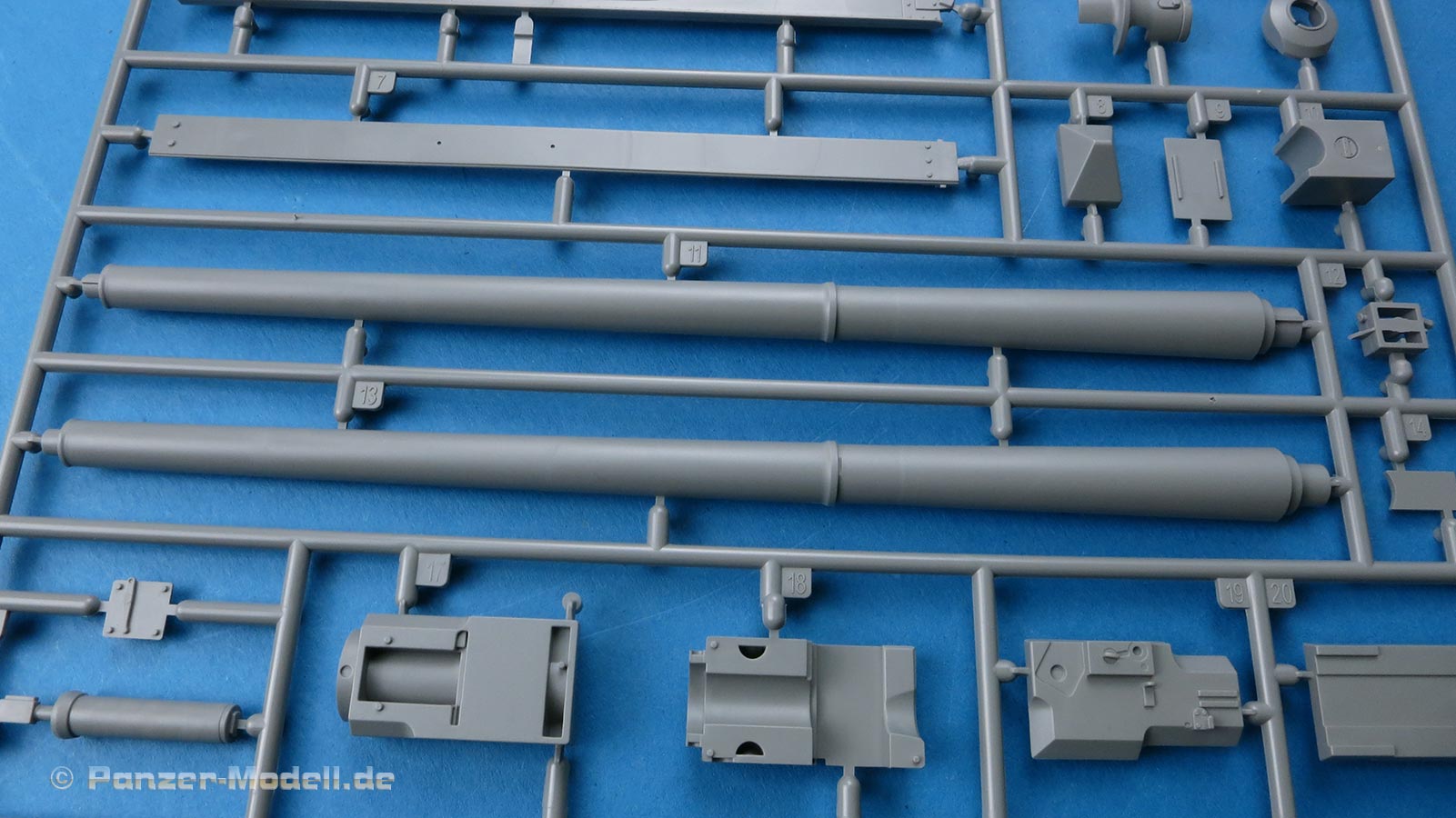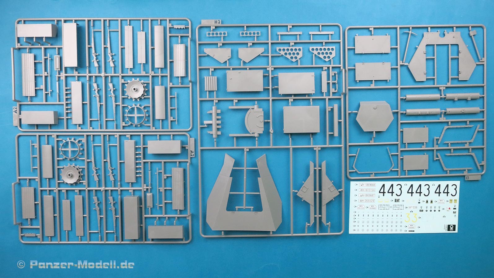 Insgesamt finden wir in dem wirklich gigantischen Karton 39(!) graue und einen klaren Spritzling. Dazu eine optionale Motorabdeckung, zwei Vinylreifen, ein Metallrohr für die Pak, eine kleine PE Platine und einen Decalbogen.