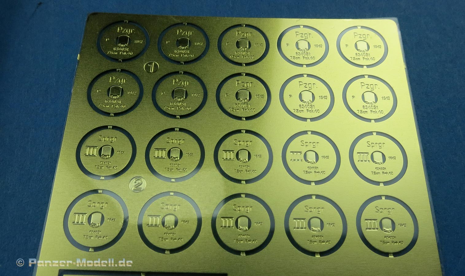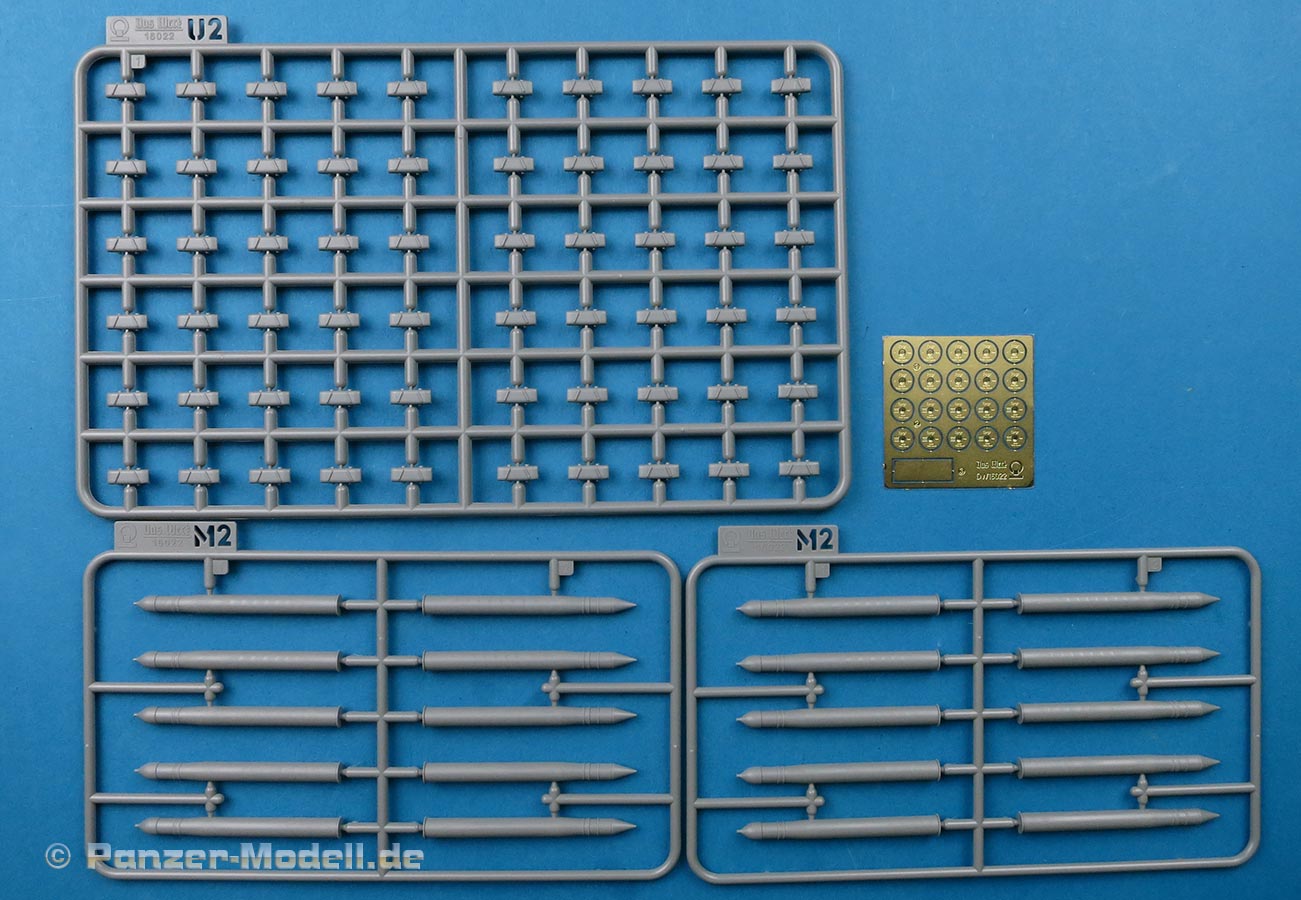 Für die Version des /22 sind alle wichtigen Sachen enthalten. Natürlich des gesamte Unetrbau der Pack mit den Querstreben und Stützen, den Munitionsbehältern, inklusive Einzelgranaten. Diese liegen als Panzer- und Sprenggranate vor und werden mit geätzten Bodenstücken um wichtige Details bereichert.