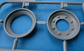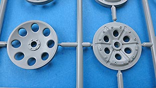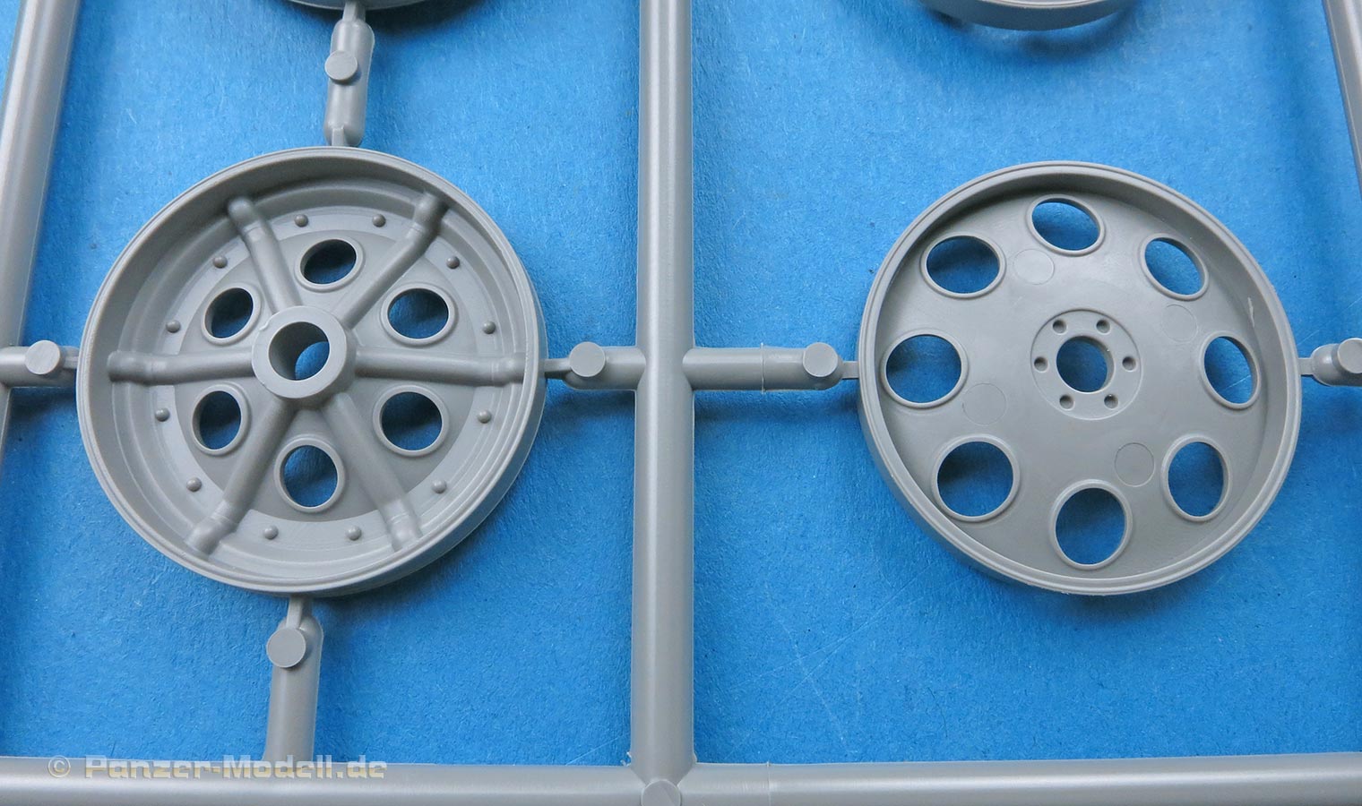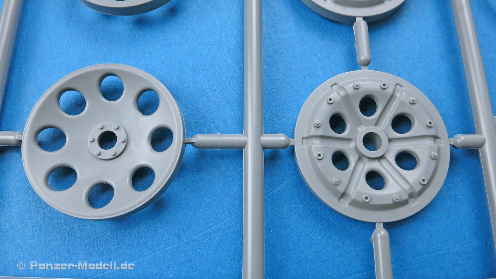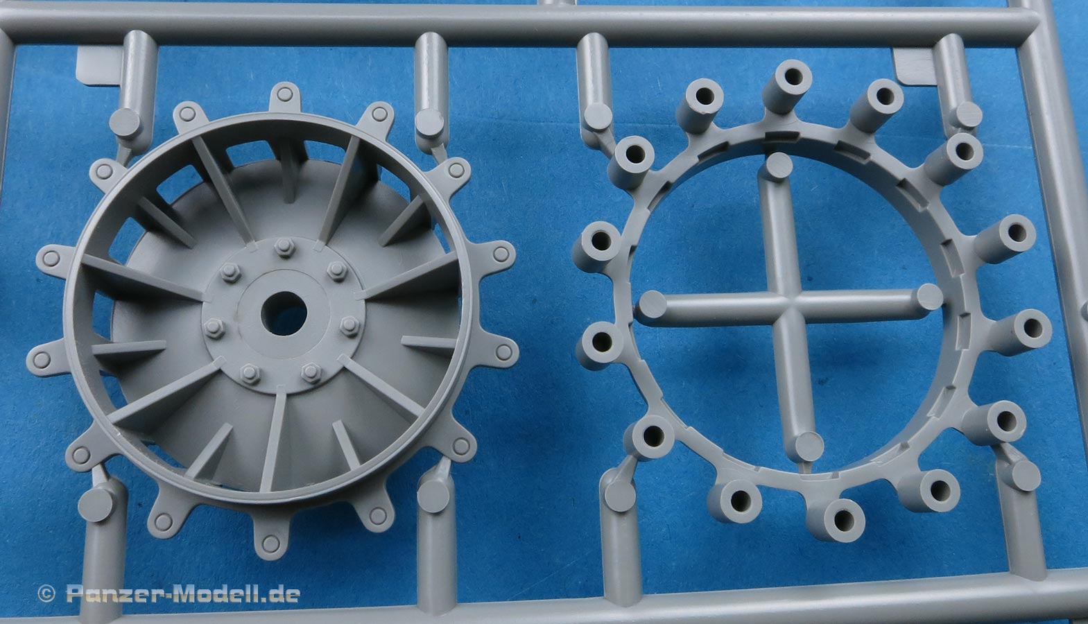 Ähnlich erfreulich gestaltet sich das Aussehen der Laufrollen des Kettenlaufwerks. Diese setzen sich jeweils immer aus zwei Laufrollen zu einer Doppellaufrolle zusammen und auch hier ist die Gummierung einzeln anzubringen - hier allerdings auch aus Spritzguss, dafür aber auch mit Herstelleraufdrucken (Dunlop). Die ganze Gestaltung der gerippten und gewölbten Felgen macht hier einen wahnsinnig guten und sauberen Eindruck.