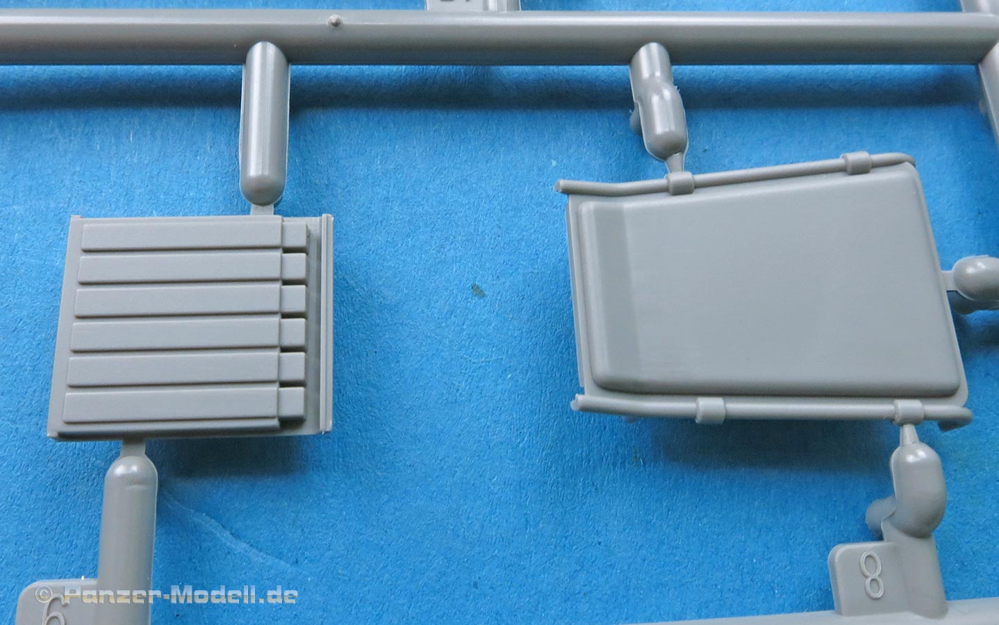 Fahrerplatz mit Armaturenbrett ist natürlich entsprechend vorhanden und die Instrumente schön aufgeprägt. Ausrüstungsgegenstände wie Gasmaskenbehälter, Magazintaschen MP40 und Karabiner sind ebenfalls vorhanden und sehr schön in Spritzguss dargestellt, wobei sich mir nicht erschließt warum der Gasmaskenbehälter aus 7 Einzelteilen zusammengebaut werden muss.