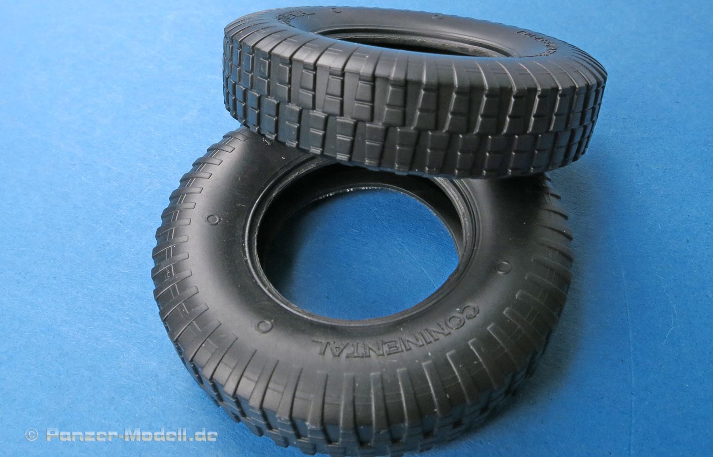 Apropos Räder - die Vorderräder setzen sich aus Plastikfelgen und Vinylreifen zusammen - die Vinylreifen sind per se gut gemacht, sauber gespritzt mit korrektem Profil und sogar Herstelleraufdrucken auf den Reifenflanken (Continental Extra Gelände).