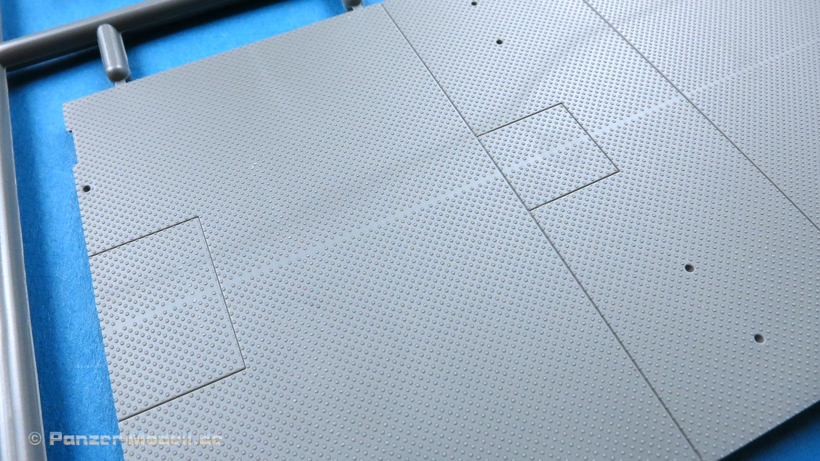 In die Unterwanne werden sämtliche Teile des Innenlebens verbaut, wie etwa der Tank, die Druckluftbehälter, Getriebe, Sammler, etc. bevor darüber die Bodenplatten verlegt werden. Letztere machen einen hervorragenden Eindruck mit derm Riffelblechmuster und den eingeprägten Details.