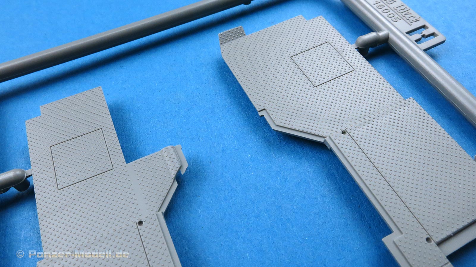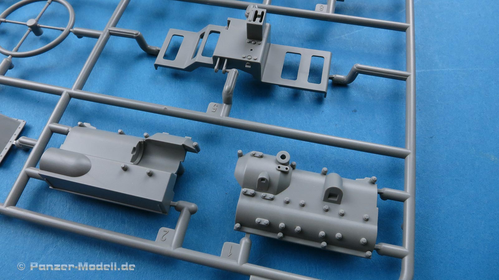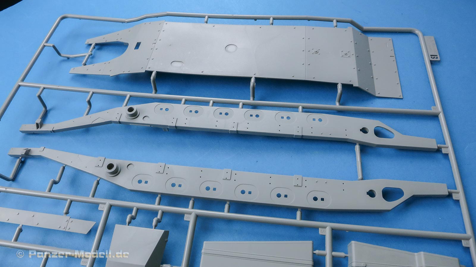 Die Unterwanne ist mehrteilig aus Bodenblech, Seitenteilen und den Abdeckungen der Schwingarme zusammenzubauen - das ist natürlich aufwändiger, bietet aber mehr aufgeprägte Details auf den einzelnen Teilen. Entsprechende Passmarken stellen sicher, dass die Unterwanne problemlos zusammenbaubar ist.