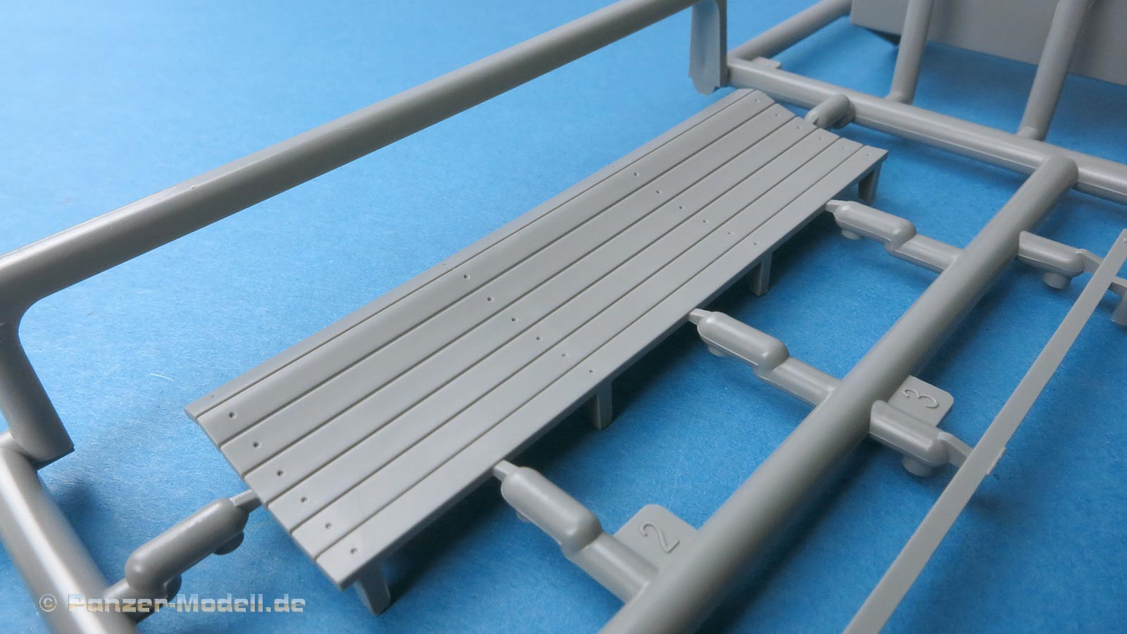Die noch verbleibende Sitzbank im Kampfraum ist mit schön geschwungener Form der Holzbeplankung dargestellt.