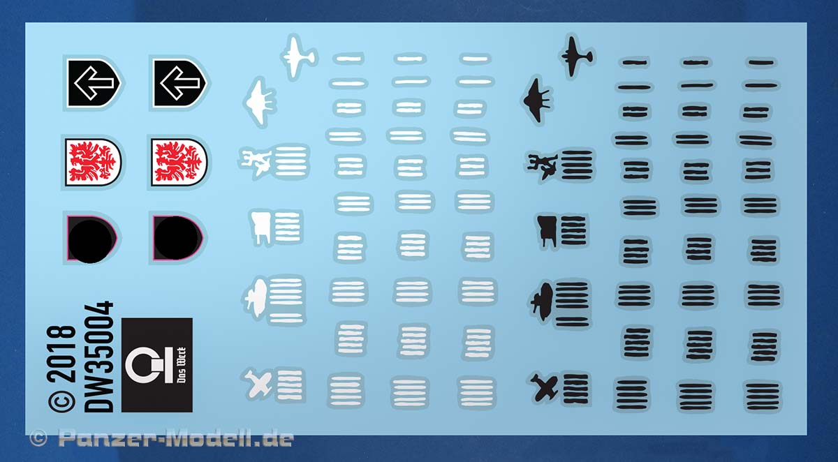 Der Decalbogen ist sehr sauber und fein gedruckt und bietet Abschussmarkierungen für die Schutzschilde in schwarz und weiß, sowie drei Einheitenemblemen zur freien verfügung - eines von ihnen wurde leider aufgrund der Gesetzeslage in Deutschland zensiert.