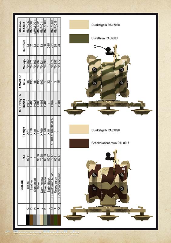 Im Anschluss gibt es vier Farbvorschläge, von denen drei von vorn und eins von oben als Farbprofil abgebildet sind. Dazu eine Farbtabelle mit Farbangaben für Tamiya, Mr.Hobby, Amig, Vallejo, Humbrol und Mission Models. Sehr löblich!