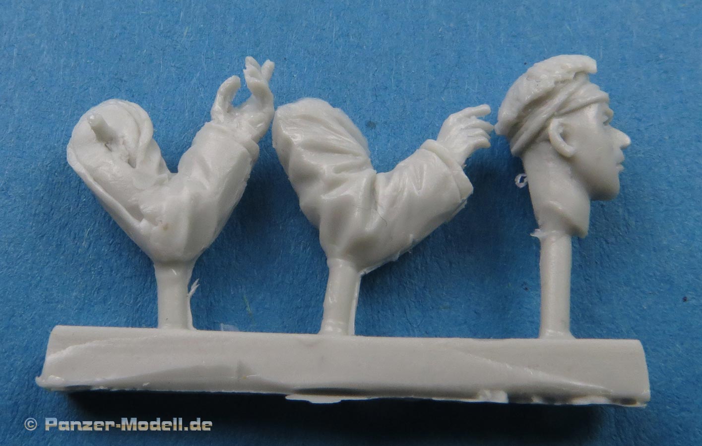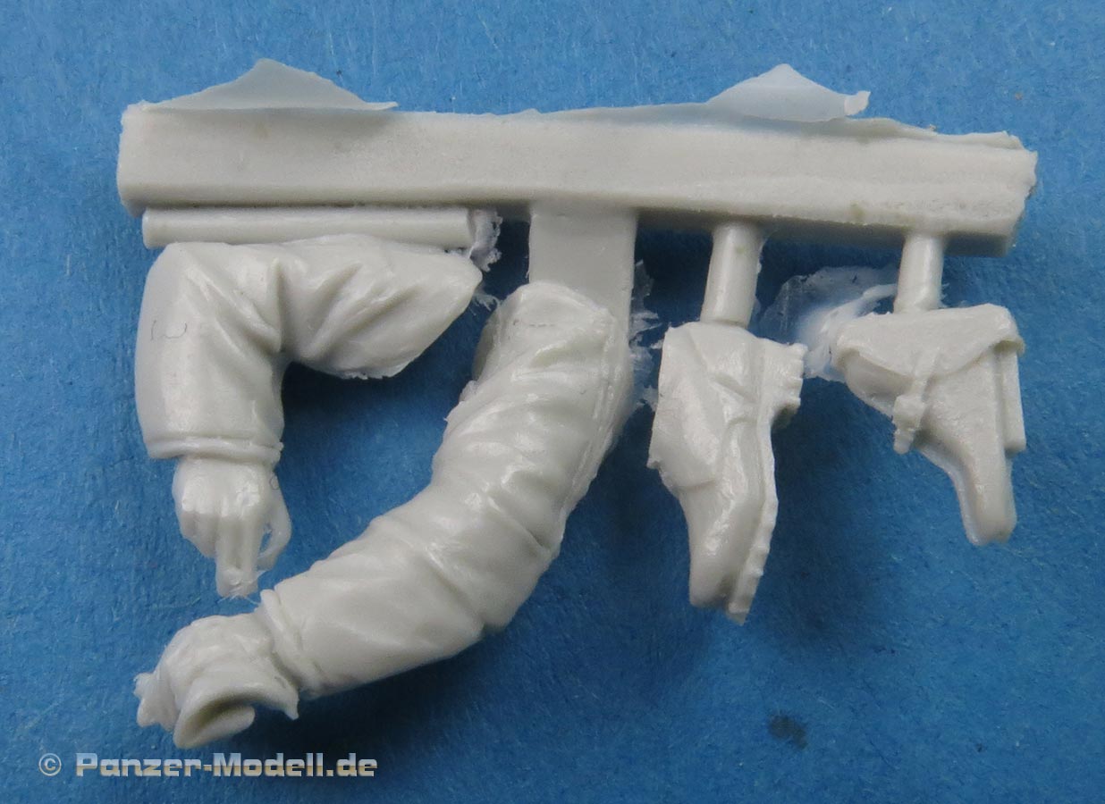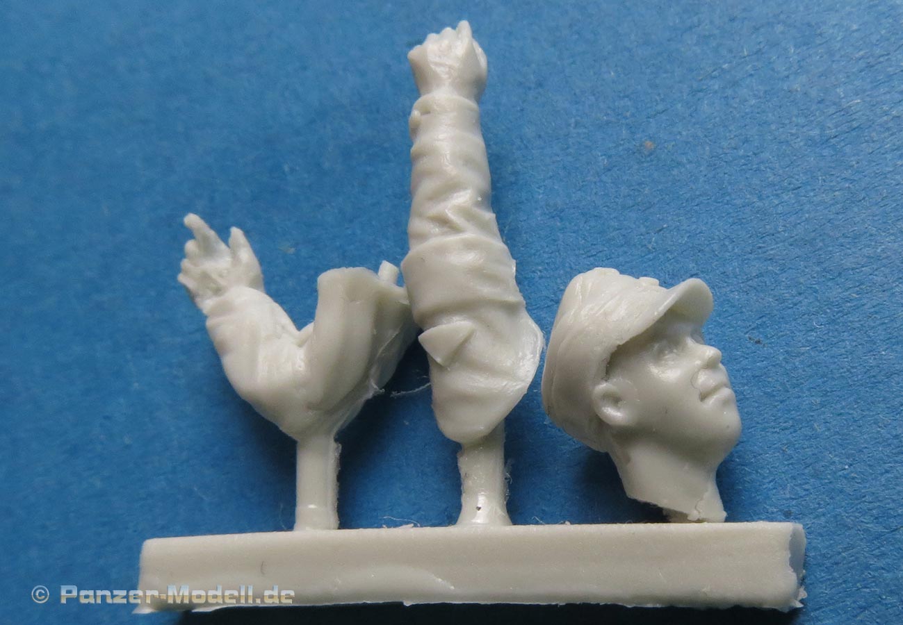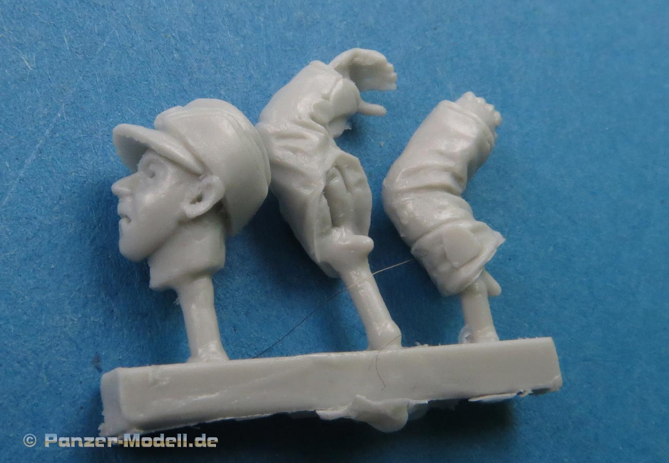 Die Figuren müssen in der Regel nur noch mit dem Kopf und beiden Armen sowie Zubehör wie Klappspaten, Taschen oder auch Waffen wie Panzerfaust, MP40, Karabiner oder auch MP18 versehen werden. Die Handwaffen sind auch sehr fein und detailliert gegossen, wobei beim sich bei dünnen Läufen auch schnell mal eine leichte Biegung feststellen lässt. In heißem Wasser sollte sich das aber wieder richten lassen.