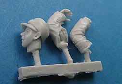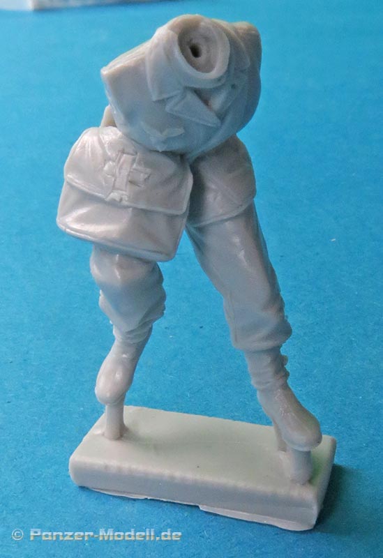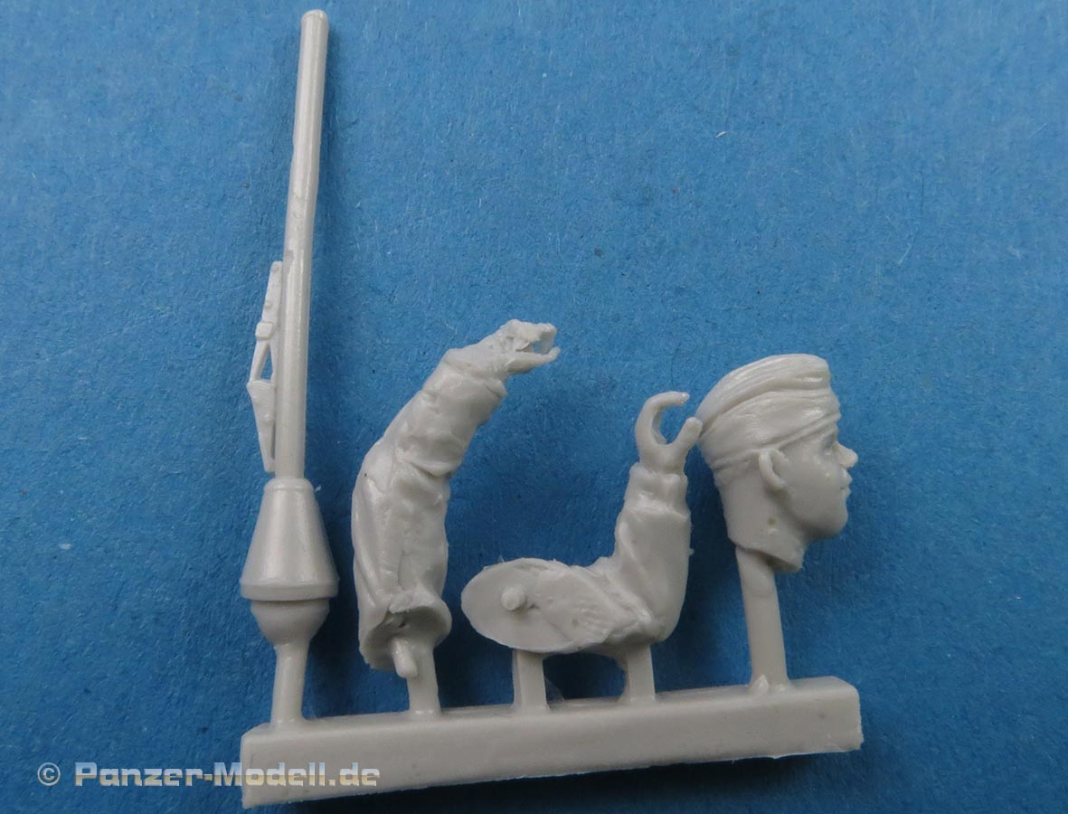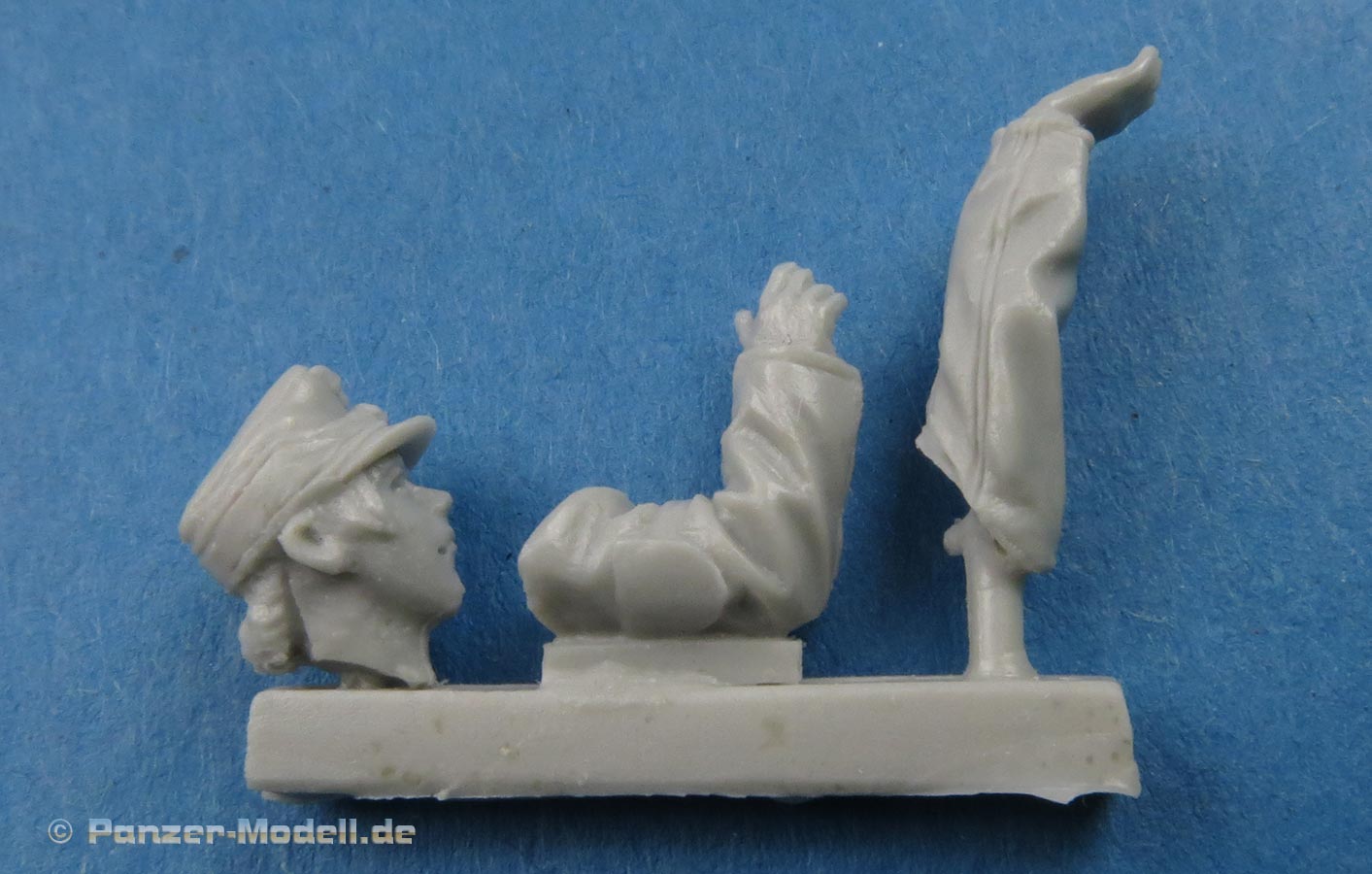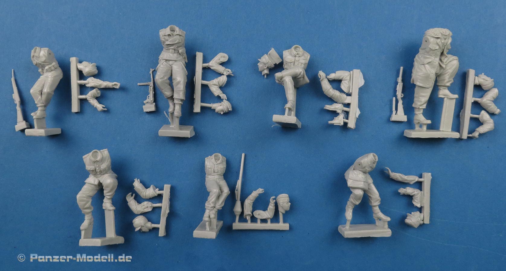 Die Figuren müssen in der Regel nur noch mit dem Kopf und beiden Armen sowie Zubehör wie Klappspaten, Taschen oder auch Waffen wie Panzerfaust, MP40, Karabiner oder auch MP18 versehen werden. Die Handwaffen sind auch sehr fein und detailliert gegossen, wobei beim sich bei dünnen Läufen auch schnell mal eine leichte Biegung feststellen lässt. In heißem Wasser sollte sich das aber wieder richten lassen.