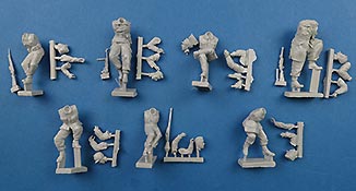 In der recht großen Schachtel finden wir 7 einzelne Tütchen die jeweils die Resinteile für die Figuren beinhalten - diese setzen sich aus jeweils 4 bis 6 Einzelteilen zusammen - diese beinhalten unter Umständen auch Waffen und Zubehör.