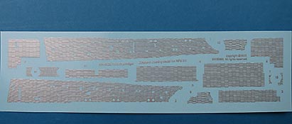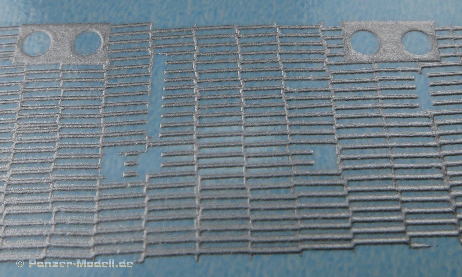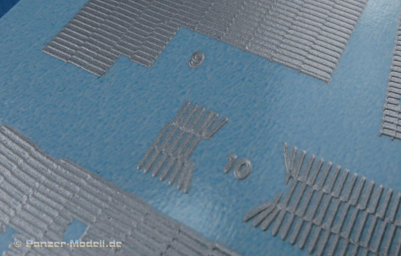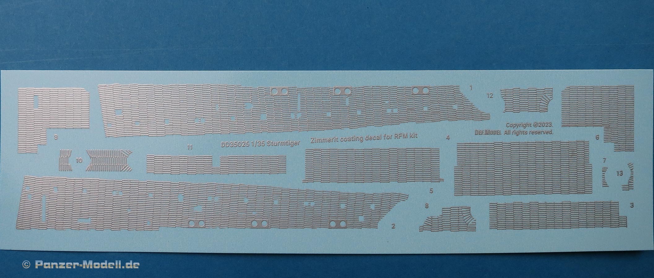 Auf dem Bogen ist das Zimmerit für die Unterwanne und dem Turm enthaltenwie von zeitgenössischen Fotos bekannt. Die Zimmeritstruktur aus Resin wurdeauf eine Decalfolie aufgebracht und kann somit wie die üblichen Decals abgelöst und auf dem Modell platziert werden.