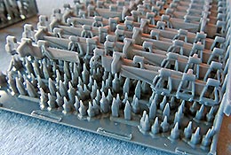 Die Kettenglieder sitzen auf 5 Druckplatten auf mehreren kleinen Stützstrukturen und sollten so leicht abzutrennen sein. Die eine Hälfte pro Druckplatte ist für die rechte Seite, die andere für die Linke - man sollte aufpassen, dass man diese beim Heraustrennen nicht vermischt.