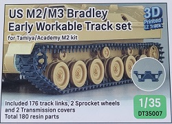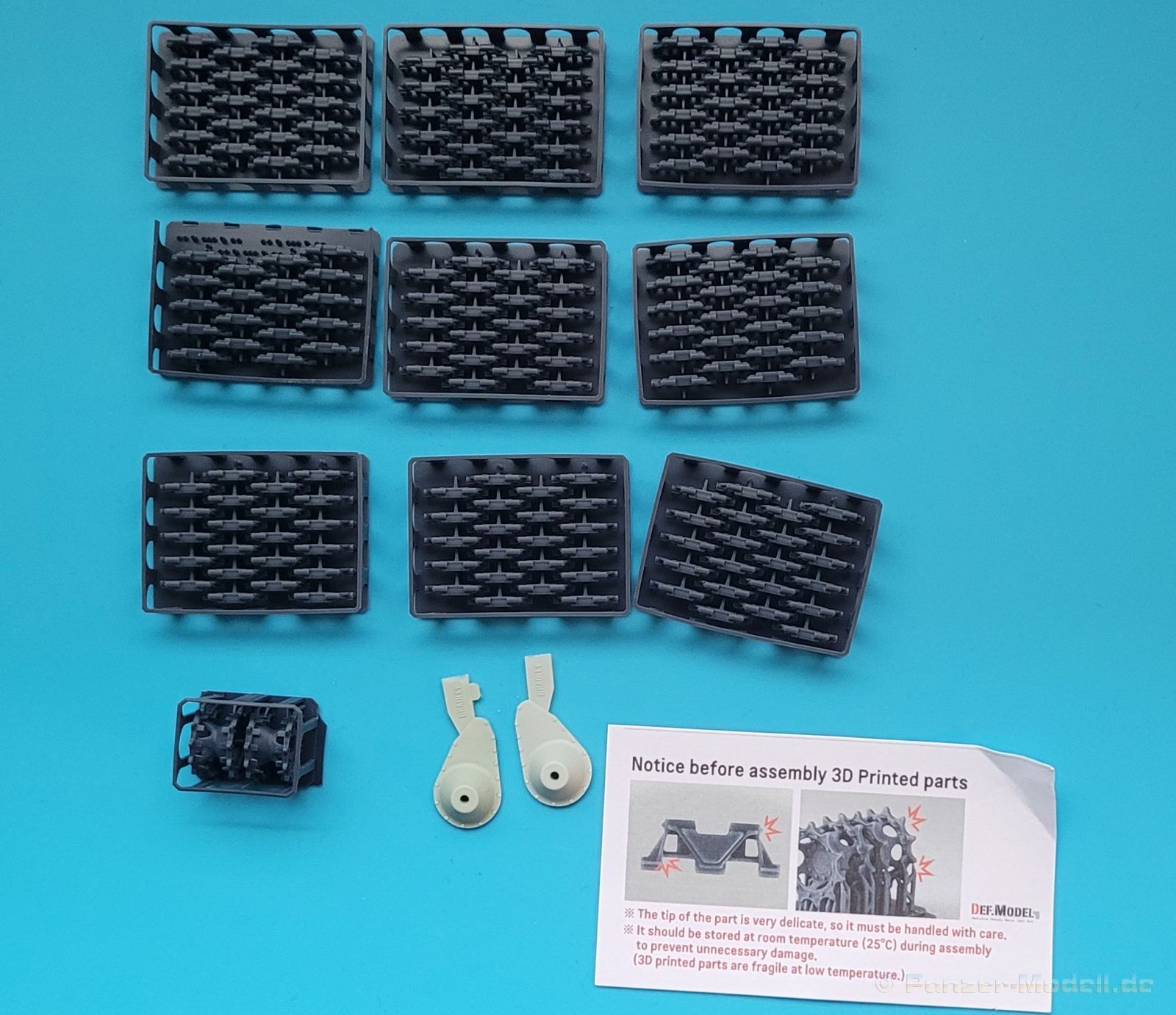 DEF Model bringt hier ein Set, um den M2/M3 Bradley der Hersteller Tamiya und Academy durch den natürlichen Kettendurchhang mehr Realismus zu verleihen. Das Set besteht aus 176 Kettengliedern und 2 Triebrädern aus 3D gedrucktem Resin sowie 2 Seitenvorgelegen aus gegossenem Resin. Zur Anwendung werden die Kettenglieder mit leichtem Druck durch Abknicken von den Supports entfernt, und können dann sehr einfach zusammengesteckt werden. Eine Bauanleitung für den Kettenbau ist vorhanden. https://www.defmodel.com/catalog/htm/dt35007.html Hier wird dann auch auf den Anbau der Seitenvorgelege und der Triebräder eingegangen. Fazit: Ein schönes Set, dass den Bausatz einfach aufwertet und durch seine Simplizität auch durch den Anfänger im Resinmodellbau verwendbar ist.