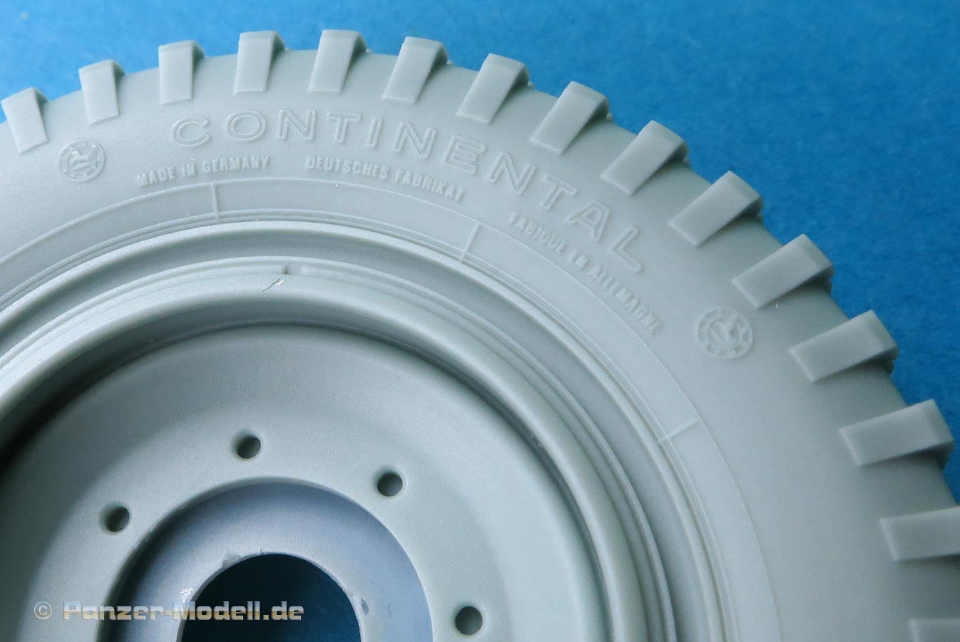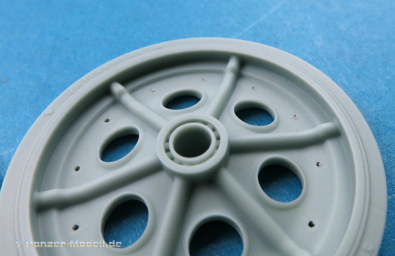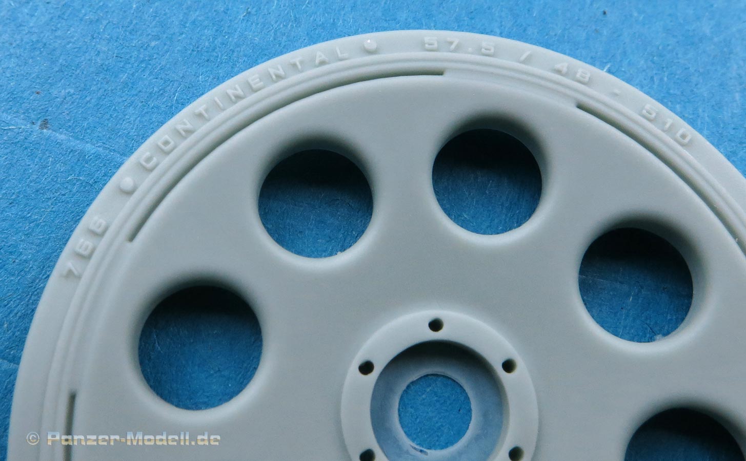 Für die Sd.Kfz.251 von Das Werk und Trumpeter gibt es nun ein passendes Set mit einem Resatzreifen und einer Ersatzlaufrolle. Das Profil ist sehr gut, fein und realistisch wiedergegeben, wobei die Details der Herstelleraufdrucke auf den Reifenflanken fein und nicht zu prägnant sind. Alles knackscharf hergestellt. und wir haben hier einen echten Continental Schriftzug und nichts was durch Buchstabenverdrehung verfälscht wurde. Wirklich großes Kino! Da es ein Ersatzreifen ist, ist er ohne Standfläche oder Belastung dargestellt. Der Anguss ist erfreulich klein, aber eben an der Standfläche, der ordentlich versäubert werden muss um das Profil wieder sauber zu haben.