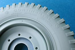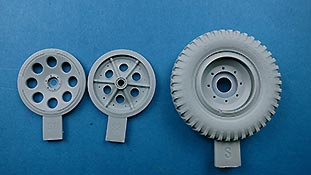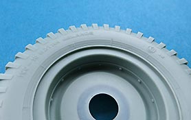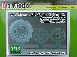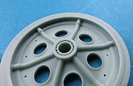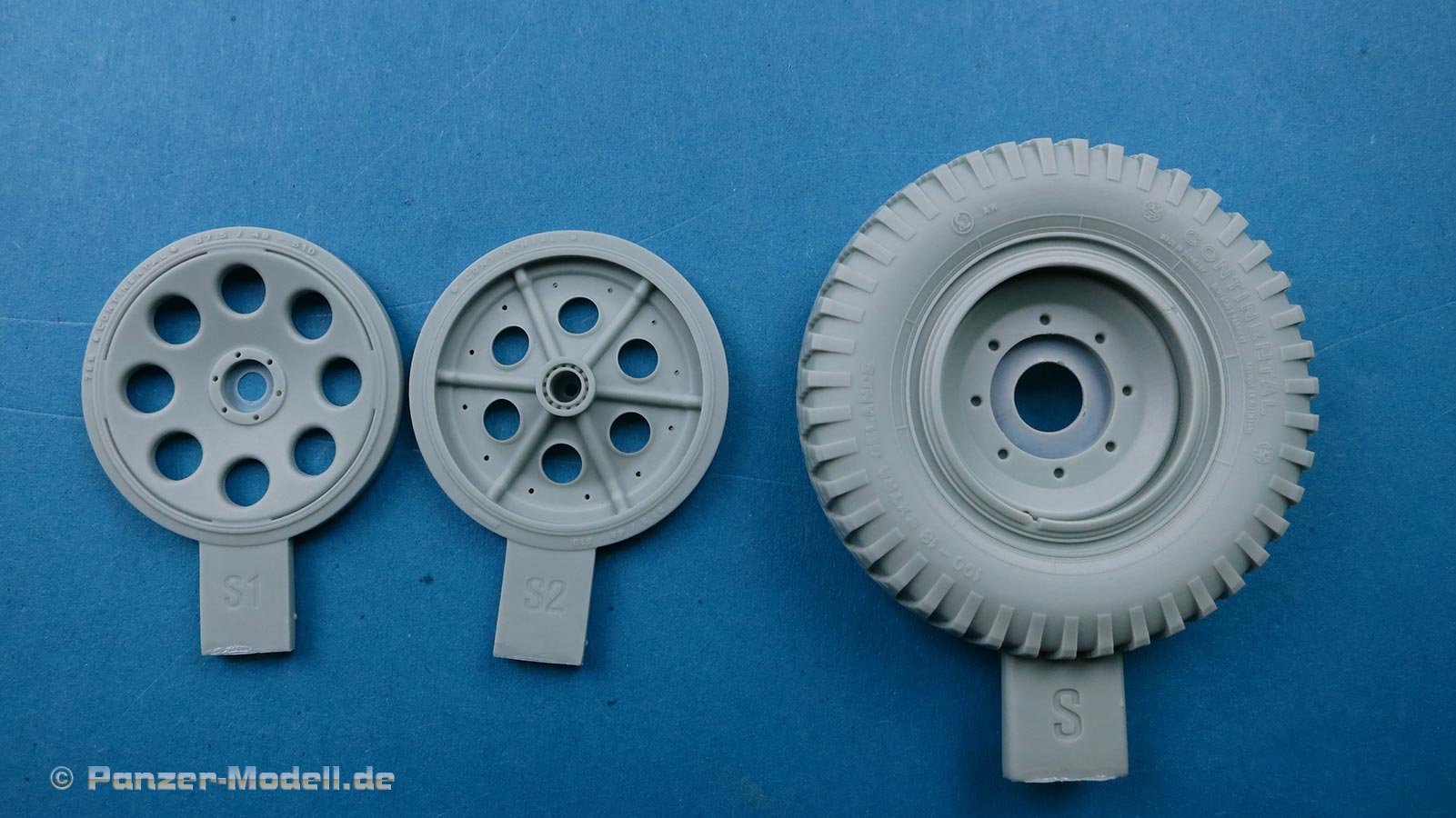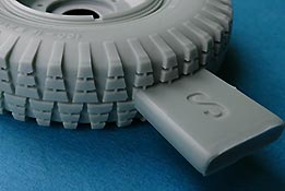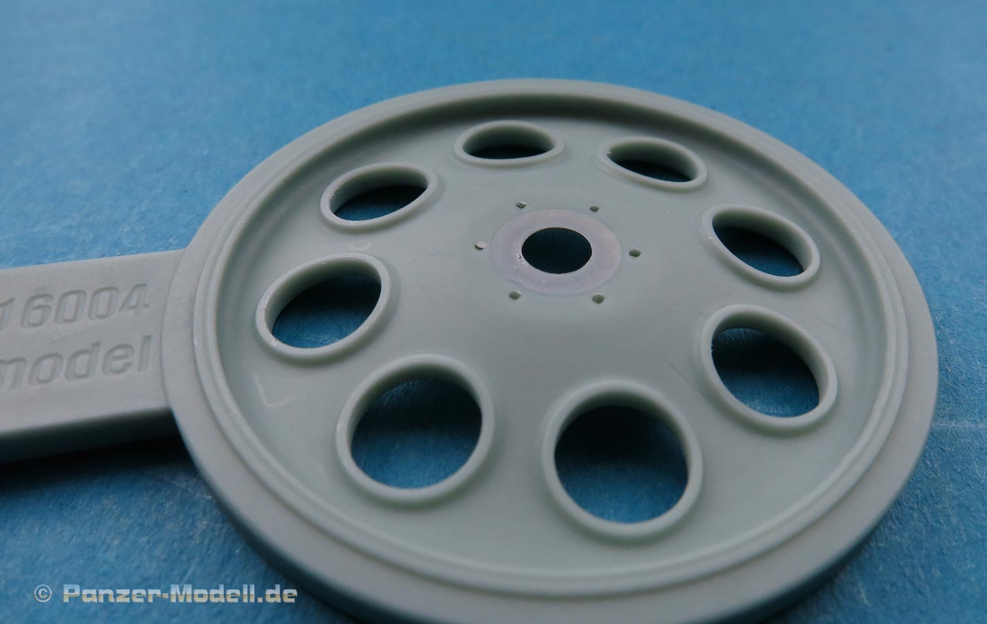 Für die Sd.Kfz.251 von Das Werk und Trumpeter gibt es nun ein passendes Set mit einem Resatzreifen und einer Ersatzlaufrolle. Das Profil ist sehr gut, fein und realistisch wiedergegeben, wobei die Details der Herstelleraufdrucke auf den Reifenflanken fein und nicht zu prägnant sind. Alles knackscharf hergestellt. und wir haben hier einen echten Continental Schriftzug und nichts was durch Buchstabenverdrehung verfälscht wurde. Wirklich großes Kino! Da es ein Ersatzreifen ist, ist er ohne Standfläche oder Belastung dargestellt. Der Anguss ist erfreulich klein, aber eben an der Standfläche, der ordentlich versäubert werden muss um das Profil wieder sauber zu haben.
