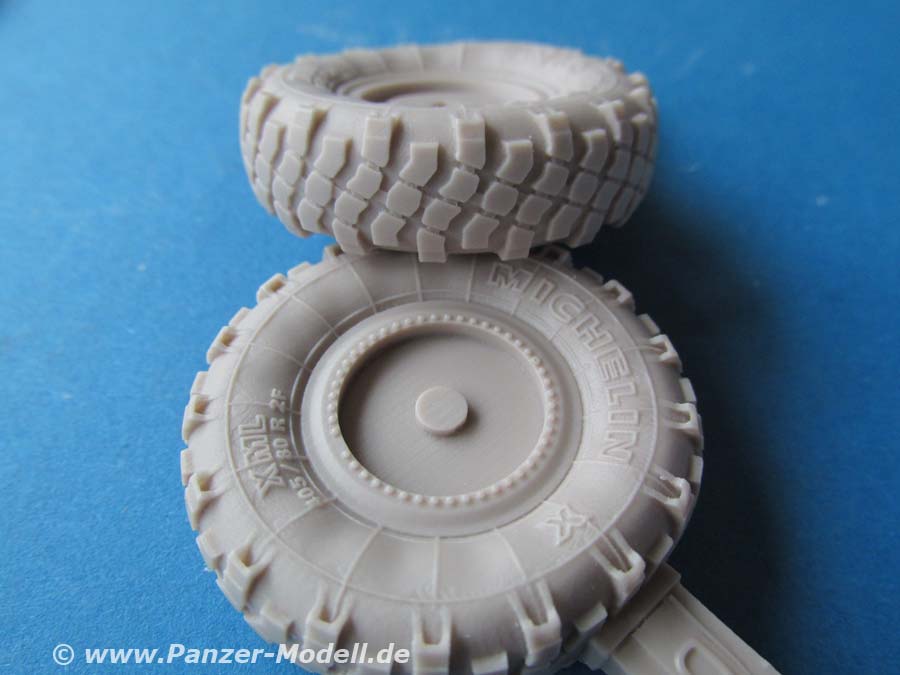 Der größte Pluspunkt ist aber, dass die Räder gewichtet modelliert sind. D.h. diese sind nicht perfekt rund, wie all die anderen Resinräder am Markt, sondern die Unterseite ist leicht abgeflacht und die untere Reifenflanke keich nach aussen gewölbt, so wie es bei den Reifen am echten Fahrzeug aussieht. Dieser Effekt ist so realistisch und subtil, dass es eine helle Freude ist. Und damit nicht genug! Def Model hat auch noch einen Schritt weitergedacht und nicht achtmal den gleichen Reifen produziert bei dem dann die Herstelleraufdrucke achtmal in exakt der gleichen Position sind, wie man es von Sets anderer Hersteller kennt - nein, hier hat man wirklich acht verschiedene Reifen die relativ zur Unterseite des Reifens den Herstelleraufdruck woanders positioniert haben! Das ist endlich mal bis zuende durchdacht.
