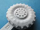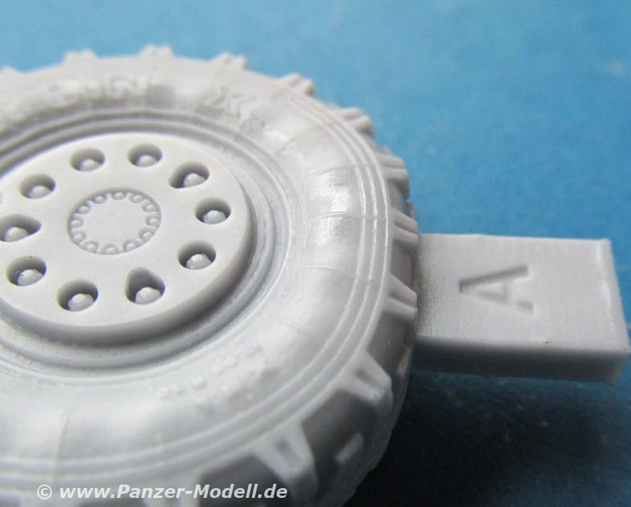 D.h. diese sind nicht perfekt rund, wie bei fast allen anderen Resinräder am Markt, sondern die Unterseite ist leicht abgeflacht und die untere Reifenflanke nach aussen gewölbt, so wie es bei den Reifen am echten Fahrzeug aussieht. Dieser Effekt ist so realistisch, dass es eine helle Freude ist. Die Felgen sind schön und sauber und vor allem mit den richtigen Details, wie der Abdeckung und den darunter liegenden Felgenmuttern versehen.