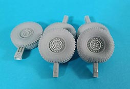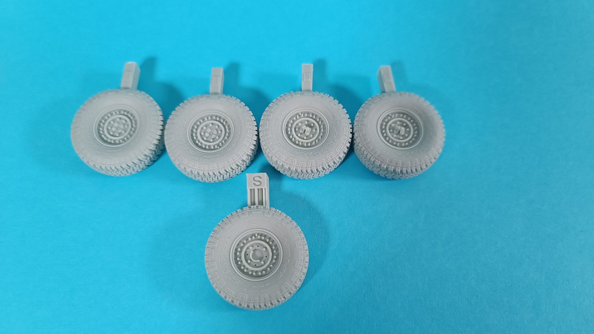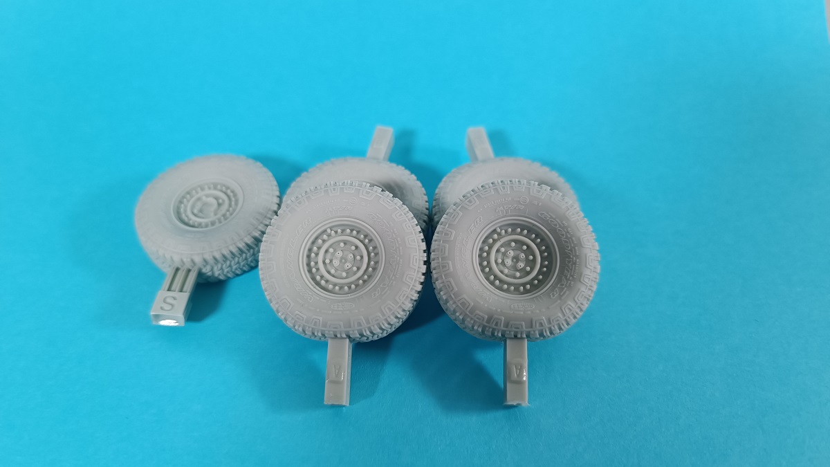 Die Gussqualität ist absolut hervorragend und die kleinen Angüsse befinden sich an der Unterseite der Räder. So ist nach dem Entfernen und Verschleifen der Angüsse am fertigen Modell nichts mehr davon zu sehen. Die Räder sind so gestaltet, dass sie auf der Unterseite eine leichte Abflachung aufweisen, mit der das Gewicht des Fahrzeuges und somit die Belastung der Räder dargestellt wird. An den Reifenflanken befinden sich die Schriftzüge mit Angaben zum Hersteller und Reifengröße. Diese sind so fein dargestellt, dass sie eindeutig lesbar, aber dennoch relativ unauffällig sind. Eben genau so wie man es an einem echten Reifen sieht, wenn man sich den aus etwa einem Meter Entfernung betrachtet. Ein tolles Set mit dem das gebaute Modell deutlich aufgewertet wird.