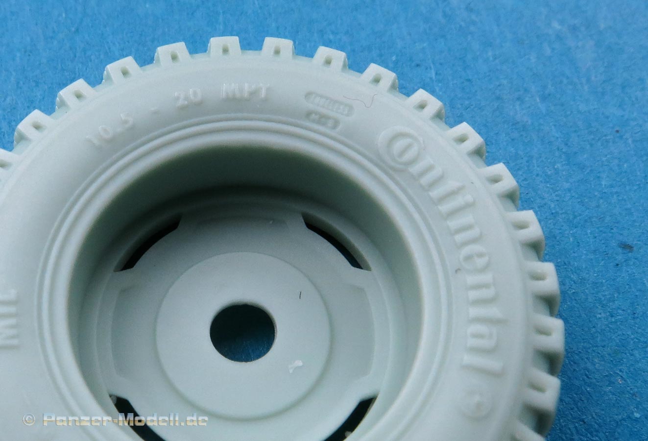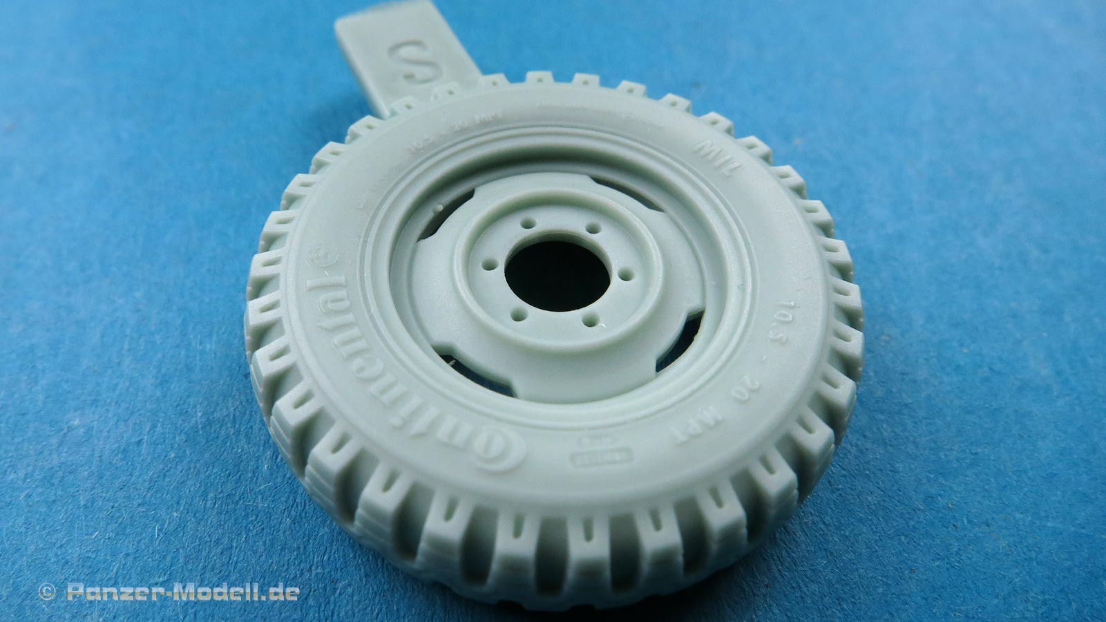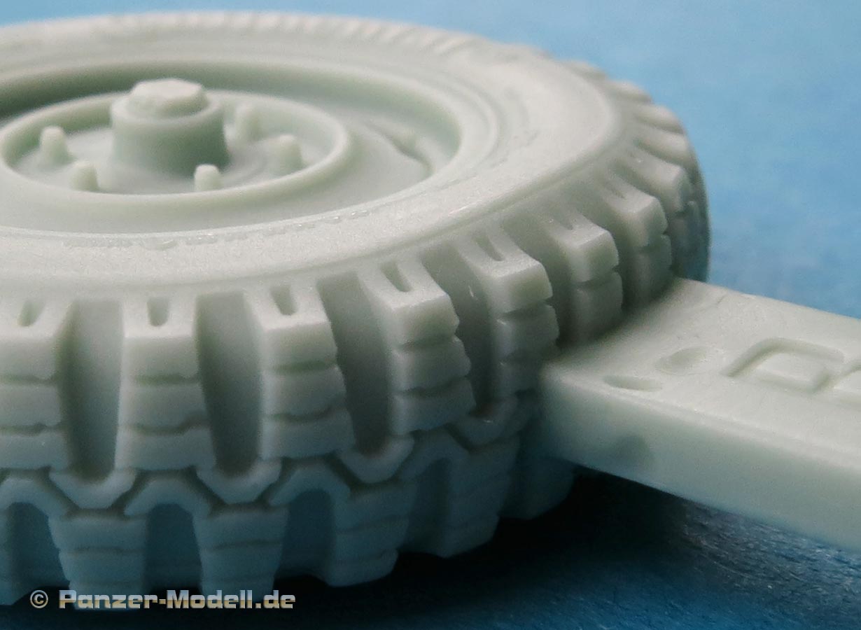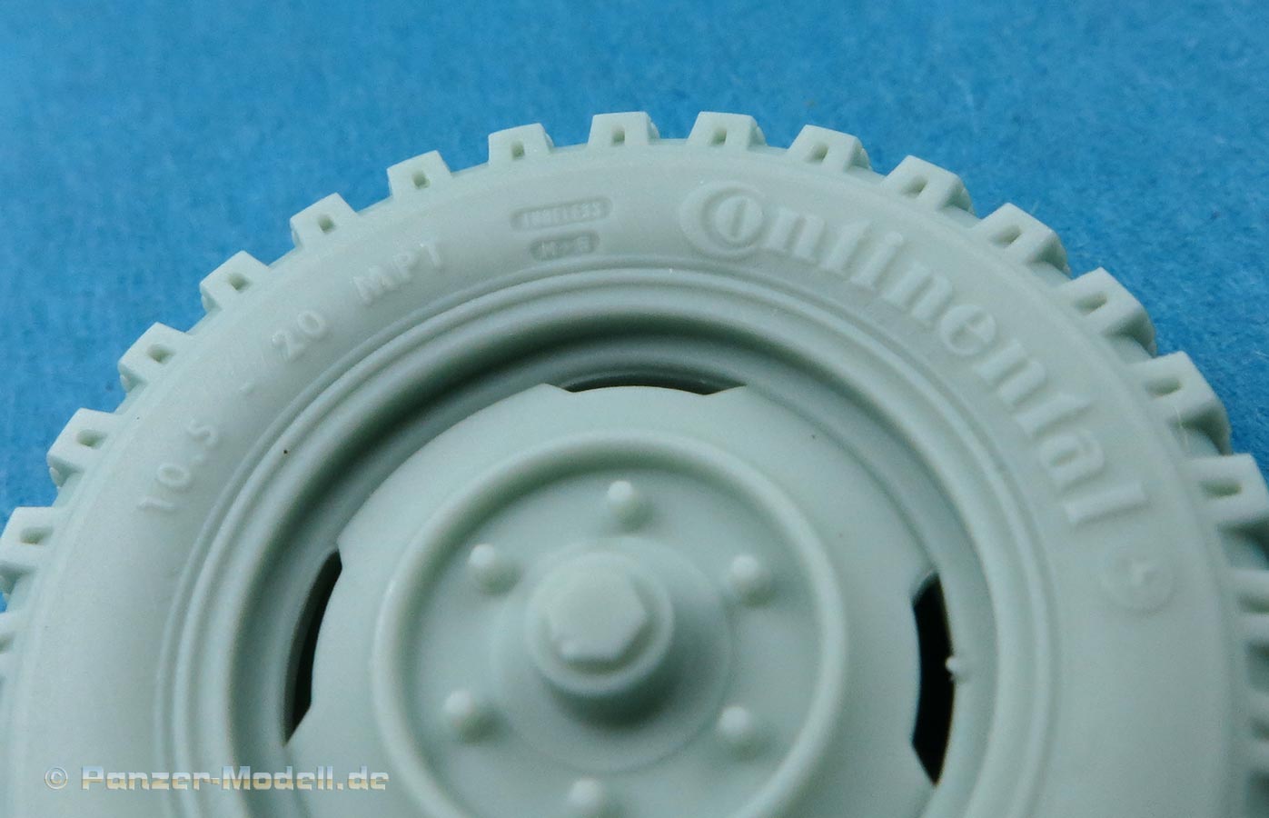 DEF Model bringt hier ein einfaches Räder-Set, um den Unimog S404 Bausätzen von ICM (und sukzessive die Bausätze von Revell und AK) mit schönen, korrekten und belasteten Reifen darzustellen. Das Set besteht aus fünf aus Resin gegossenen Reifen (vier Laufreifen und ein Ersatzrad) mit wirklich großartig gemachtem Profil und einer Abflachung mit Wölbung an der Reifenflanke zur Darstellung belasteter Reifen. Dazu zwei 3D Druckteile um an den Felgen der Vorderräder die markanten Aufstiegshilfen separat anzubringen. An den Reifenflanken befinden sich Herstelleraufdrucke von Continental mit den Details der Reifengrößen 10.5 - 20 MPT. Die Aufdrucke sind falch und sehr fein dteailliert, sodass diese sehr realistisch wirken. Zusätzlich finden sich im Set noch passende Lackiermasken, um die Reifen bei der Lackierung entsprechend abdecken zu können.