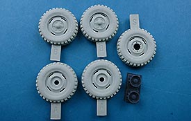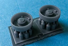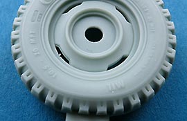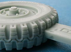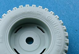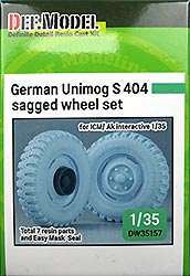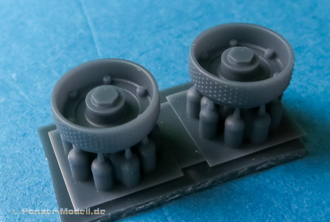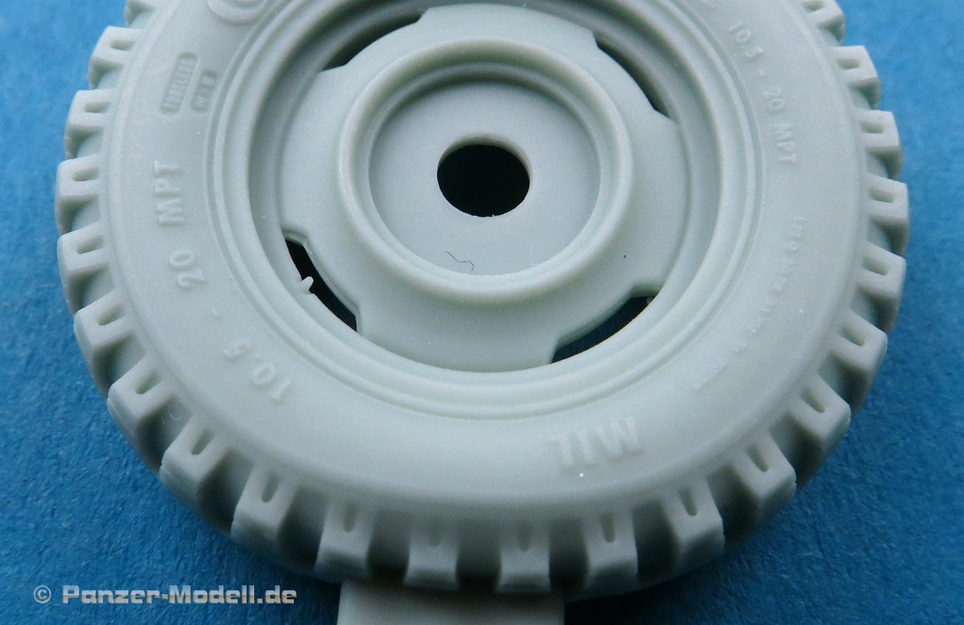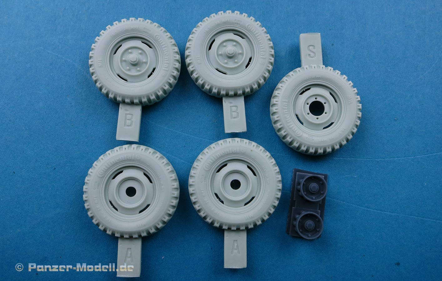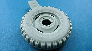 DEF Model bringt hier ein einfaches Räder-Set, um den Unimog S404 Bausätzen von ICM (und sukzessive die Bausätze von Revell und AK) mit schönen, korrekten und belasteten Reifen darzustellen. Das Set besteht aus fünf aus Resin gegossenen Reifen (vier Laufreifen und ein Ersatzrad) mit wirklich großartig gemachtem Profil und einer Abflachung mit Wölbung an der Reifenflanke zur Darstellung belasteter Reifen. Dazu zwei 3D Druckteile um an den Felgen der Vorderräder die markanten Aufstiegshilfen separat anzubringen. An den Reifenflanken befinden sich Herstelleraufdrucke von Continental mit den Details der Reifengrößen 10.5 - 20 MPT. Die Aufdrucke sind falch und sehr fein dteailliert, sodass diese sehr realistisch wirken. Zusätzlich finden sich im Set noch passende Lackiermasken, um die Reifen bei der Lackierung entsprechend abdecken zu können.