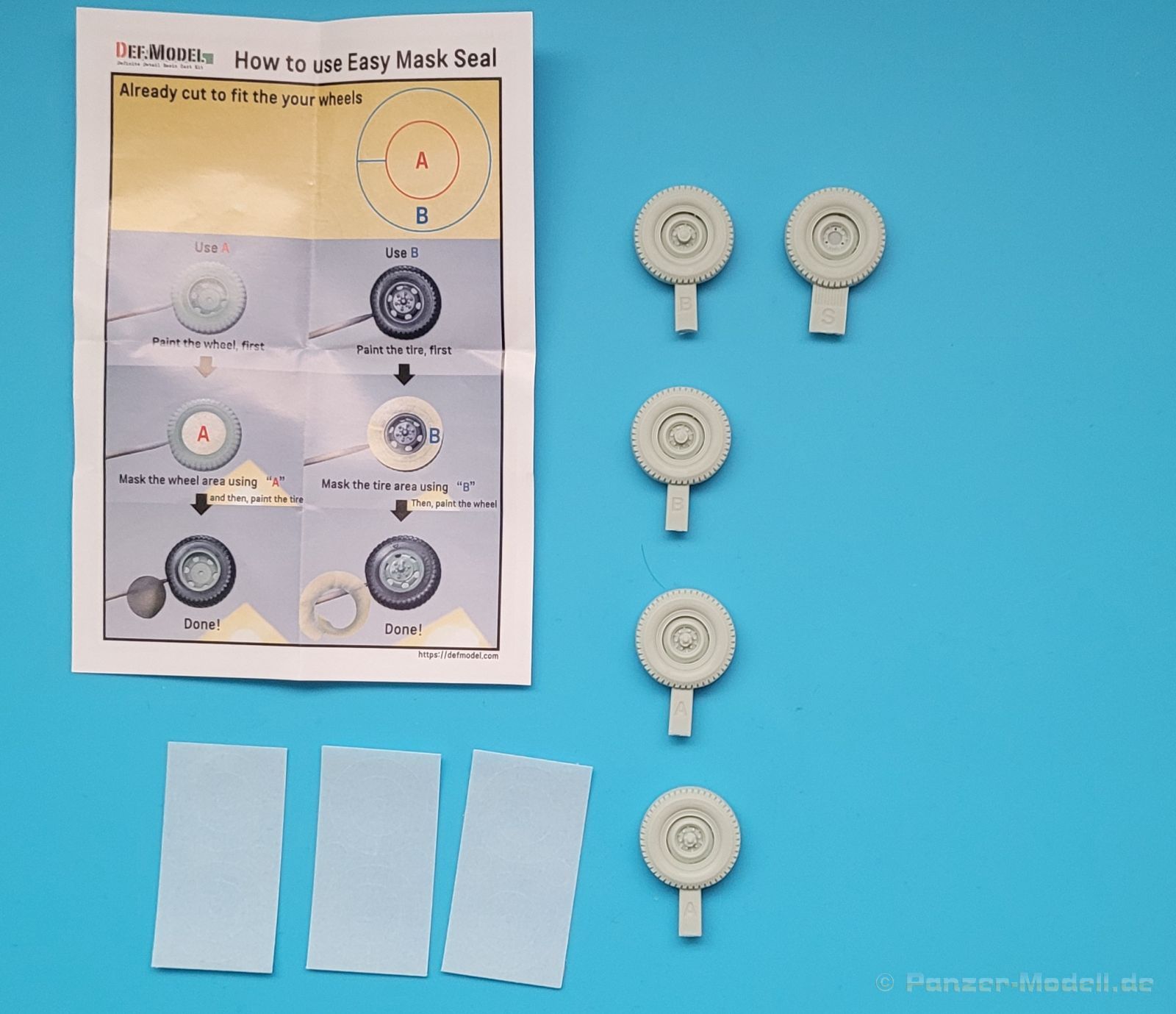 DEF Model bringt hier ein einfaches Set, um den FJ43 Bausätzen von AK Interactive (AK-35001, AK-35002, AK-35003 und AK35004) etwas mehr Realismus zu verleihen. Das Set besteht aus fünf aus Resin gegossenen Reifen (vier Laufreifen und ein Ersatzrad) mit wirklich großartig gemachtem Profil und einer Abflachung mit Wölbung an der Reifenflanke zur Darstellung belasteter Reifen. An den Reifenflanken befinden sich Herstelleraufdrucke von Bridgestone. Zum Abtrennen der Resinangüsse empfiehlt sich eine gute Resin / Plastiksäge. Zusätzlich finden sich im Set noch passende Lackiermasken, um die Reifen bei der Lackierung entsprechend abdecken zu können. Eine Bauanleitung ist vorhanden, jedoch kann der Modellbauer auf die Hinweise auf der Seite des Herstellers den Anweisungen folgen: https://www.defmodel.com/catalog/htm/dw35159.html Fazit: Ein schönes Set, dass den Bausatz einfach aufwertet und durch seine Simplizität auch durch den Anfänger im Resinmodellbau verwendbar ist.