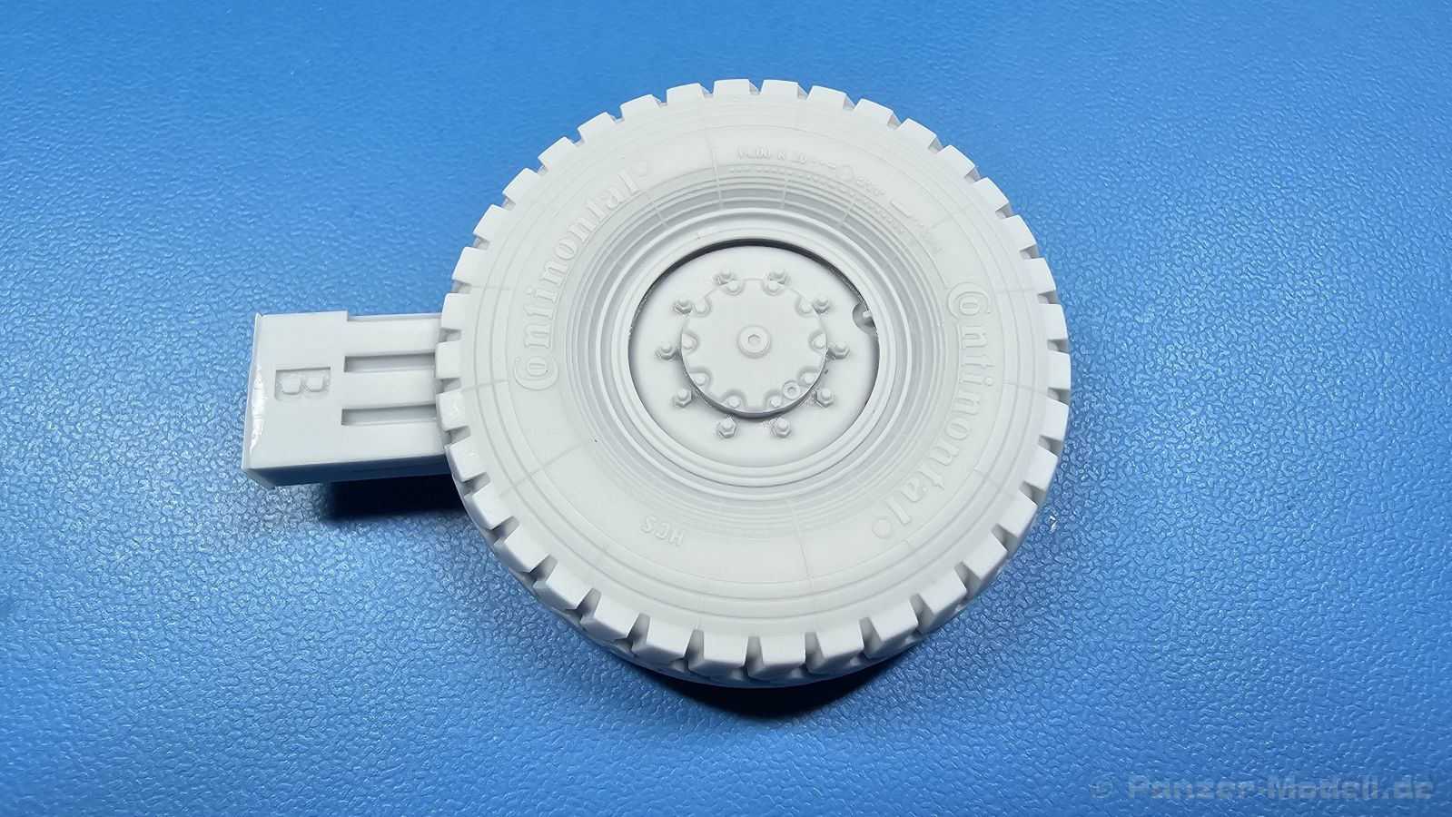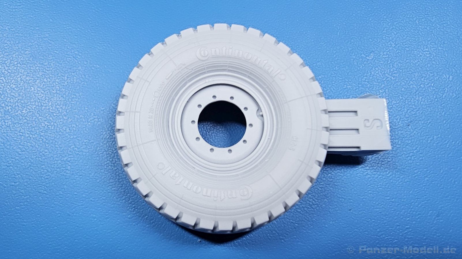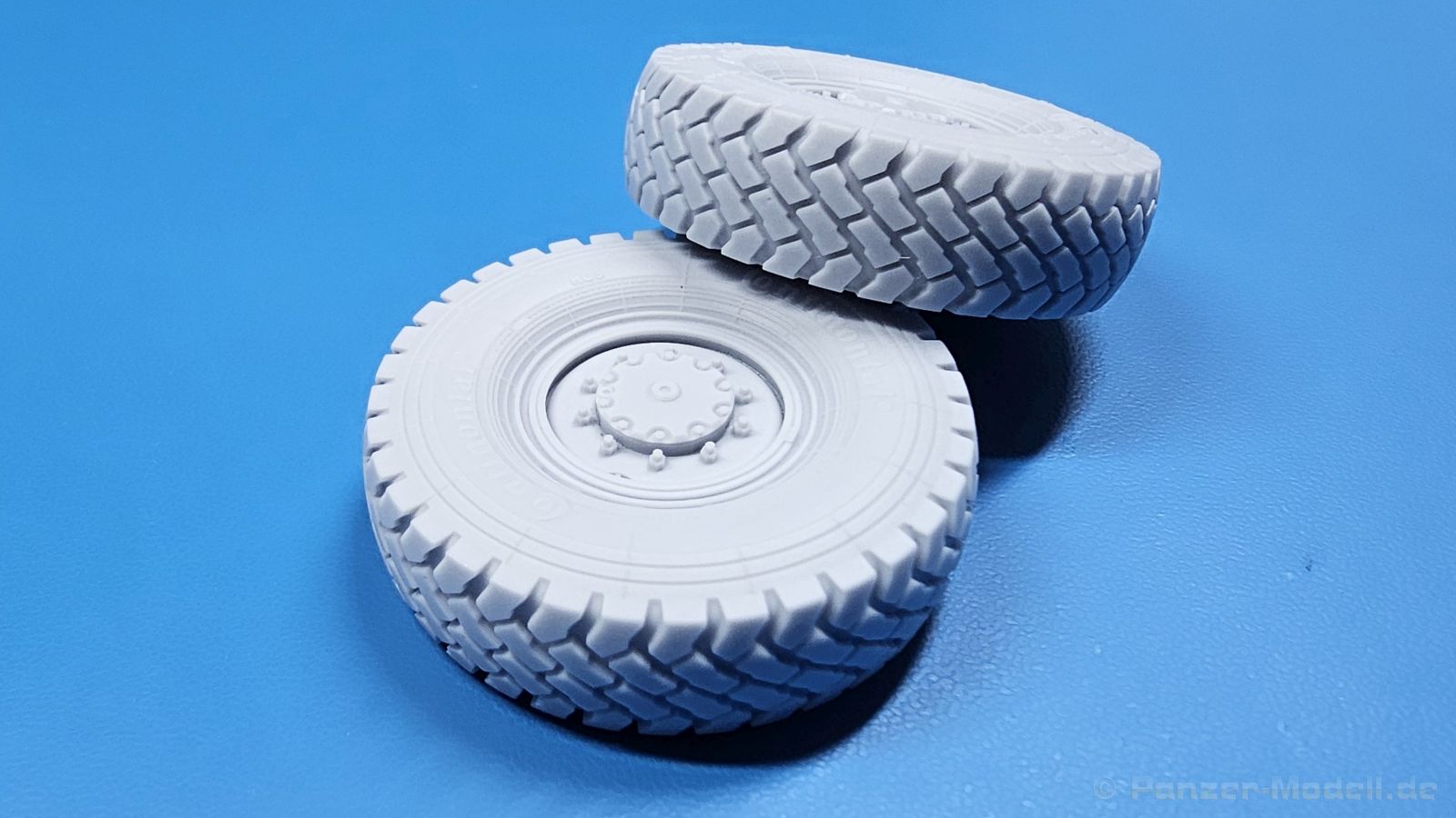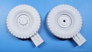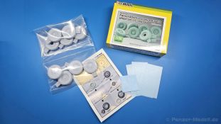 Wer den Trumpeter Bausatz 01088 Patriot Abschussrampe auf 15t mil gl Br A1 sein Eigen nennt und nicht das Risiko eingehen möchte, ob die Gummireifen spröde werden und reißen, der hat nun die Alternative, die Gummireifen durch Resin-Reifen von DEF.Model zu ersetzen. Im 140 x 110 x 40 mm großen Karton enthalten sind 9 Resinteile (8 Räder und 1 Ersatzrad) und ein Blatt mit Klebemasken. Natürlich hat DEF Model auch diesem Set gleich noch passende Lackierschablonen und eine Anleitung dazu beigelegt. Die Lackierschablonen sind selbstklebend und zweiteilig, sodass man sich entscheiden kann, ob man das Rad erst komplett Gummifarben lackiert und dann das Reifengummi abklebt für die Felgenlackierung oder andersrum. Wieder ein hervorragendes Set, das man gut empfehlen kann. Zudem nimmt es einem die Befürchtung, irgendwann ein Modell mit gerissenen Reifen in der Vitrine stehen zu haben. In Deutschland liegt der Preis bei rund 32,- Euro.
